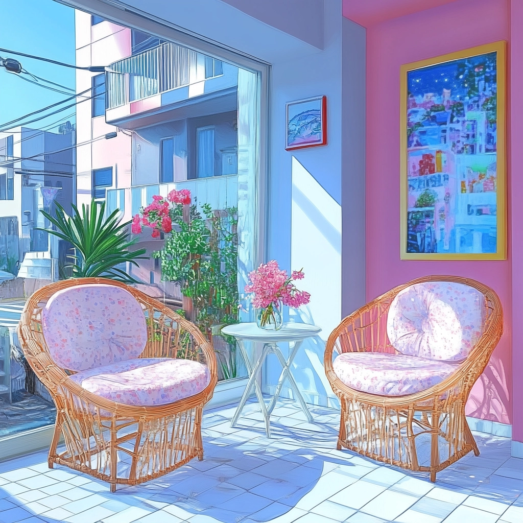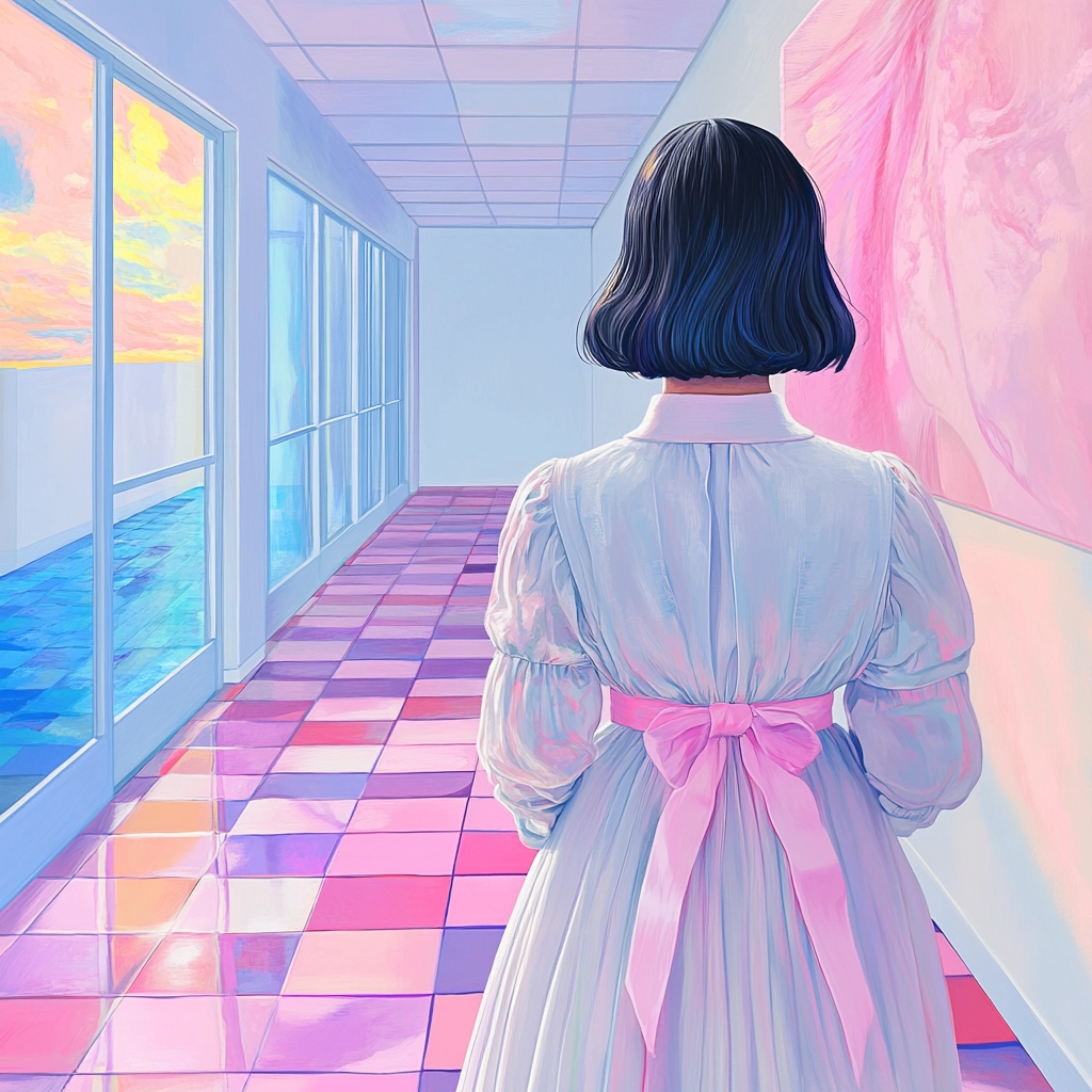 The lighting is soft and diffused, enhancing the pastel color palette. The spatial sense is open and airy, with clearly defined lines and a smooth surface texture. Gentle color gradients create subtle depth and dimension throughout the composition.