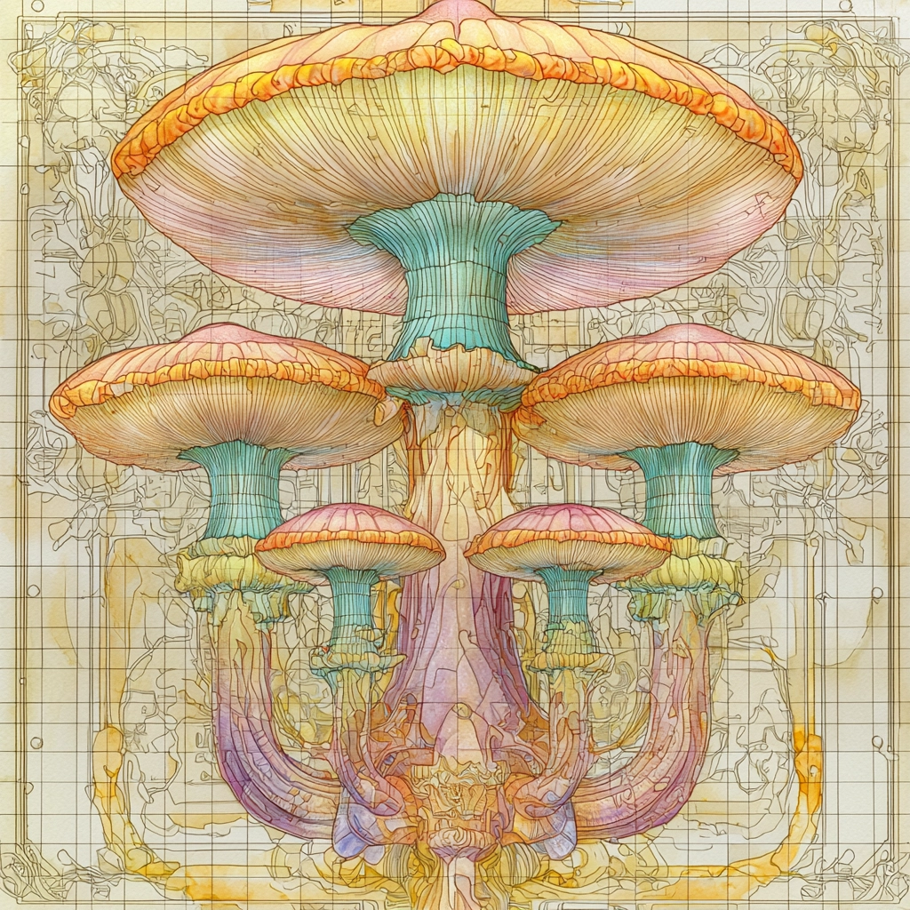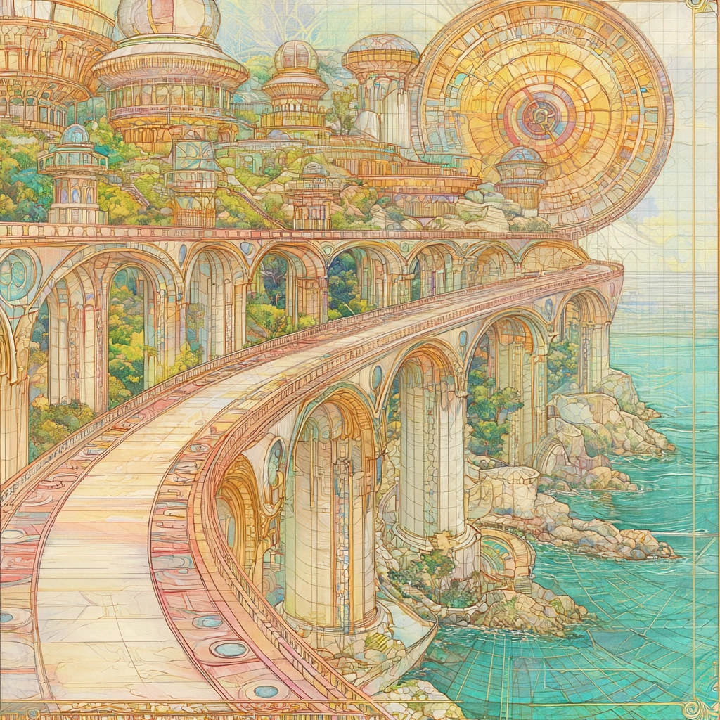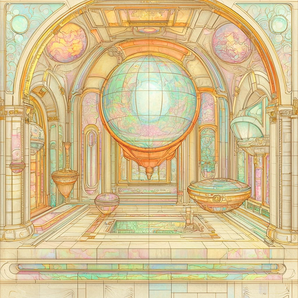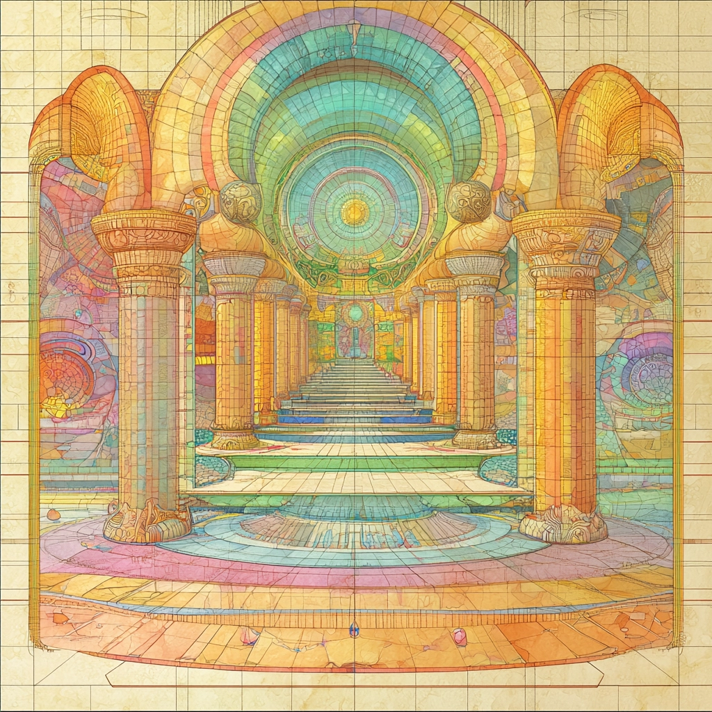 The lighting effects are soft, casting gentle shadows across the detailed and complex architectural forms. The pastel colors blend harmoniously, with a consistent brightness that paints an inviting spatial sense. The texture appears smooth, enhancing the delicate feel of the image.