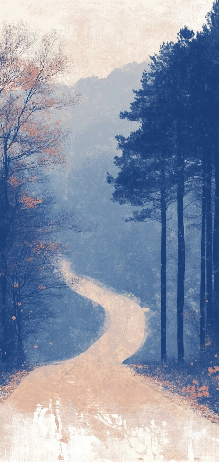 The lighting is diffuse, creating a soft glow across the scenes. The blue tones dominate with subtle peach accents providing warmth, while the white highlights enhance the textures. The depth is conveyed through receding pathways, drawing the viewer inward.