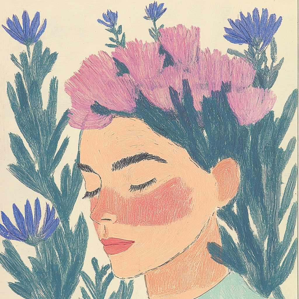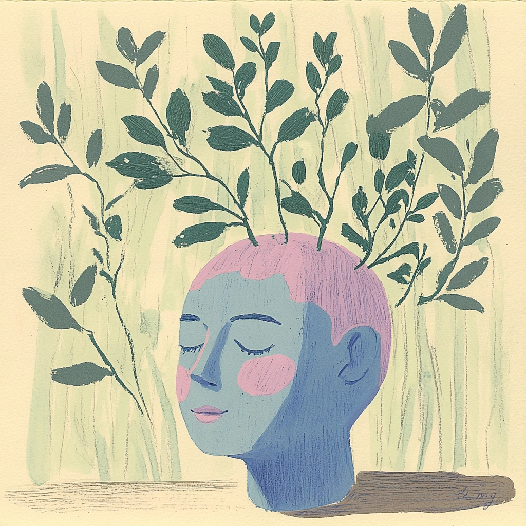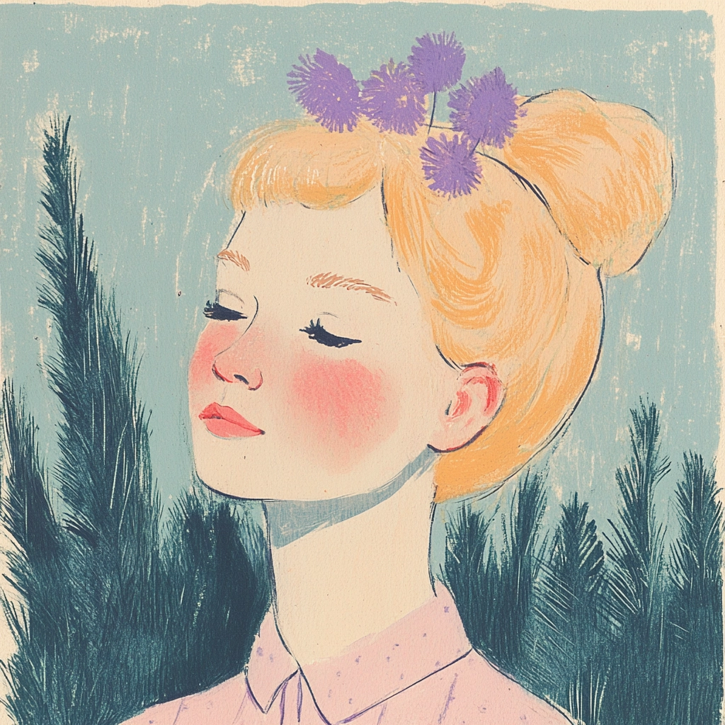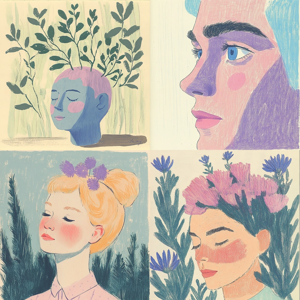Lighting is gentle and diffused, creating a soft atmosphere while pastel colors enhance the visual softness. Spatial arrangement is orderly with botanical forms complementing the smooth textures, resulting in a serene visual presentation.