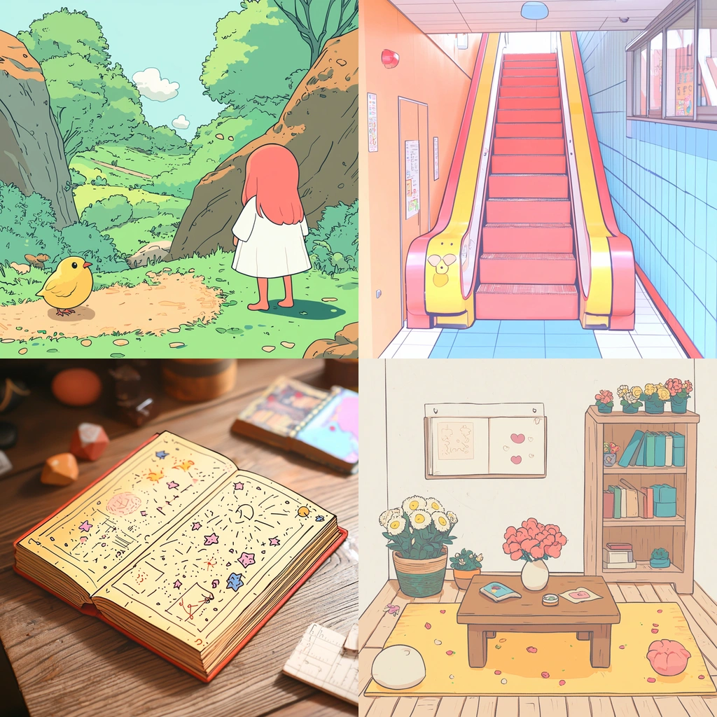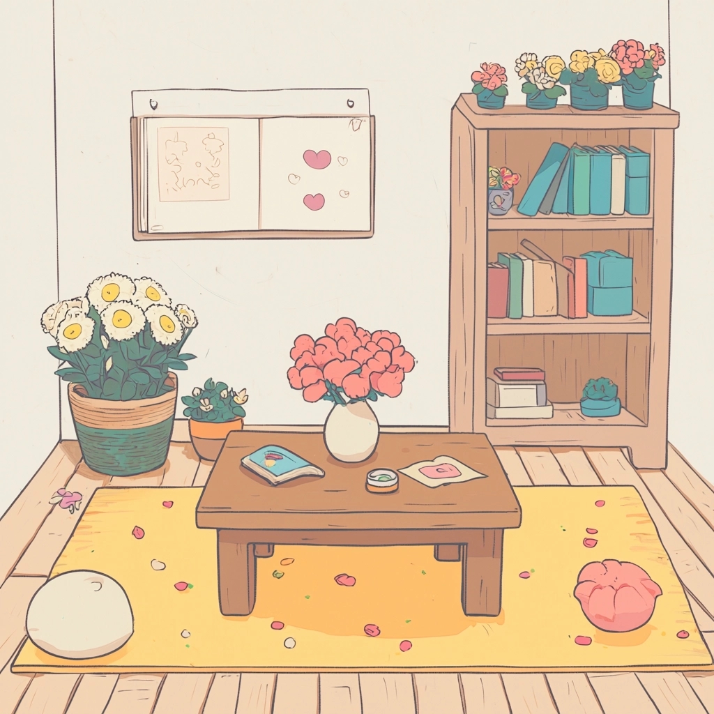 The lighting is soft with a focus on diffused ambient light, while the colors are light and pastel, creating a sense of warmth. The textures are smooth with minimal shading, and the spatial layout is simple and clear.
