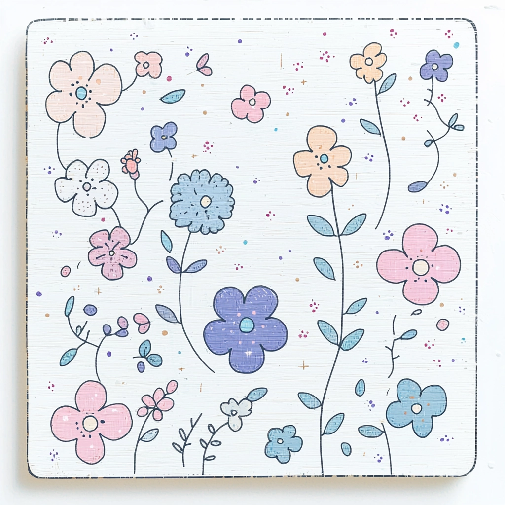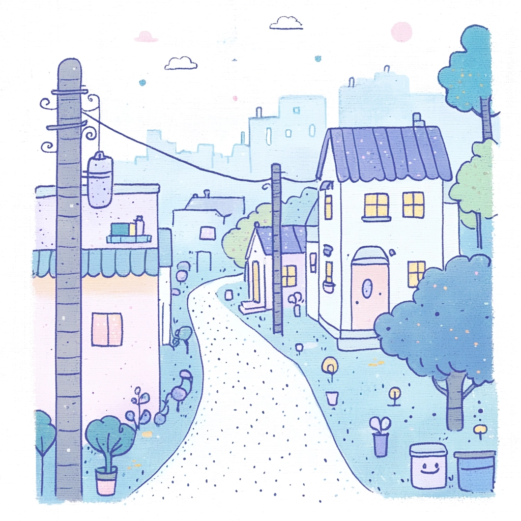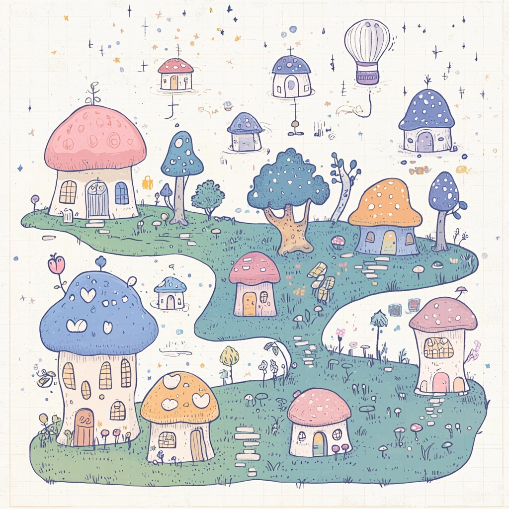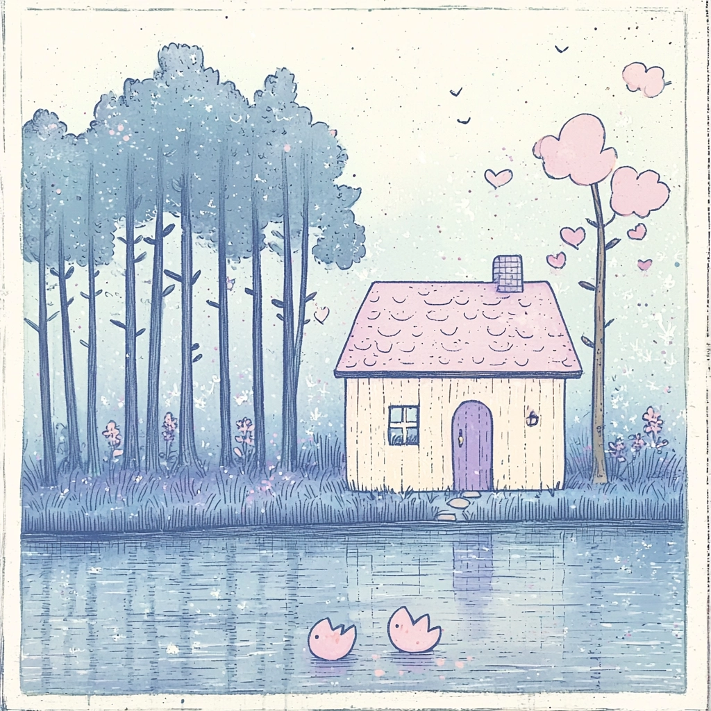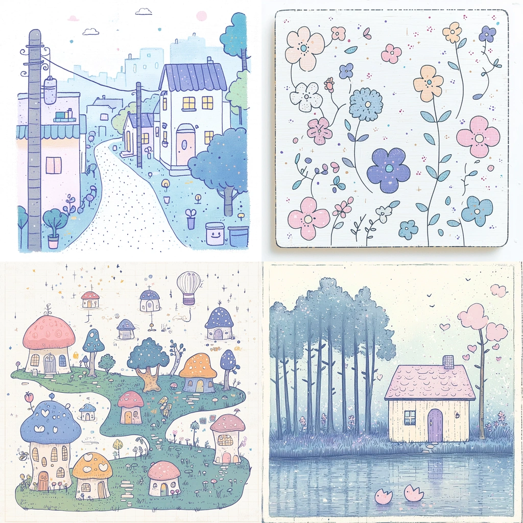 Soft lighting complements the gentle pastel colors, giving a spacious, inviting feel. The texture is smooth with subtle line details, adding a doodle-like charm to the visual scenes.