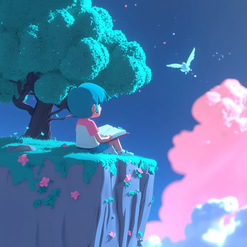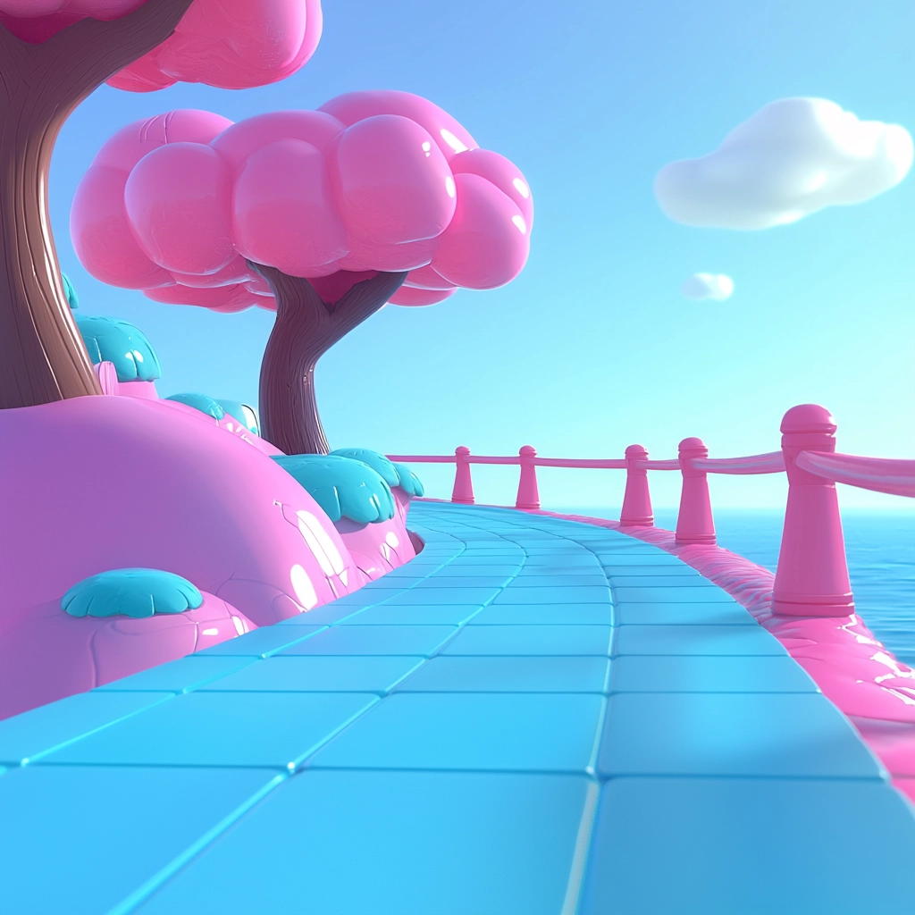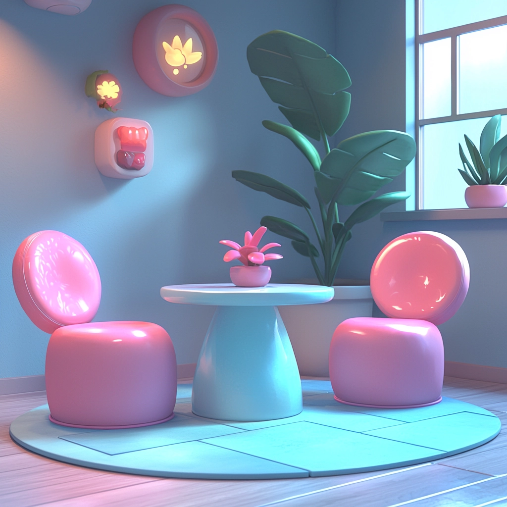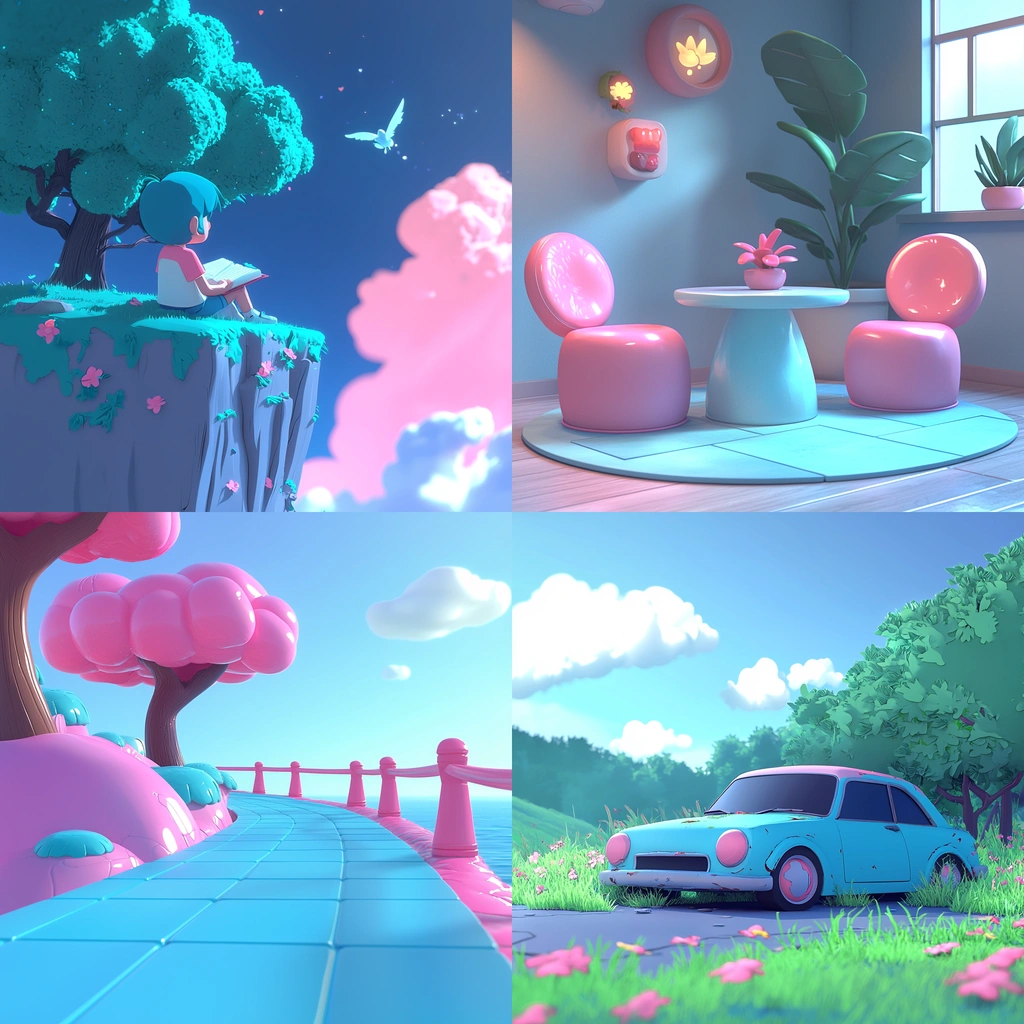 Soft lighting enhances the pastel color palette, creating an inviting spatial depth. Smooth textures evoke a sense of childlike simplicity, while balanced compositions guide the viewer through each scene.