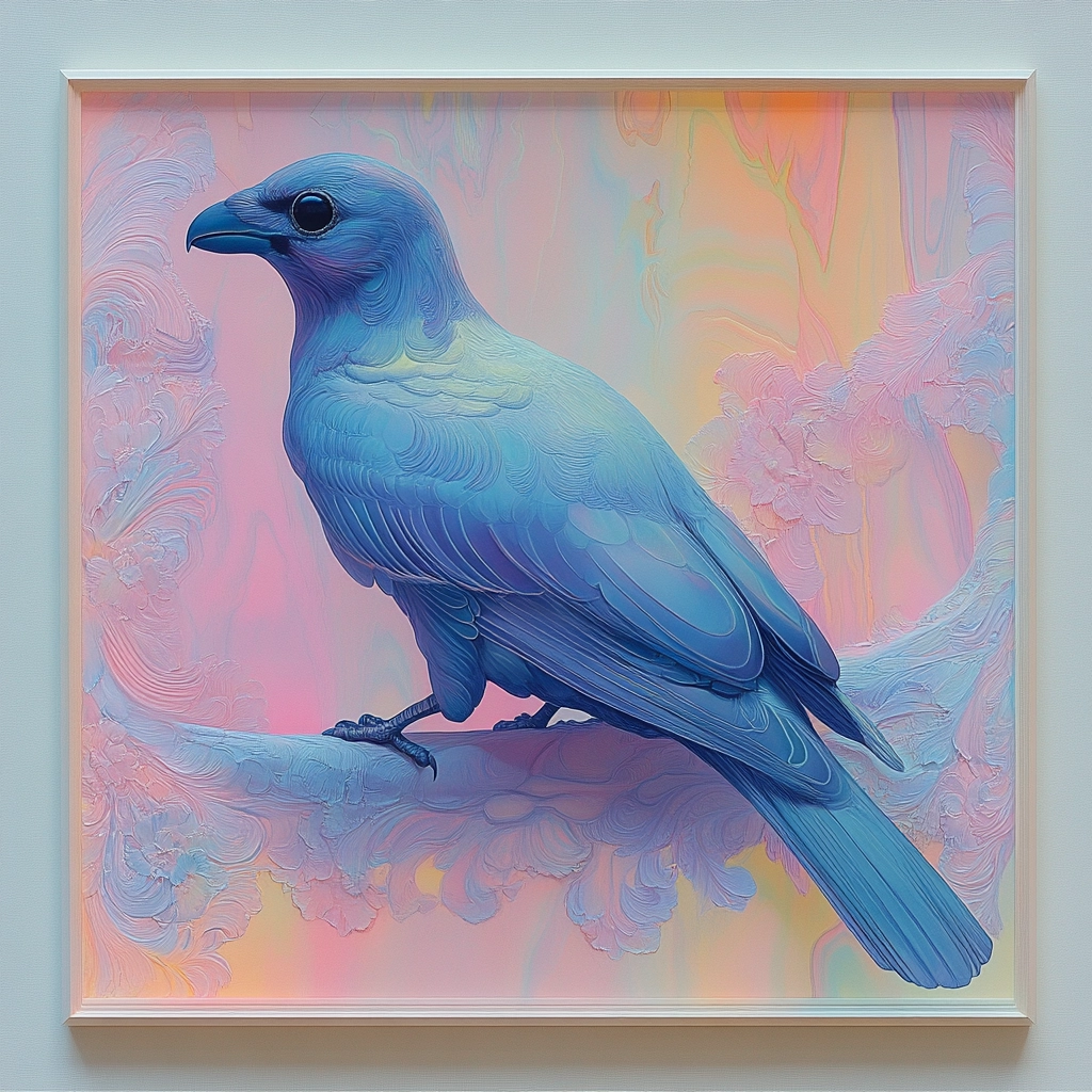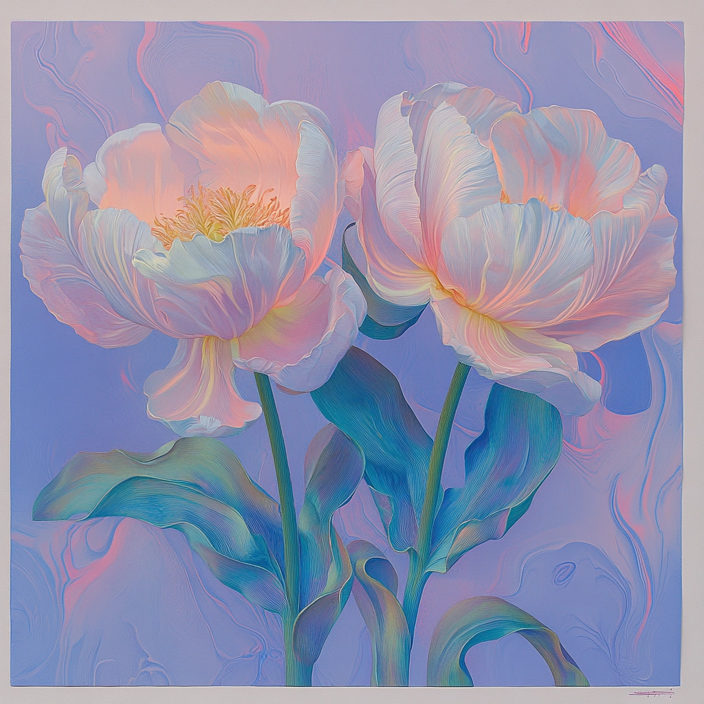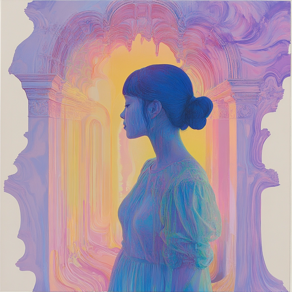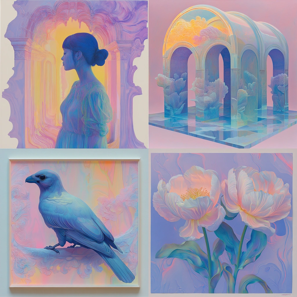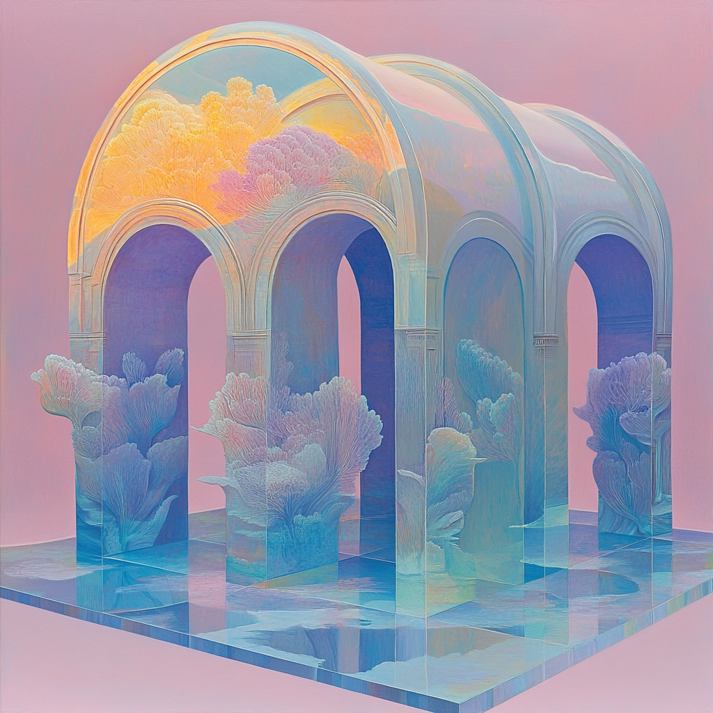 Lighting produces a soft glow that highlights smooth gradients of pastel hues, creating depth through subtle shadows and intricate textures with a sense of intimacy in spatial arrangement.