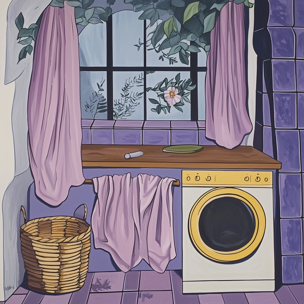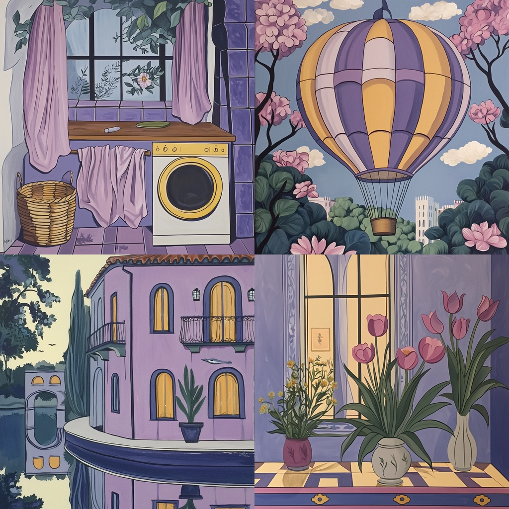 The lighting is gentle, creating a soft and inviting atmosphere with subtle gradations. Colors are pastel, with an emphasis on purple further complemented by yellow and green. Space feels open and calm, while textures are smooth with a clean finish.