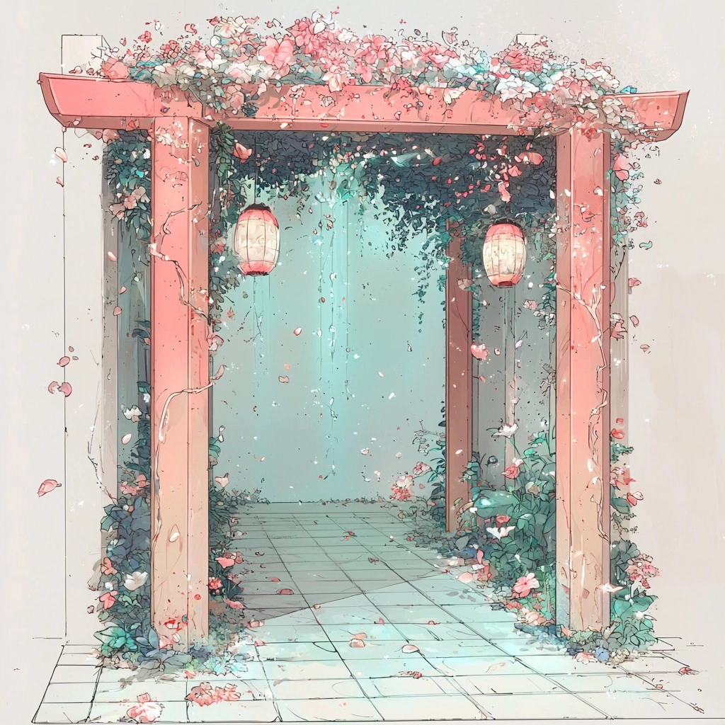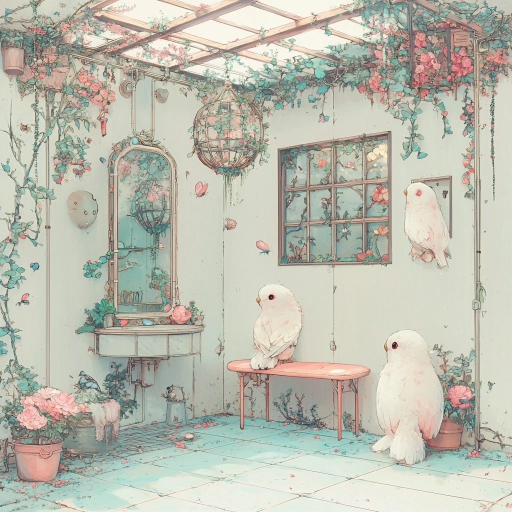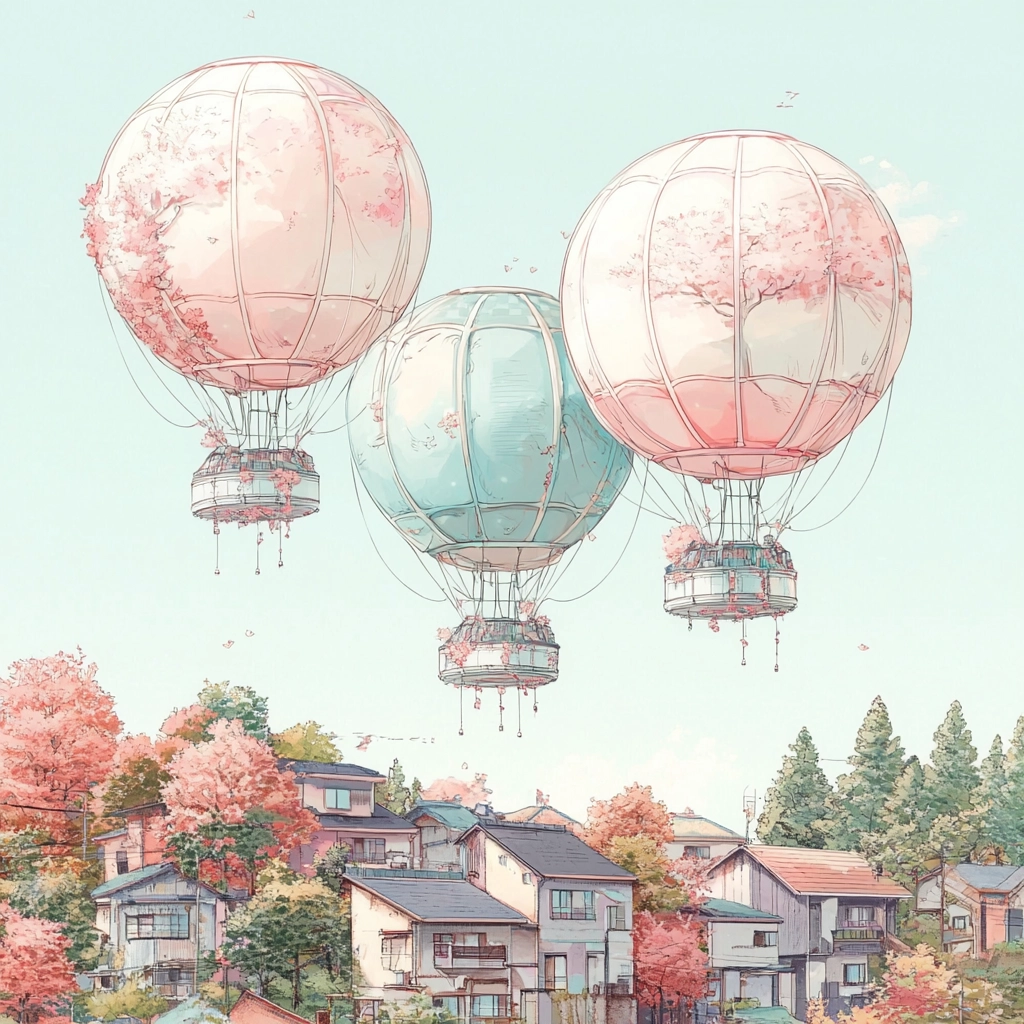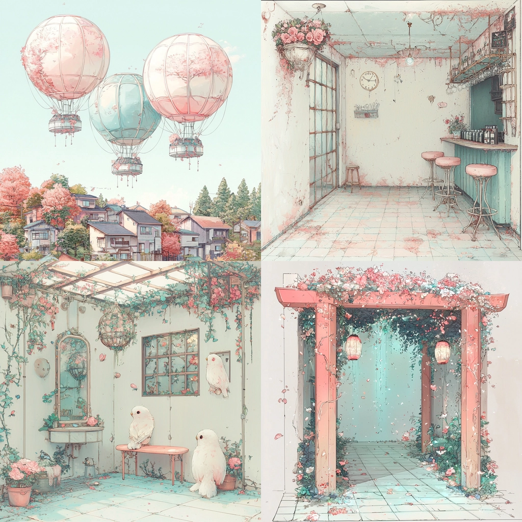 Soft pastel colors harmonize with delicate line work creating a light, airy aesthetic.