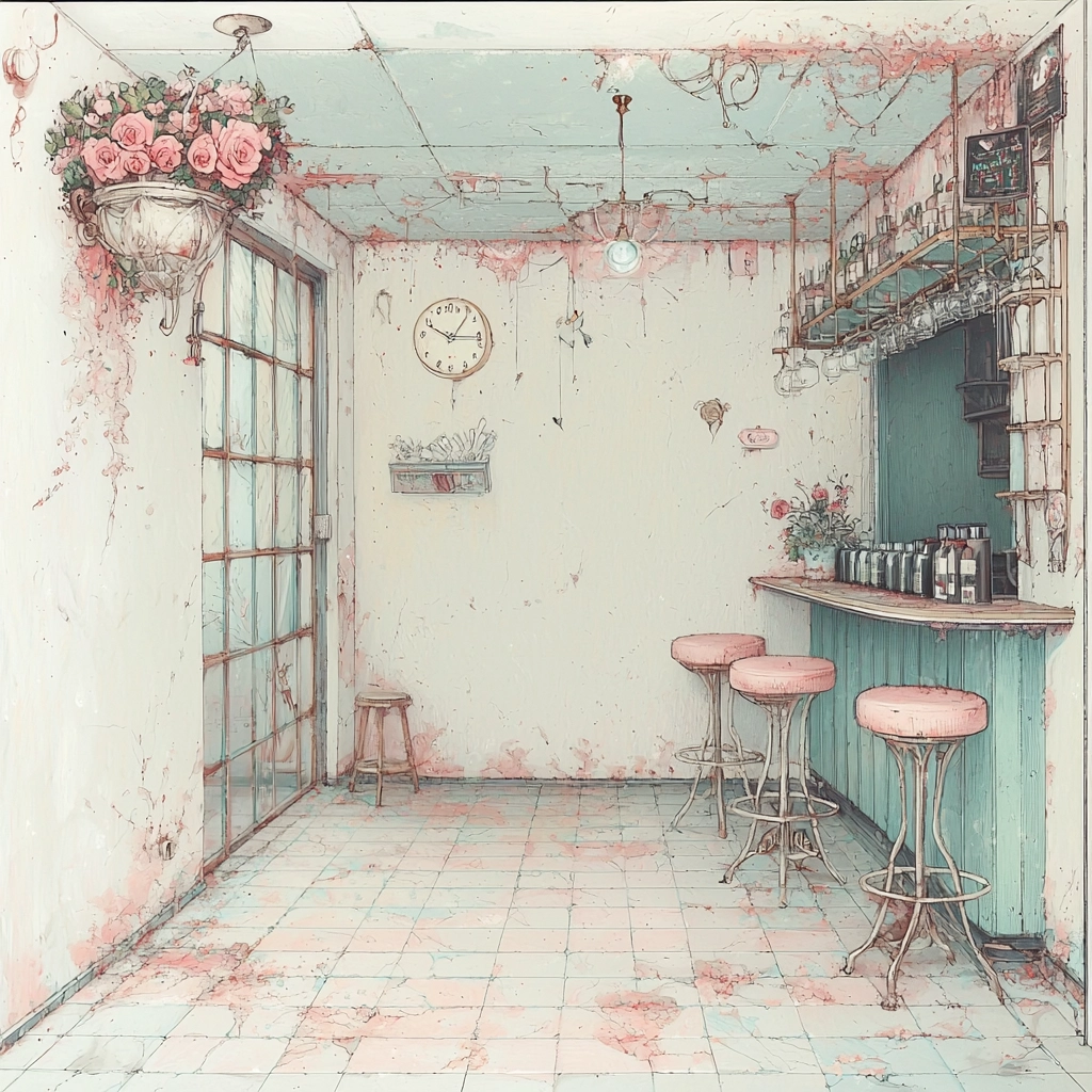 Exhibiting subtle lighting effects, the pastel colors create a harmonious palette that gives a sense of lightness and openness. The textures are muted, enhancing the airy and expansive spatial feel while adhering to a fine illustrative style.