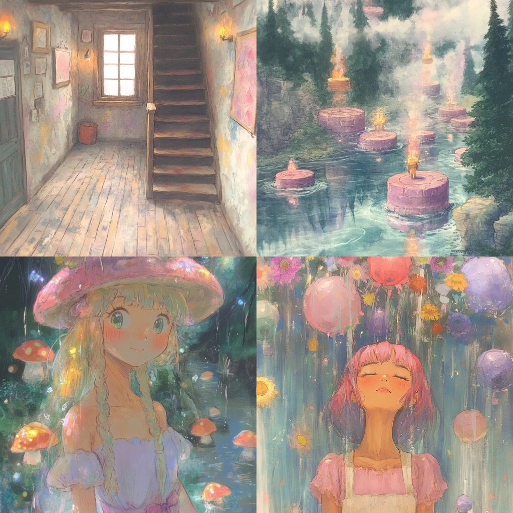 Gentle pastel palette with realistic textures and enchanting atmosphere.