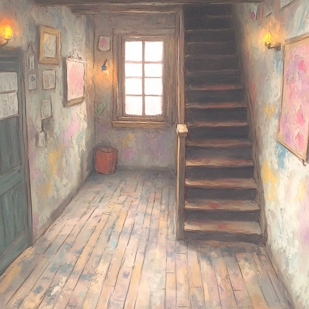 Soft and diffused lighting emphasizes a gentle palette of pastel colors. Textures evoke a delicate and detailed realism, with a balanced spatial arrangement creating depth and dimension.