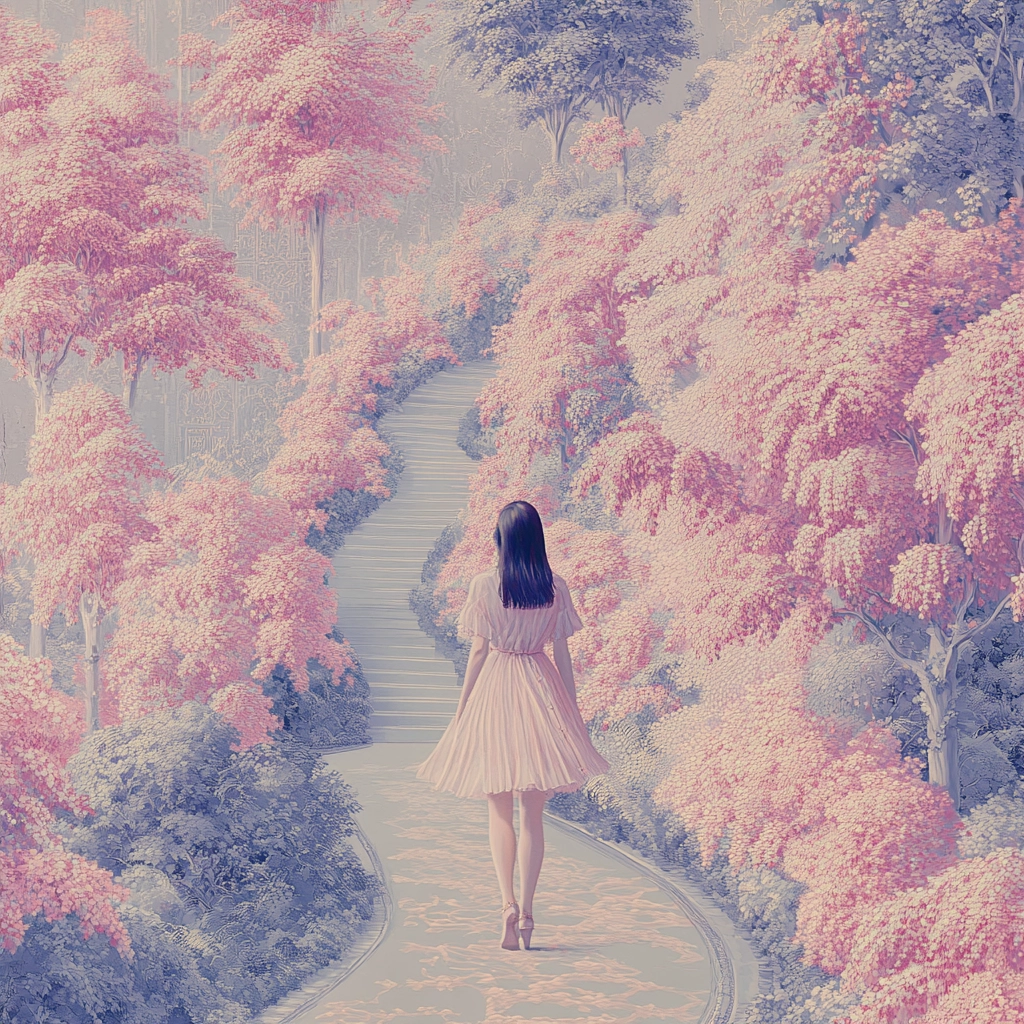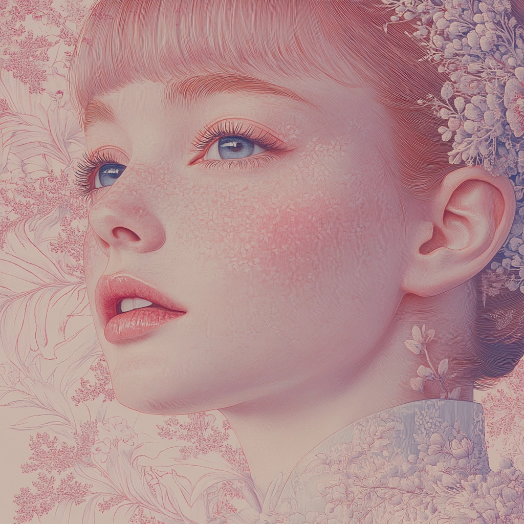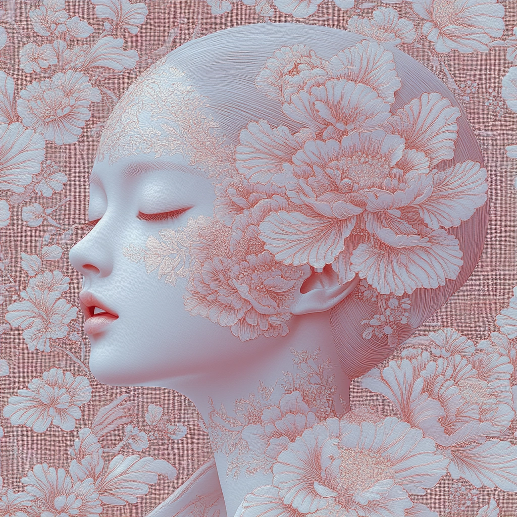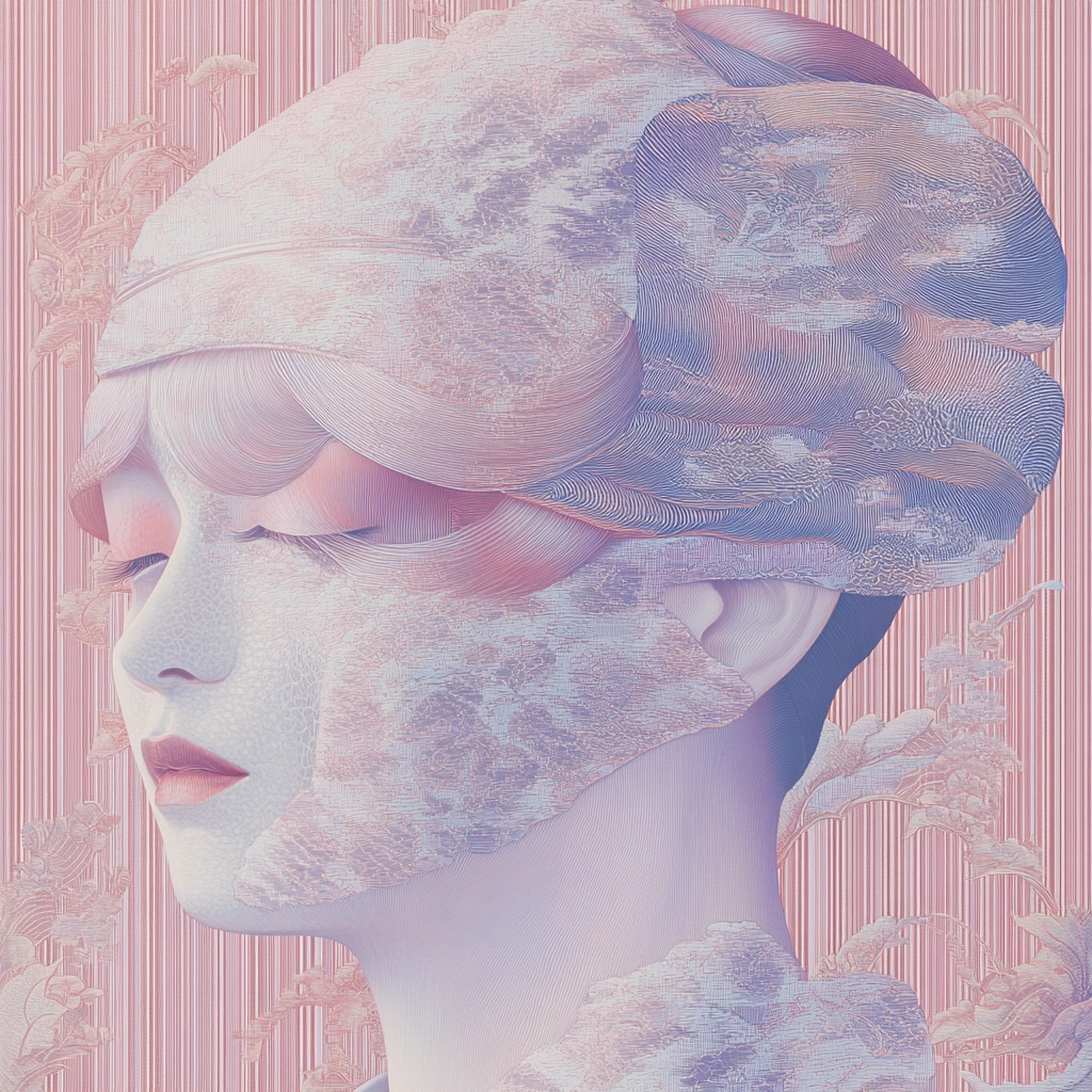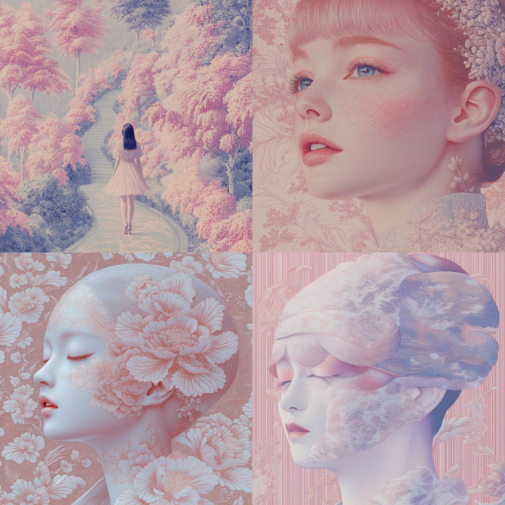 Gentle lighting enhances the pastel palette, adding dimensionality through subtle luminance contrasts. The textures appear delicate with a refined finish, offering a sense of airy lightness and depth.