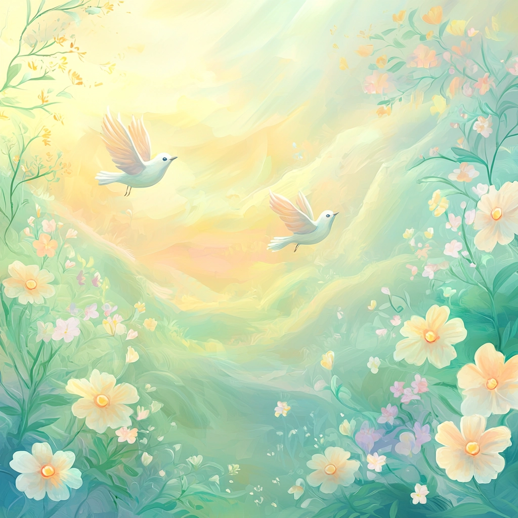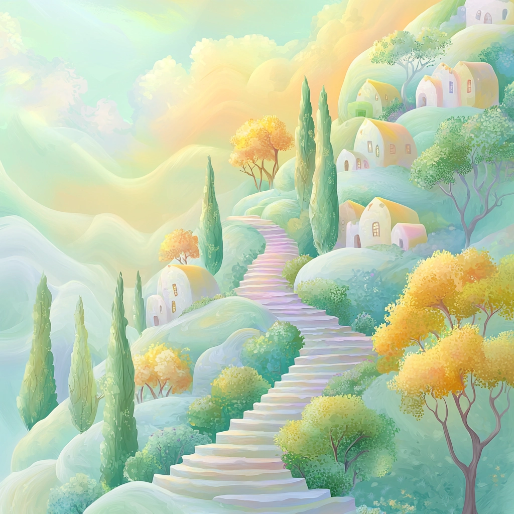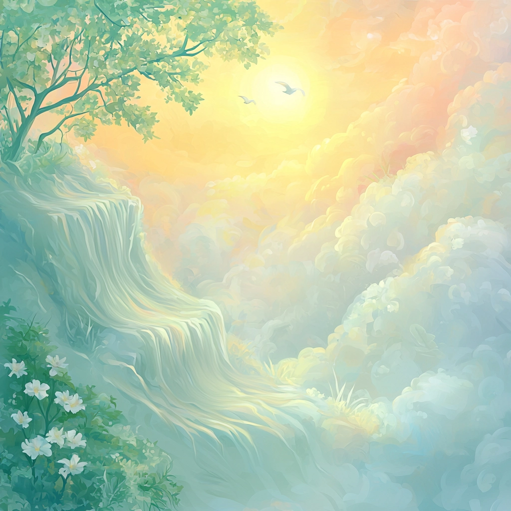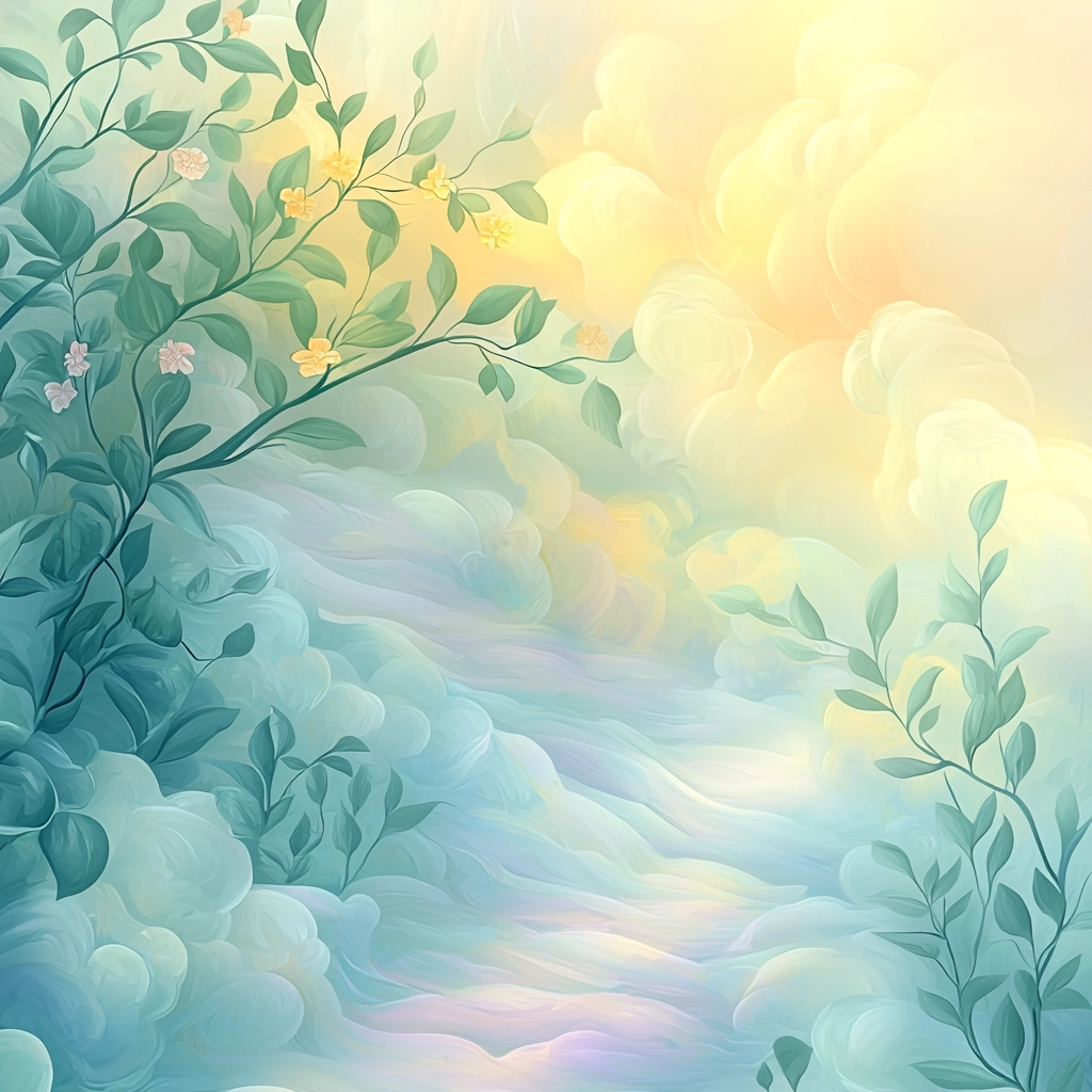 Gentle lighting envelops the scene, creating a harmonious balance between light and shadow. The pastel colors blend seamlessly, producing a calming, continuous flow of hues. The layering of color adds depth, while the fine texture suggests a serene, tactile softness.