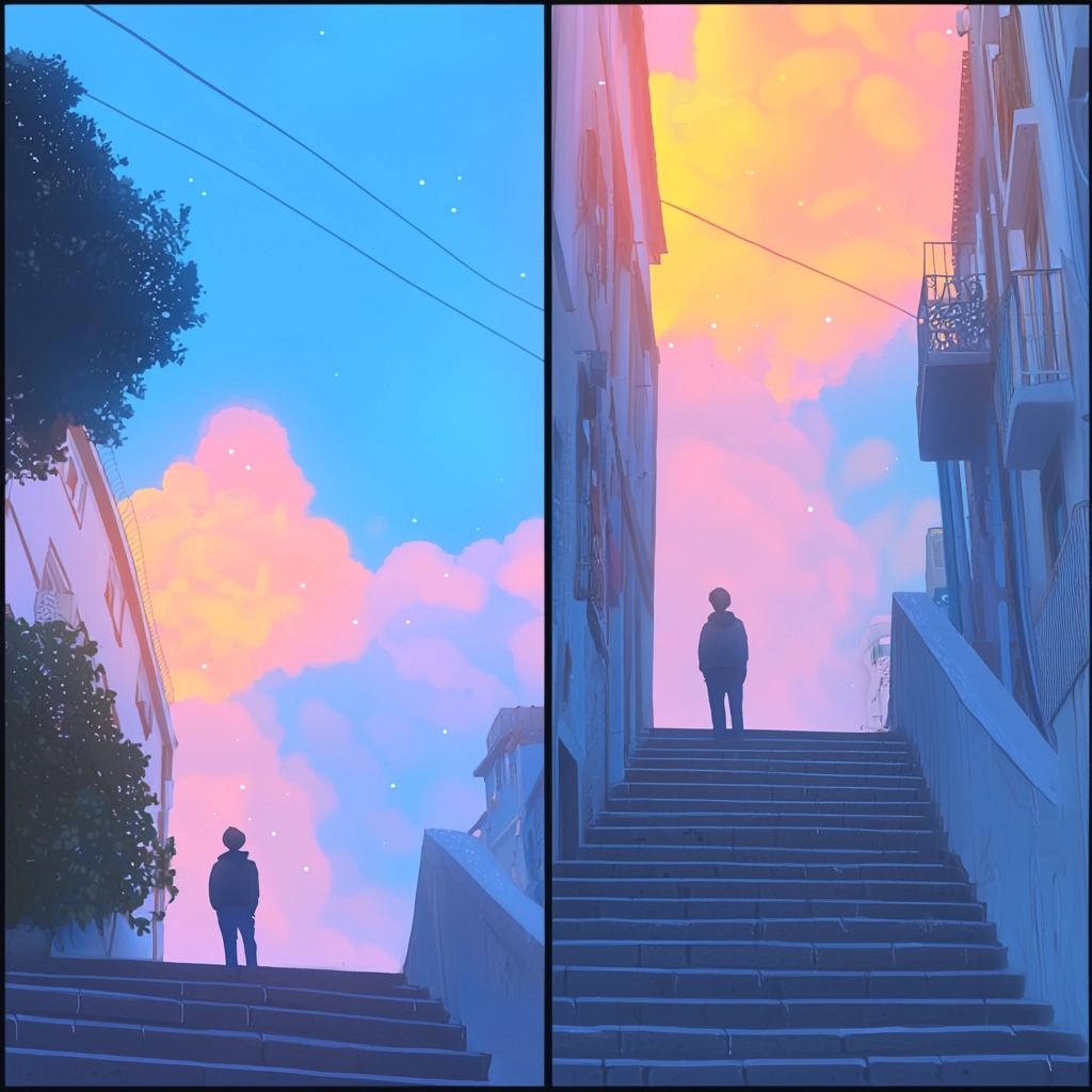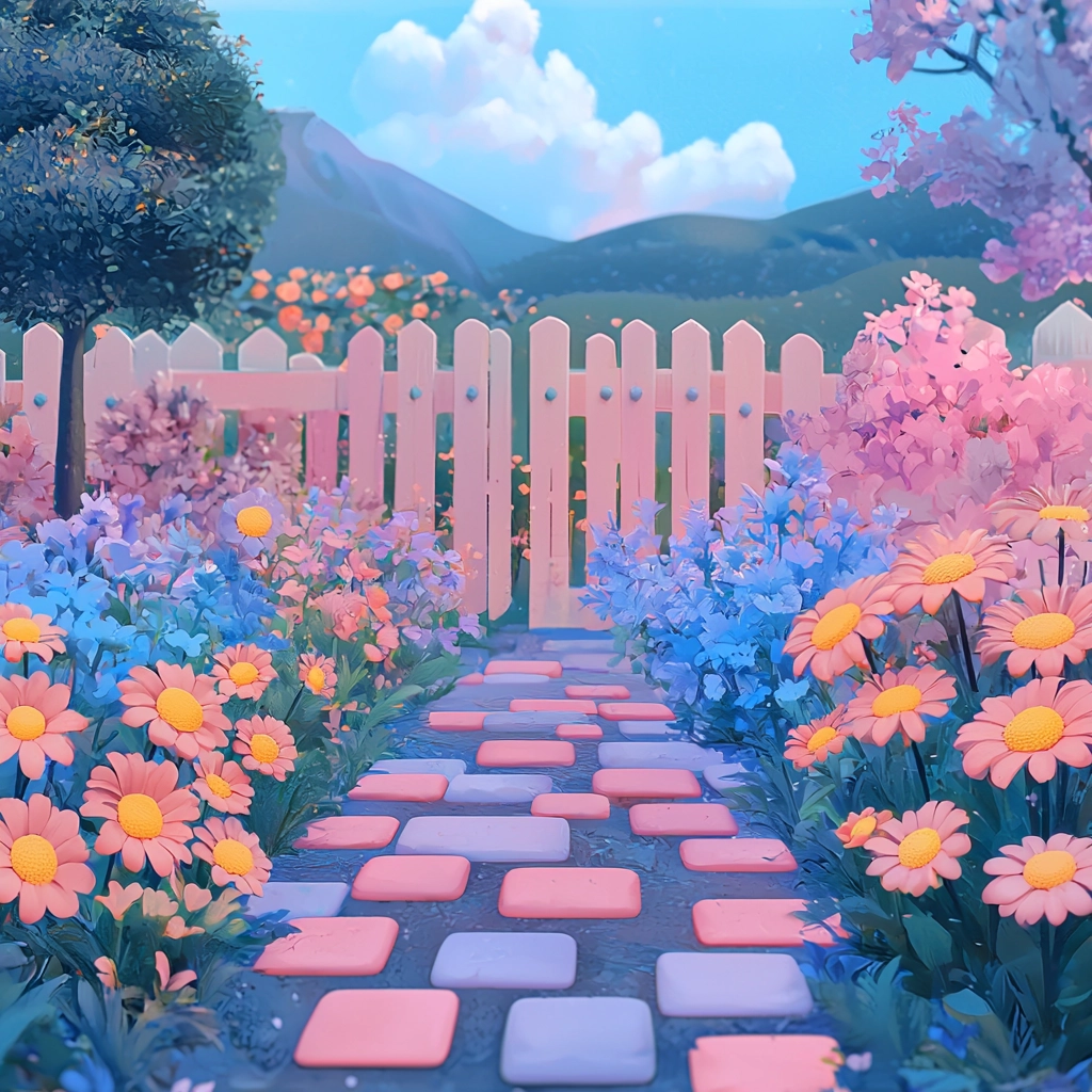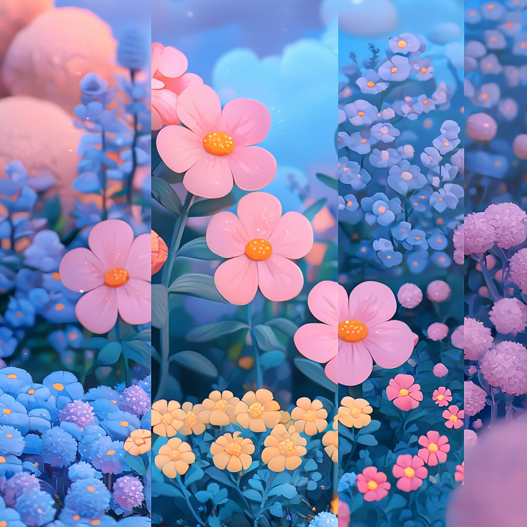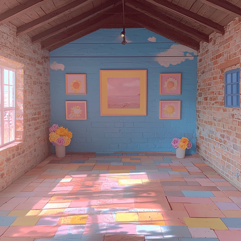 The lighting is soft, emphasizing a dreamlike and immersive sense of depth. The colors are gentle yet vibrant, creating a playful interaction between the artificial and the natural. Textures are smooth, enhancing the clean composition and coherent spatial arrangement.