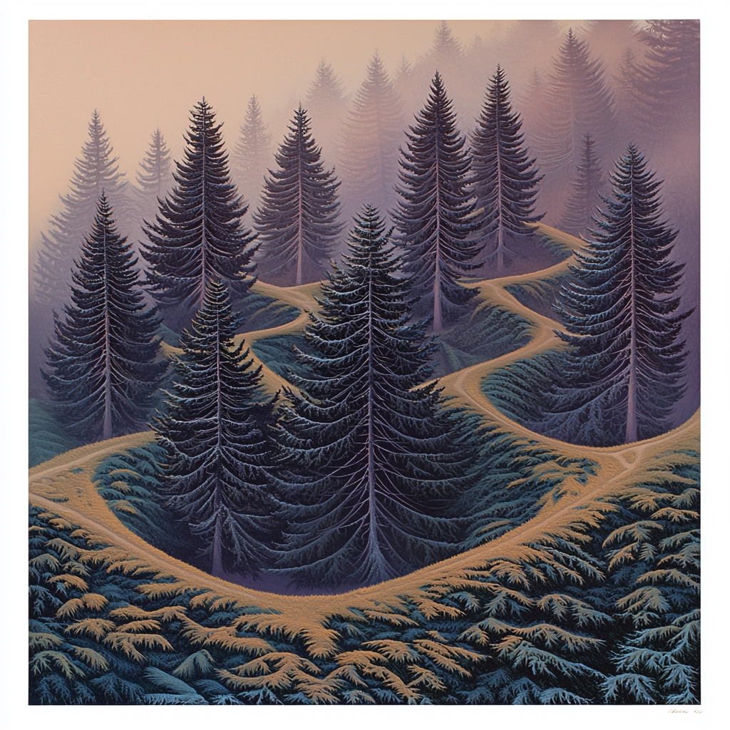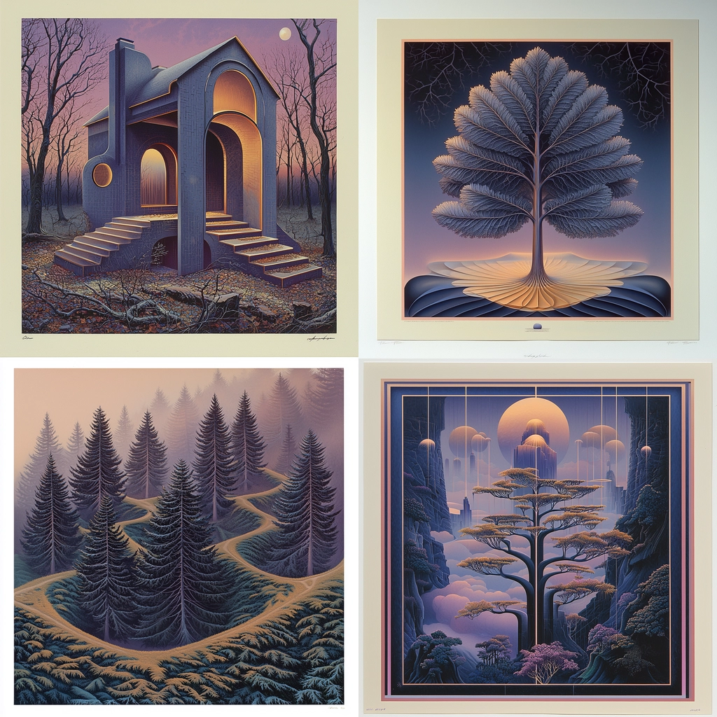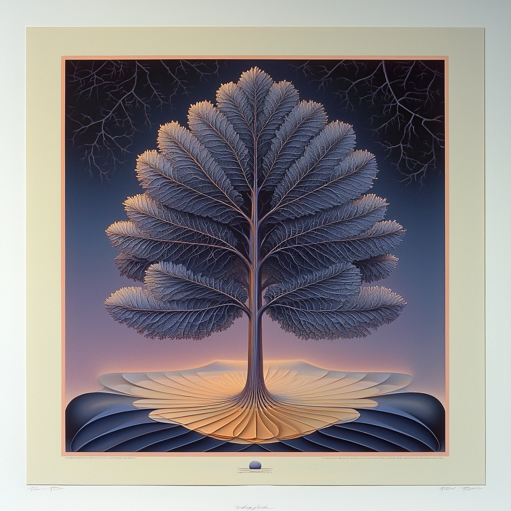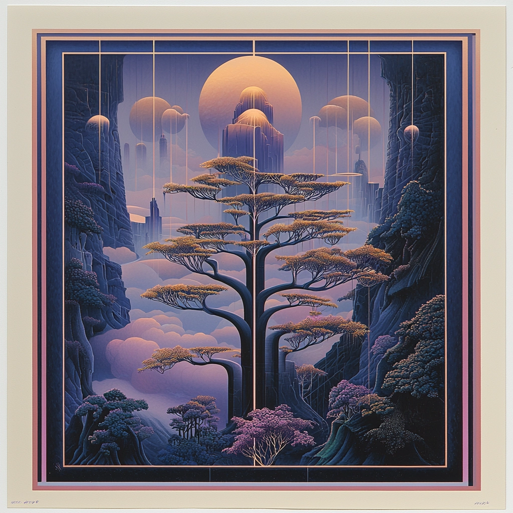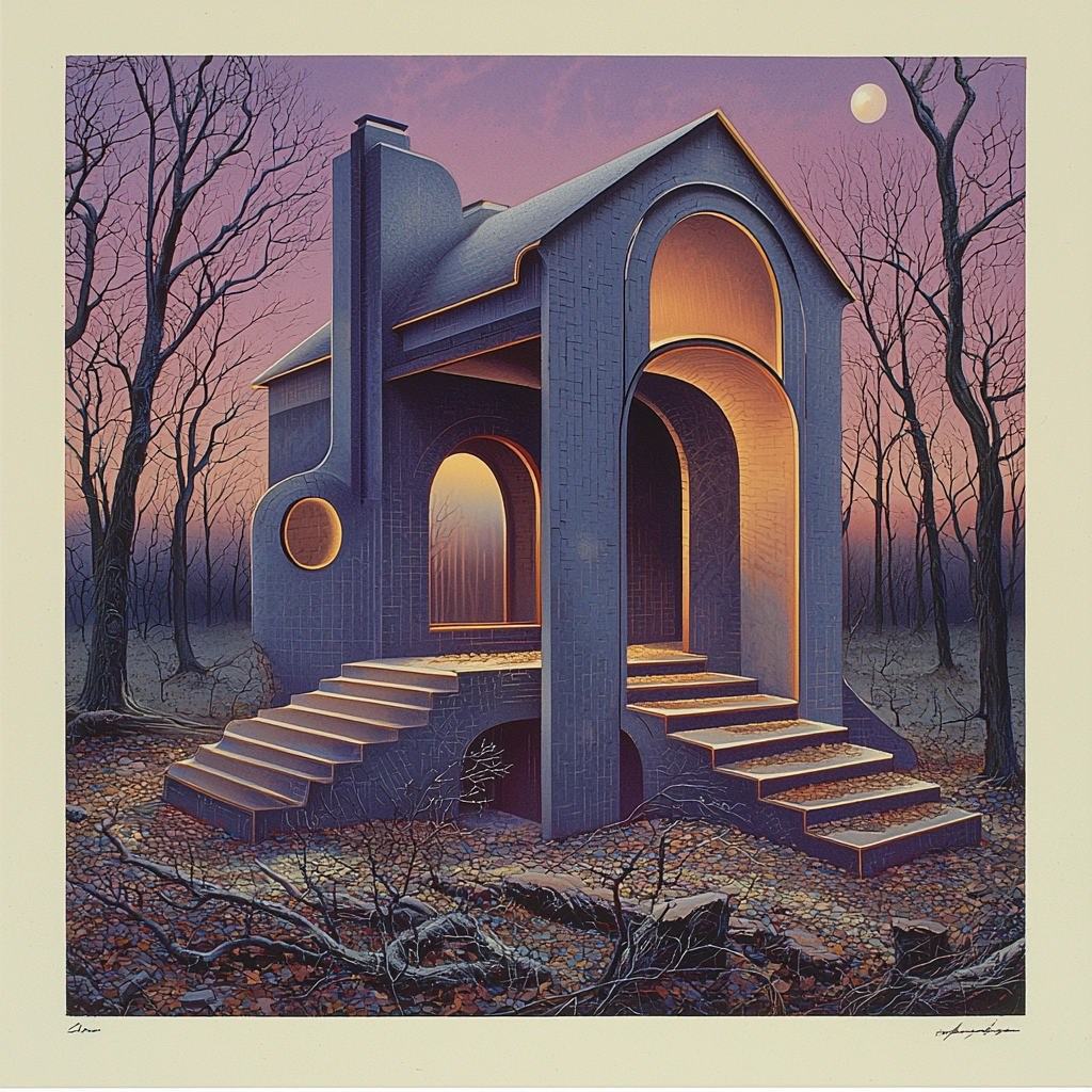 The lighting employs gradual shifts, casting a soft glow over the surfaces, revealing subtle details. Colors are carefully balanced to enhance spatial illusions and depth, producing an overall sense of unity. Textures are smooth and fine, with gentle contours that relate to the dynamic forms and curves throughout.