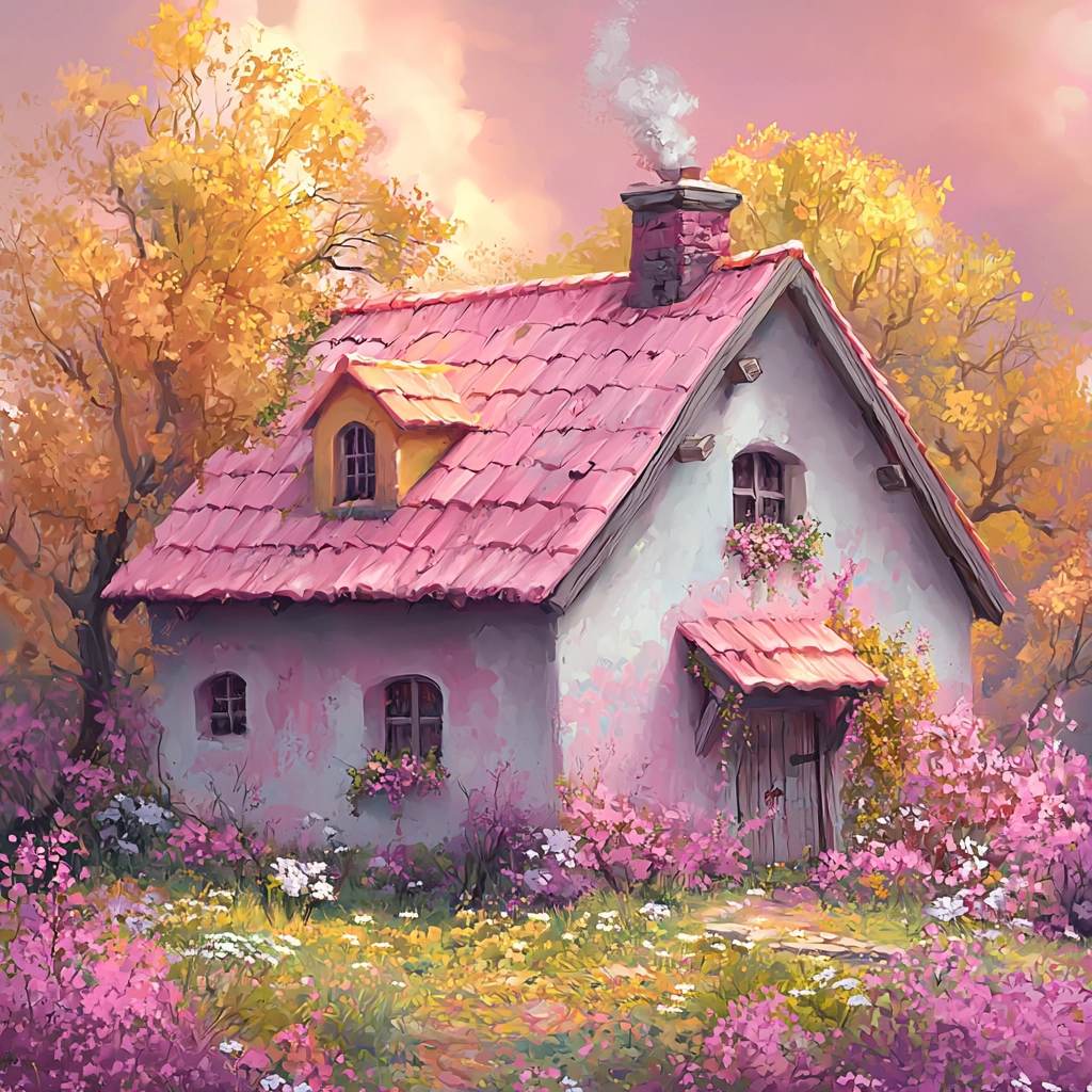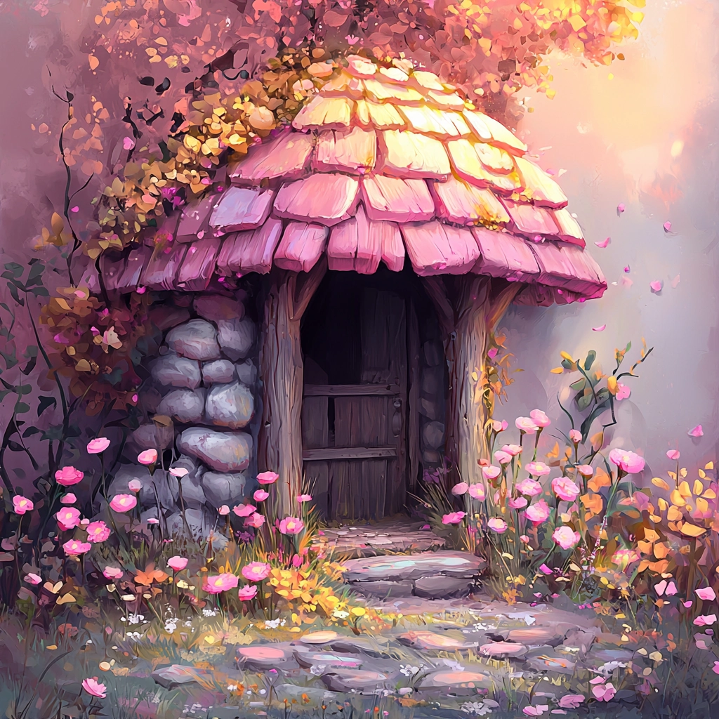 The lighting is gentle and creates a twilight atmosphere, bathing everything in a warm and inviting glow. Pastel hues dominate, with smooth transitions between colors, enhancing the dreamlike quality. The texture is finely detailed, providing a realistic yet gentle tactile sensation.