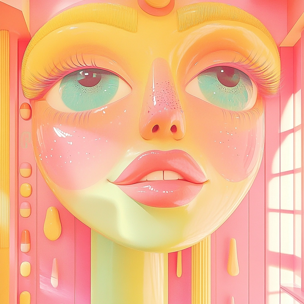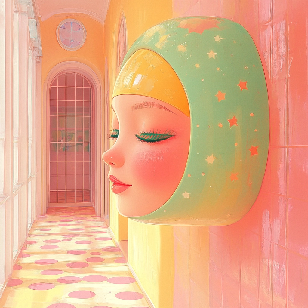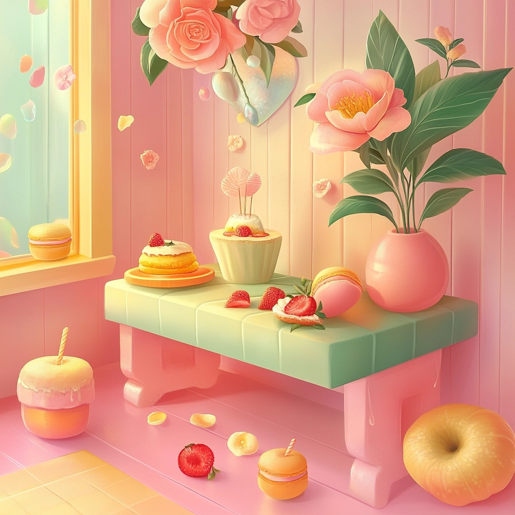 Light effects are warm and evenly dispersed, giving a gentle glow to surfaces. Colors are predominantly pastel pinks combined with subtle greens and yellows. Spatial sense is open and inviting, with textures appearing smooth and polished.