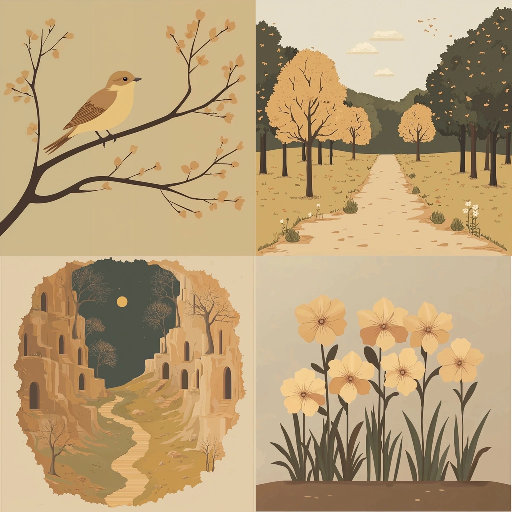 Lighting is soft and diffused, enhancing muted color tones. The composition uses balanced symmetry, creating a calm atmosphere. Textures are smooth with an emphasis on clarity and detail.