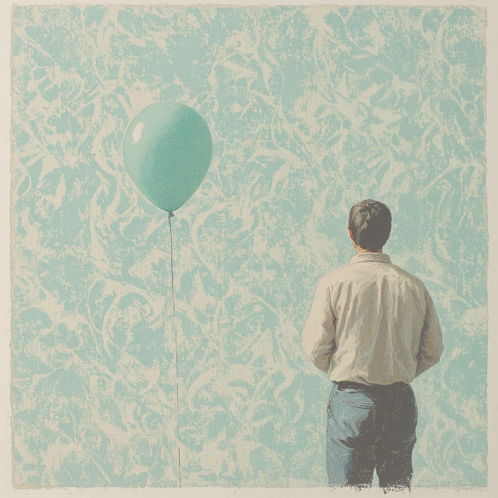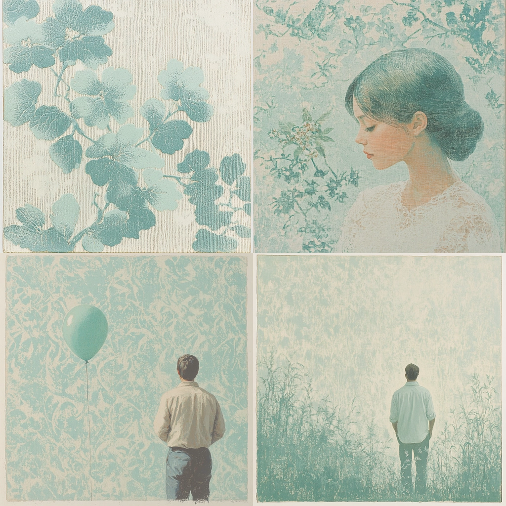 The lighting employs a gentle, diffused effect creating seamless transitions between subjects and backgrounds. The cyan hues stand out, providing a cool tone, while beige offers a warm undertone that balances the composition. The texture appears finely detailed, emphasizing the realistic portrayal with a nuanced spatial sense.