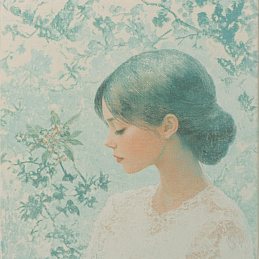 A soft harmony of cyan and beige with detailed depiction and subtle transitions.
