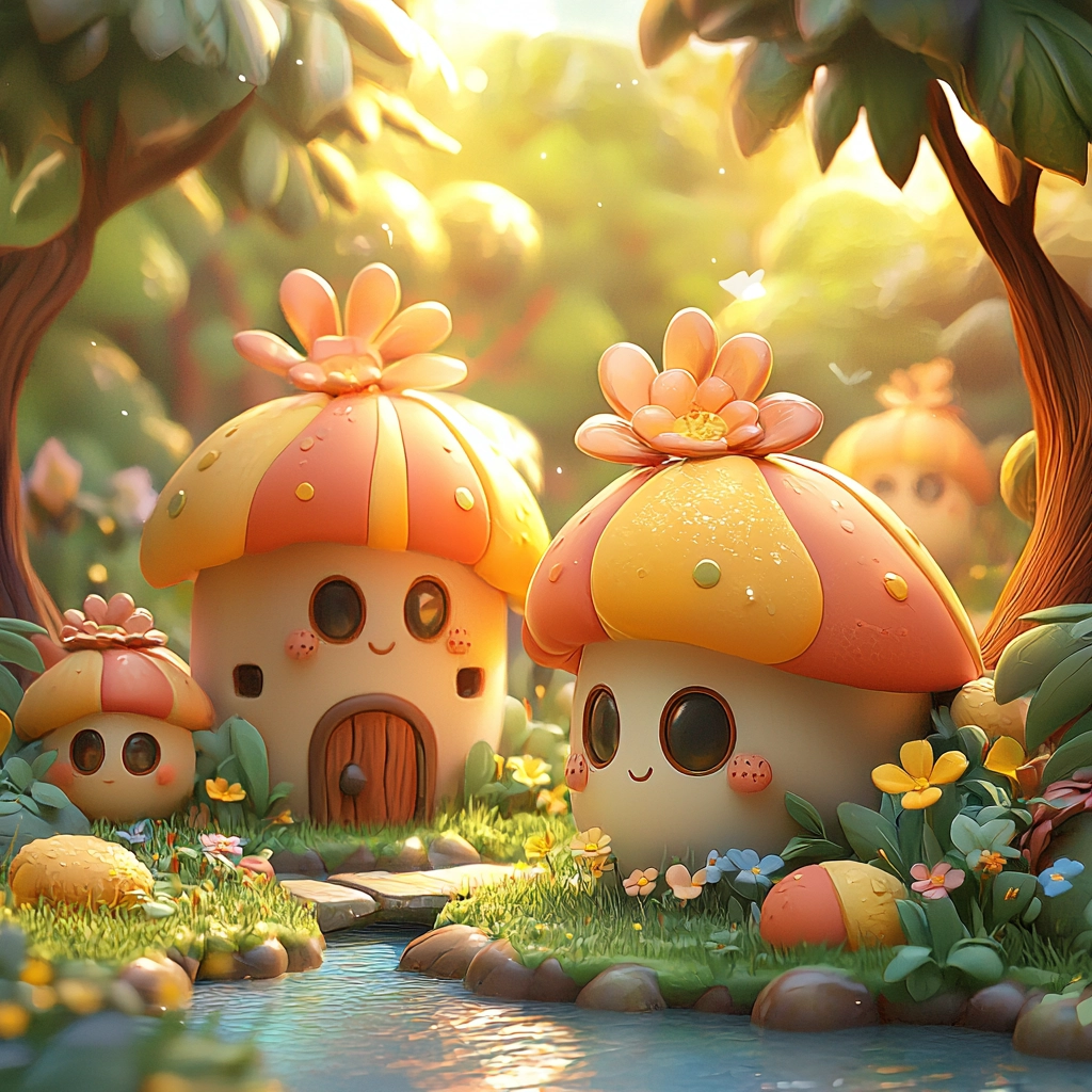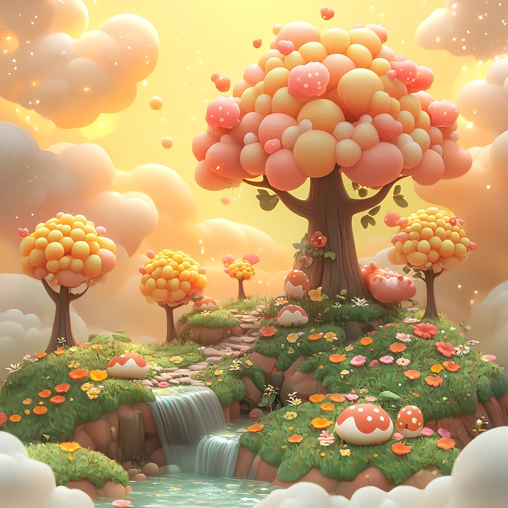 The lighting effects create a warm, luminous atmosphere, highlighting the smooth, almost tangible textures. Vibrant yet soft colors give a dream-like quality to the space. The composition emphasizes gentle gradients and subtle contrasts to convey depth and a sense of wonder.