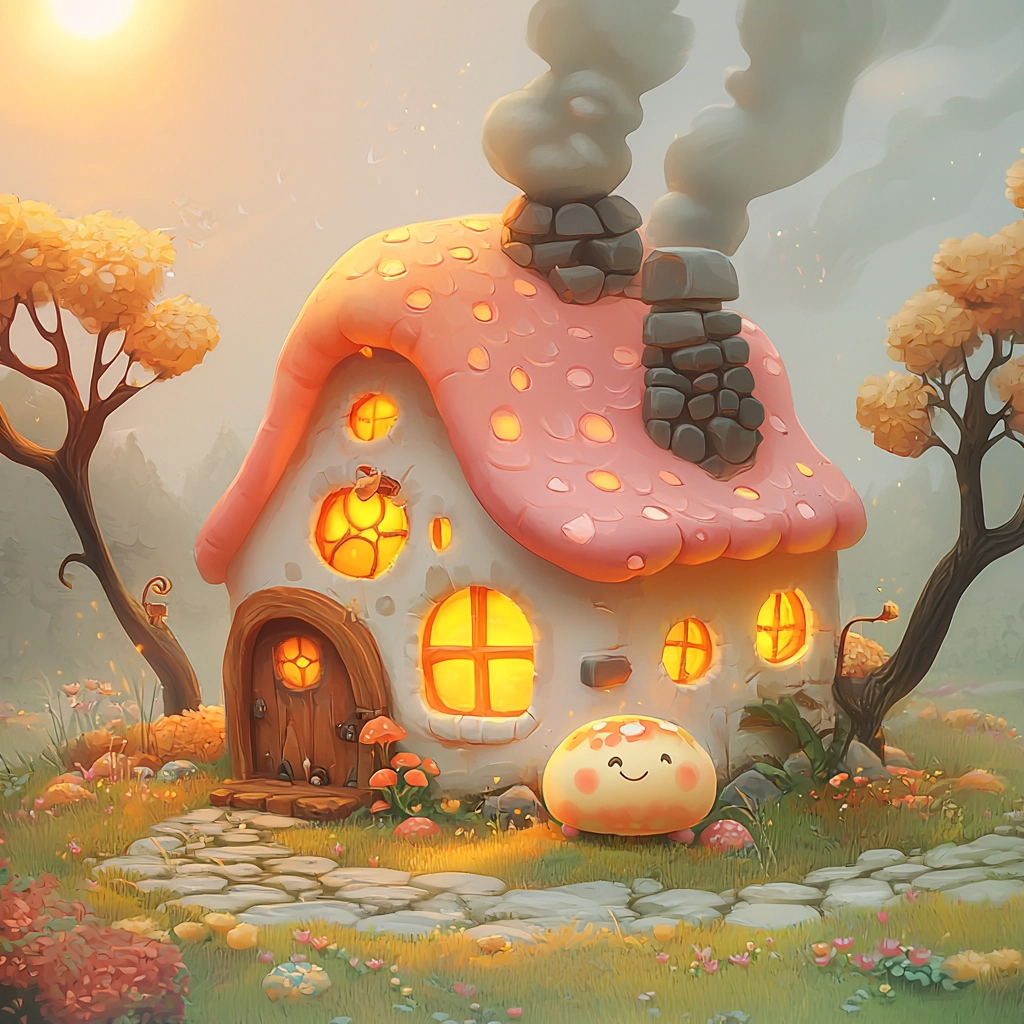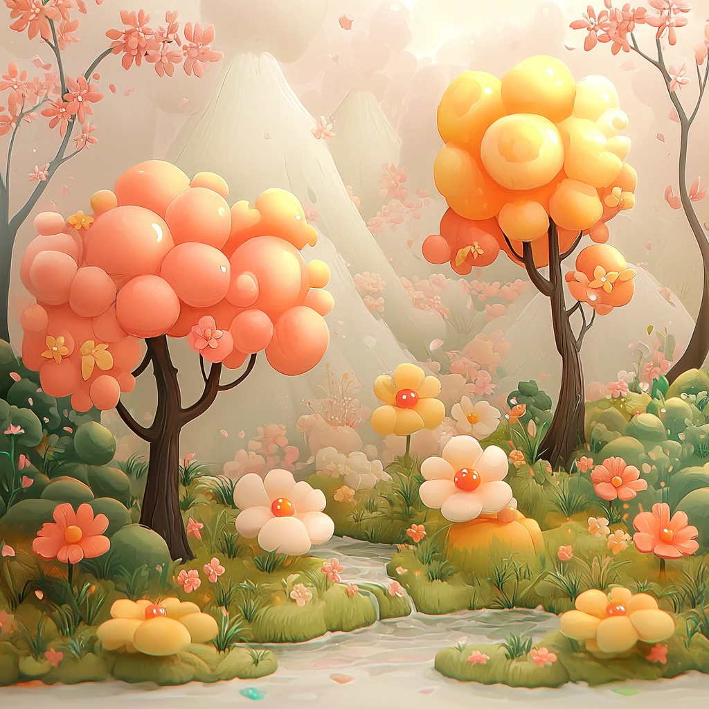 Soft pastel hues enhance a whimsical, glowing world with organic shapes.