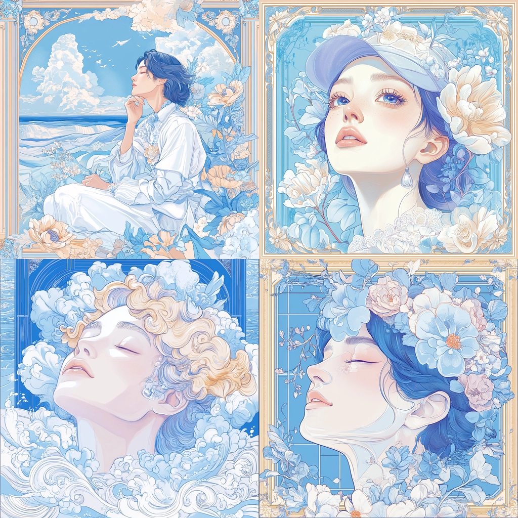 Soft blues and beiges shape elegant compositions with floral motifs.