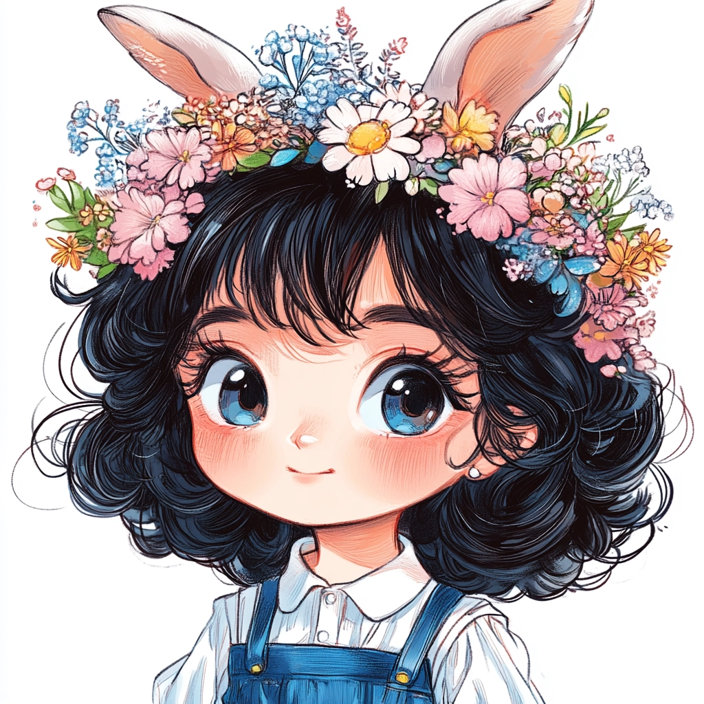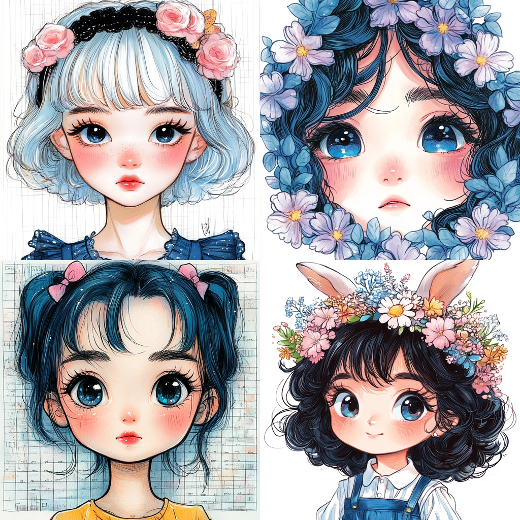 Soft lighting accentuates the intricately drawn flowers and varied hair textures, giving a sense of depth and attention to detail. The use of pastel colors provides a gentle contrast, while the compositions are evenly balanced with elements spread across the scene.