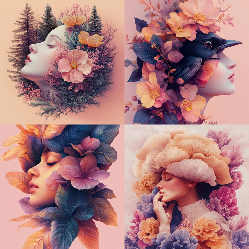 Gentle pastel hues blend with floral compositions.