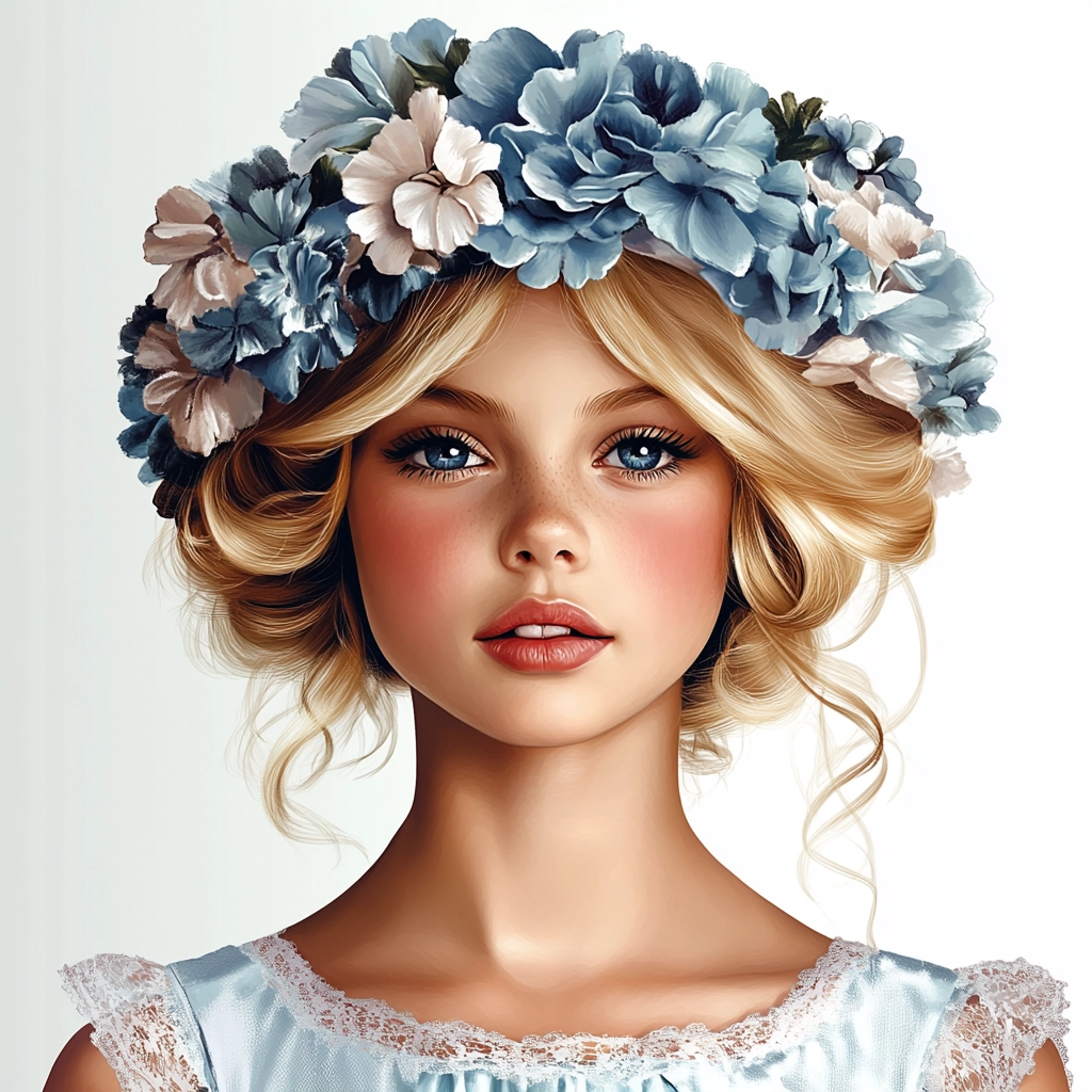 The artwork displays soft, diffused lighting enhancing pastel hues, creating a sense of depth. The textures of floral elements are meticulously rendered, appearing almost tangible against muted backgrounds.