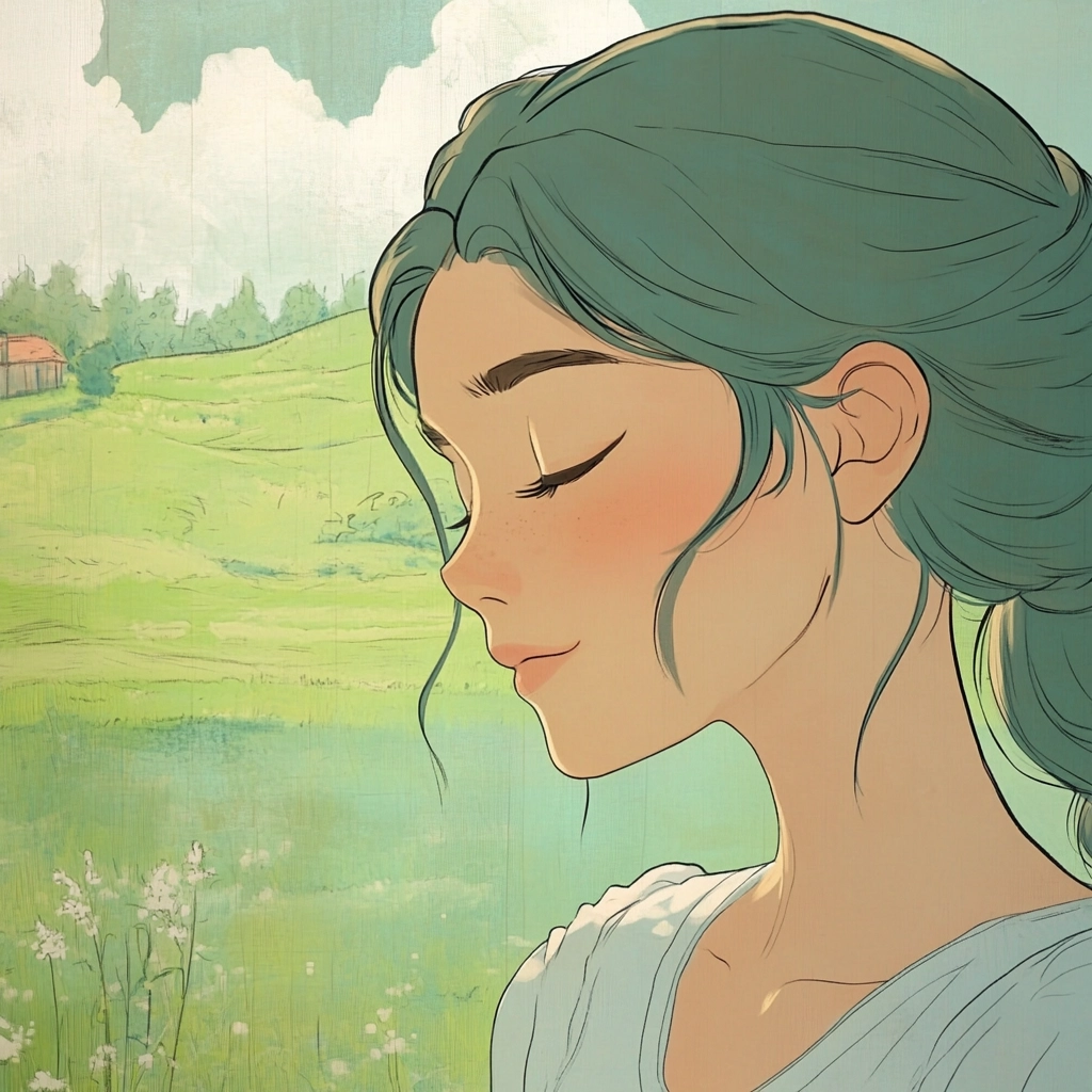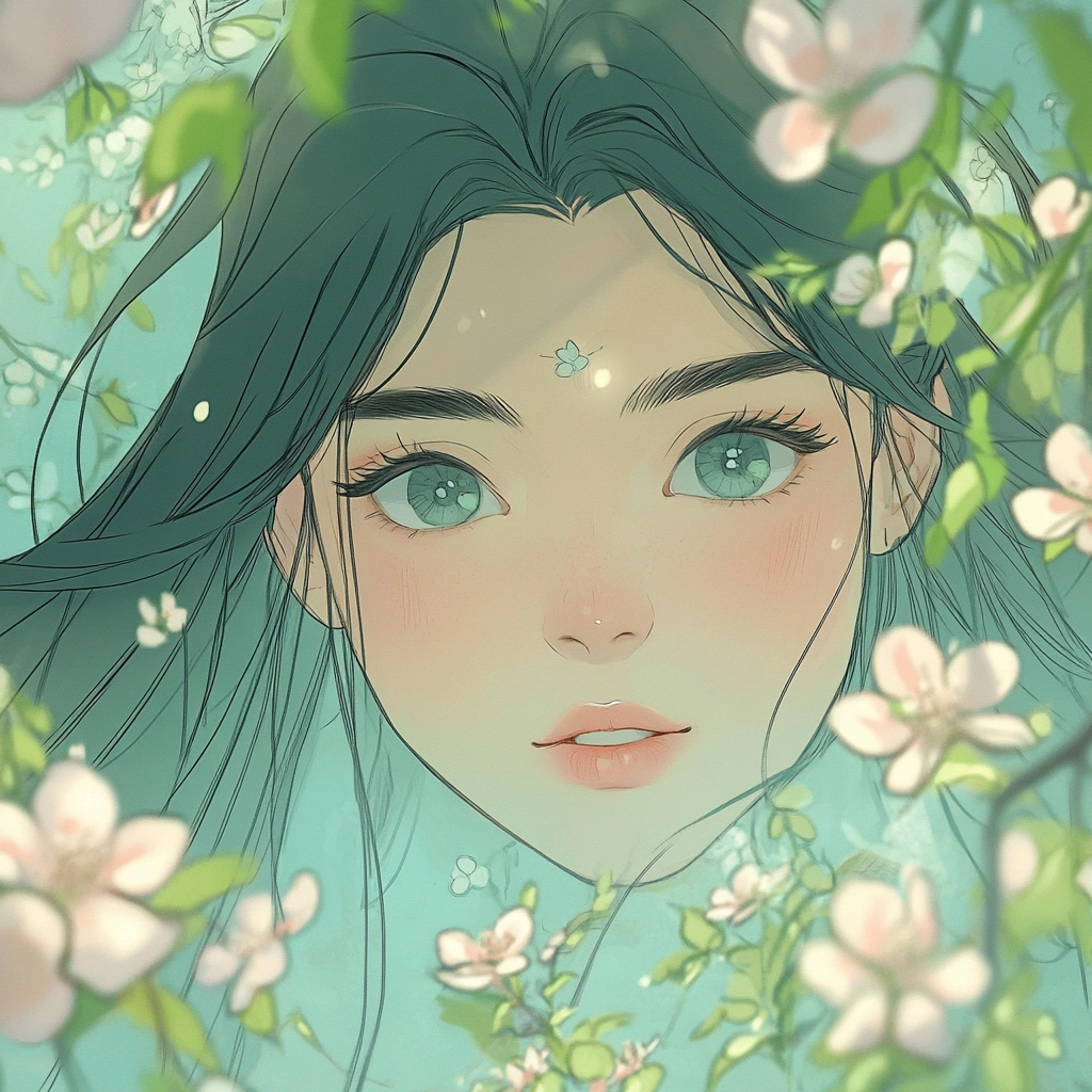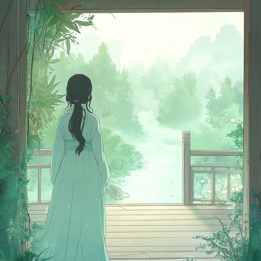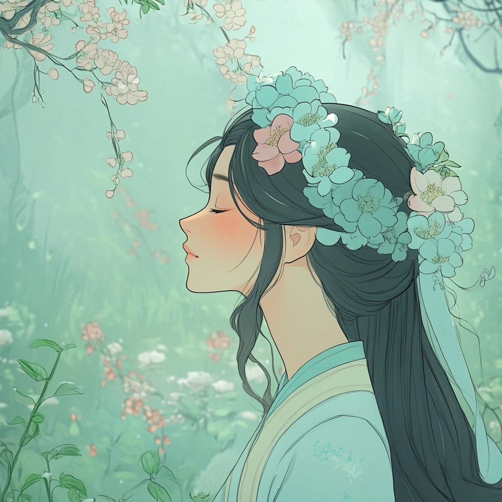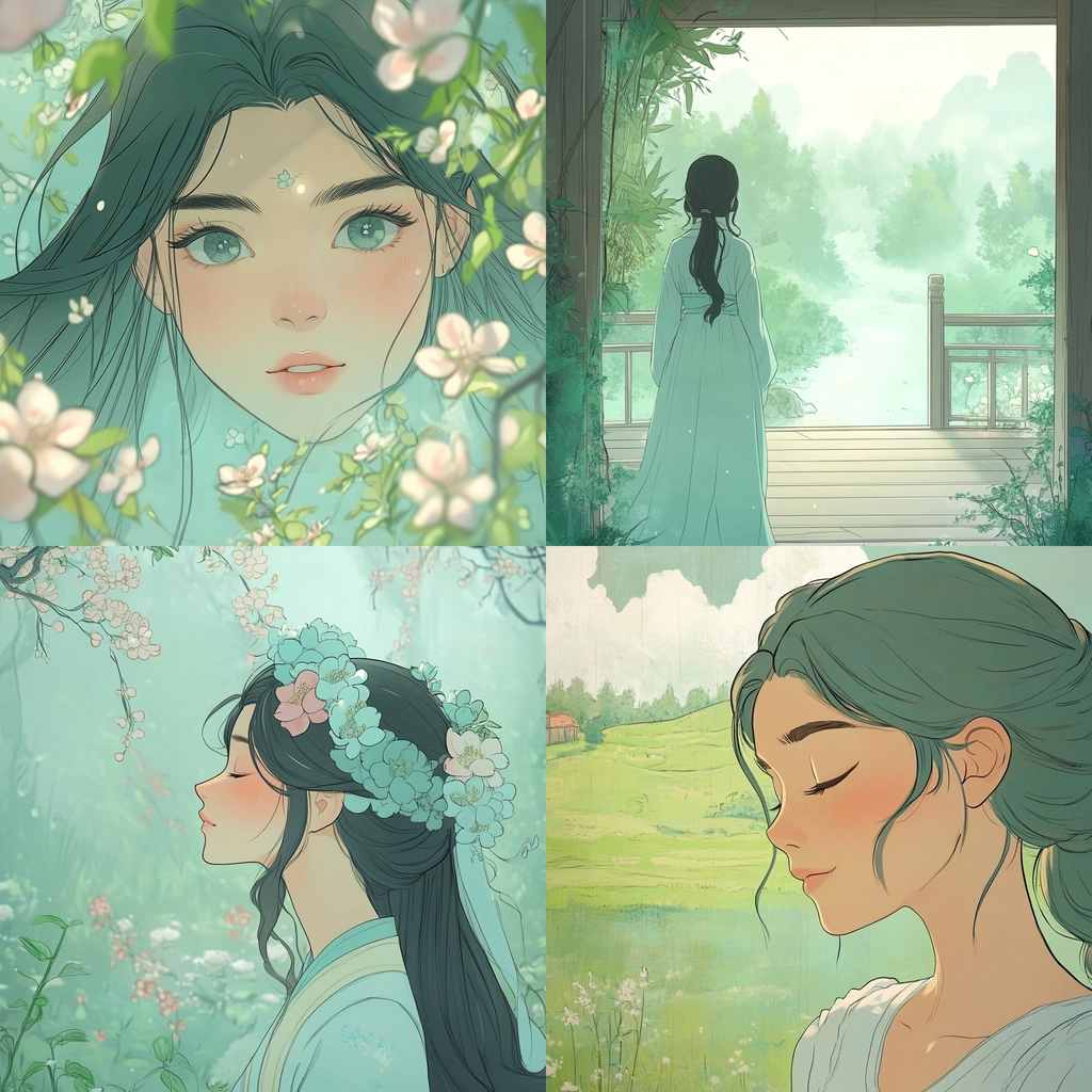 Lighting is diffused to create a soft, gentle atmosphere. The colors are primarily light pastels, emphasizing green and pink hues with delicate floral motifs. The spatial sense is calm and open, while the textures appear smooth and ethereal, enhancing the gentle visual appeal.