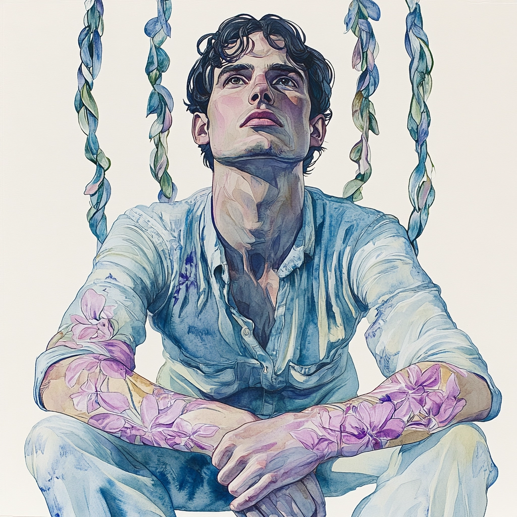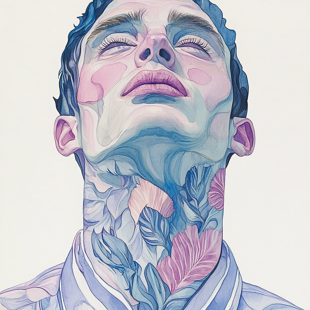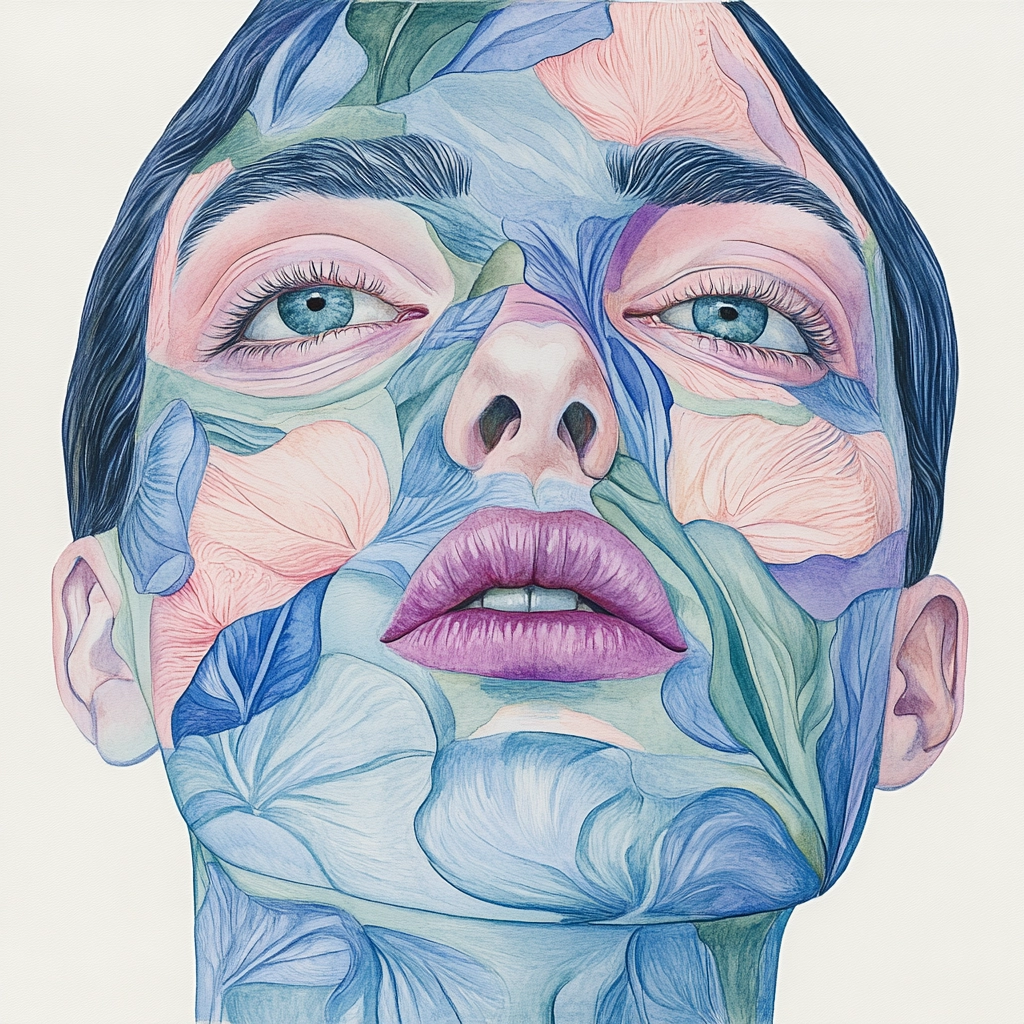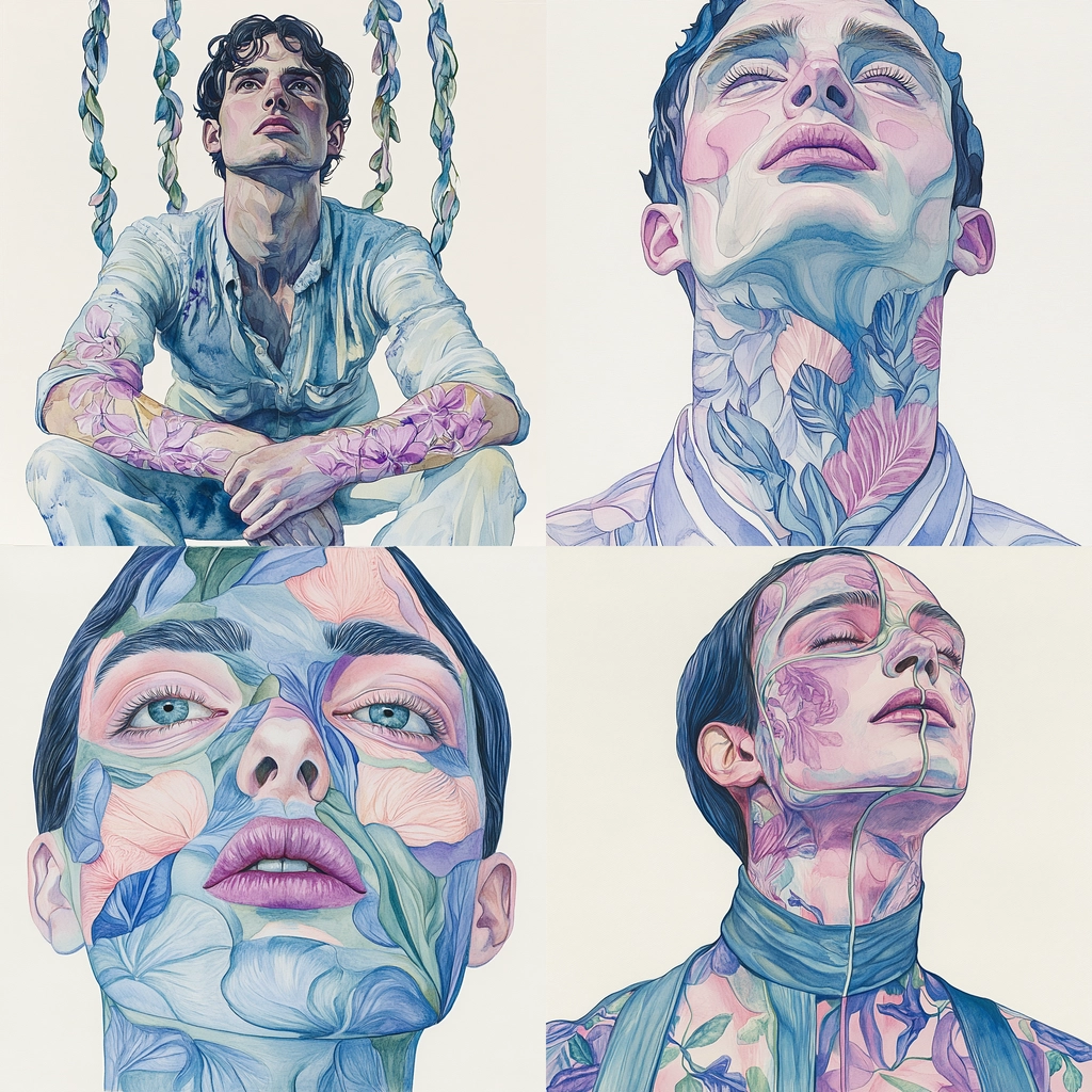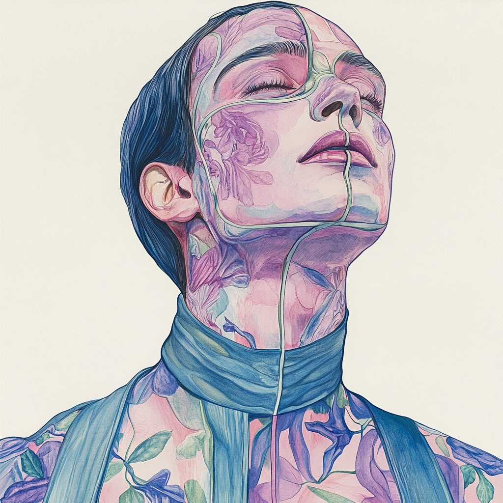 The artwork uses soft lighting to highlight pastel colors, allowing a gentle interplay between pink and blue, creating harmony. The spatial arrangement gives depth, while delicate brushstrokes enhance the fine texture, capturing elegant details.
