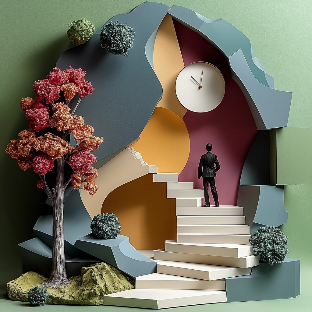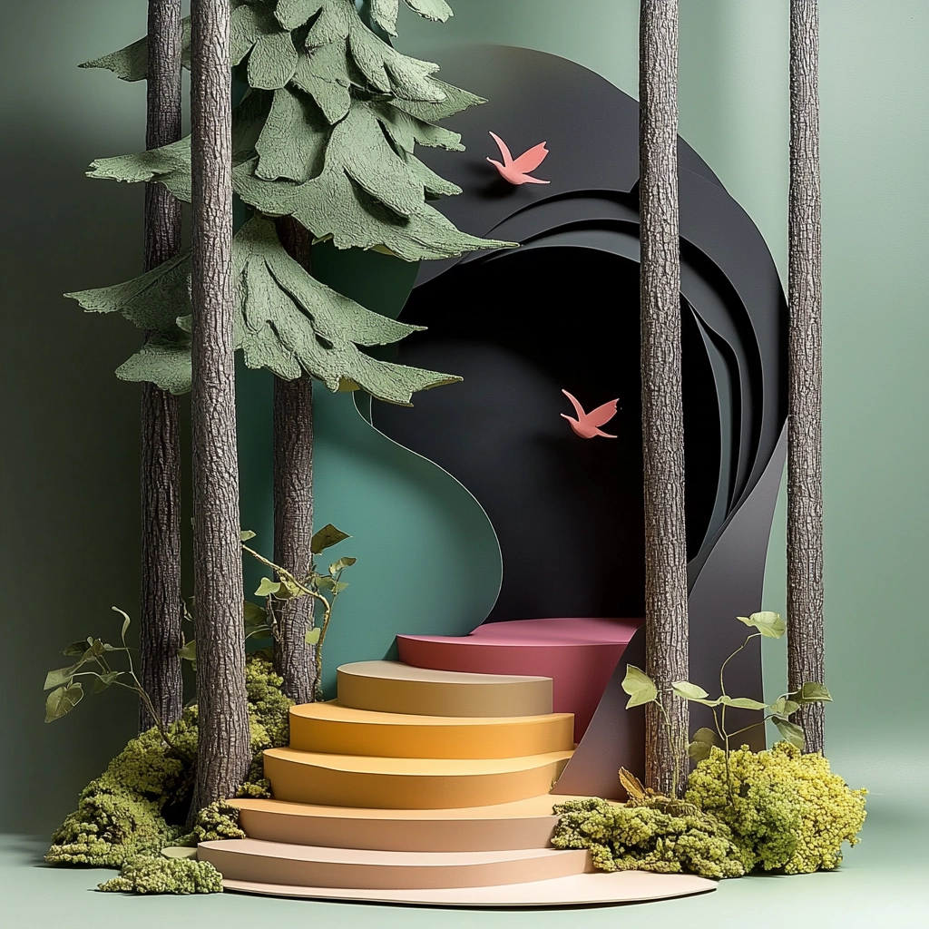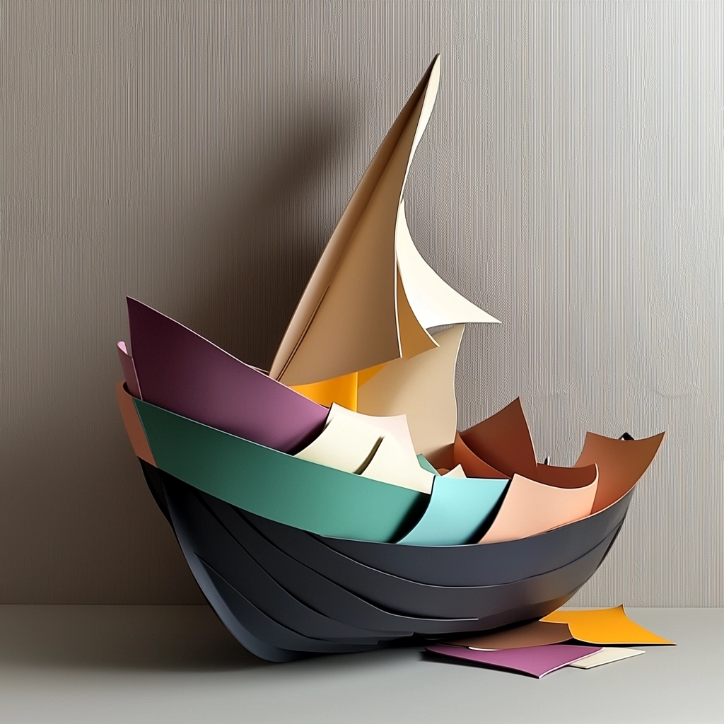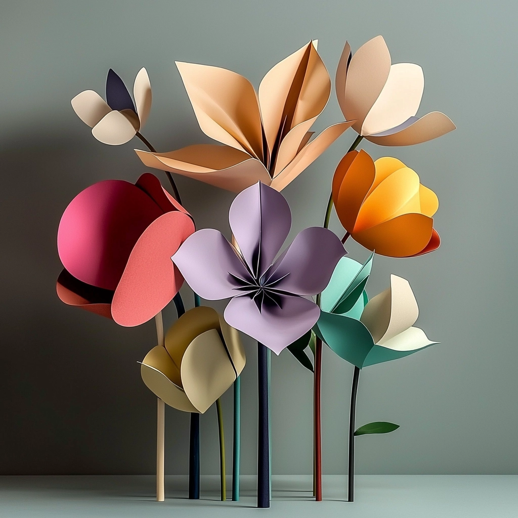 Lighting plays with shadow and depth, highlighting the intricacy of folded forms. The use of pastel colors gives a gentle yet vibrant feel. Textures combine smooth surfaces with precise, crisp edges, enhancing dimensionality and visual interest.