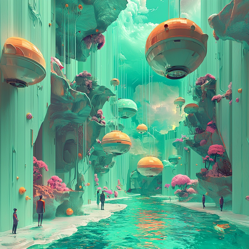 Cyan and pink hues create a vibrant yet calm spatial composition.