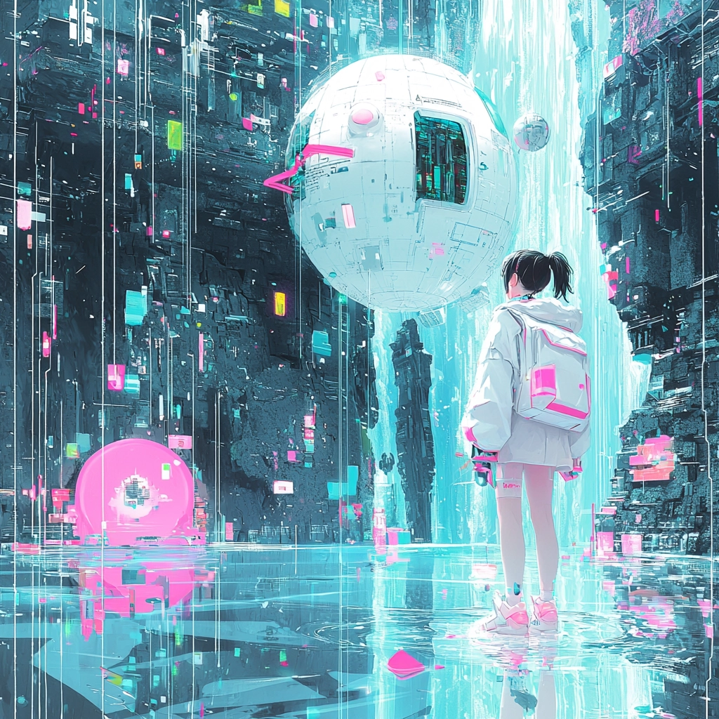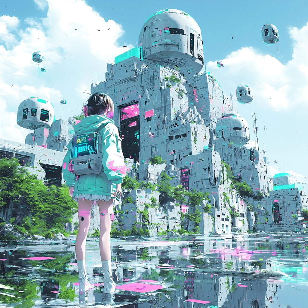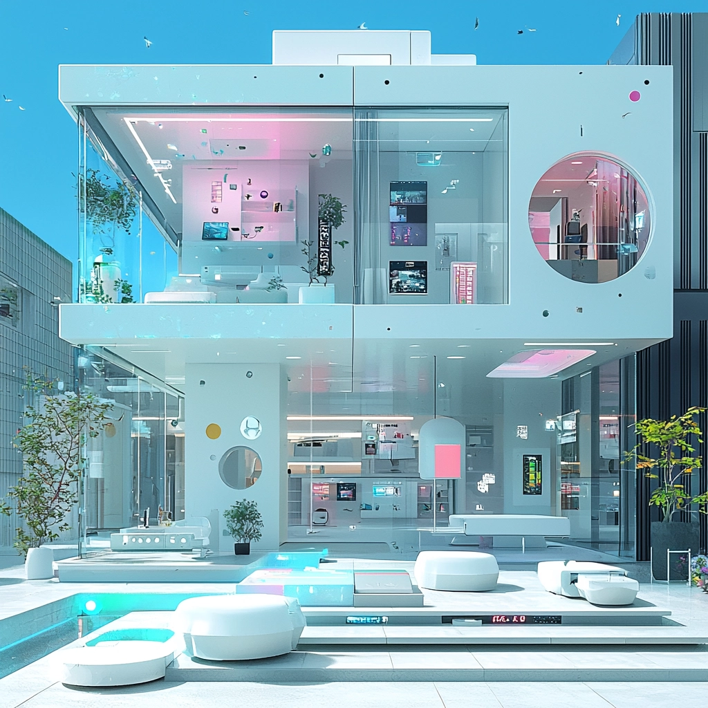 Combines pastel hues with precise architectural forms, reflecting a high-tech environment.