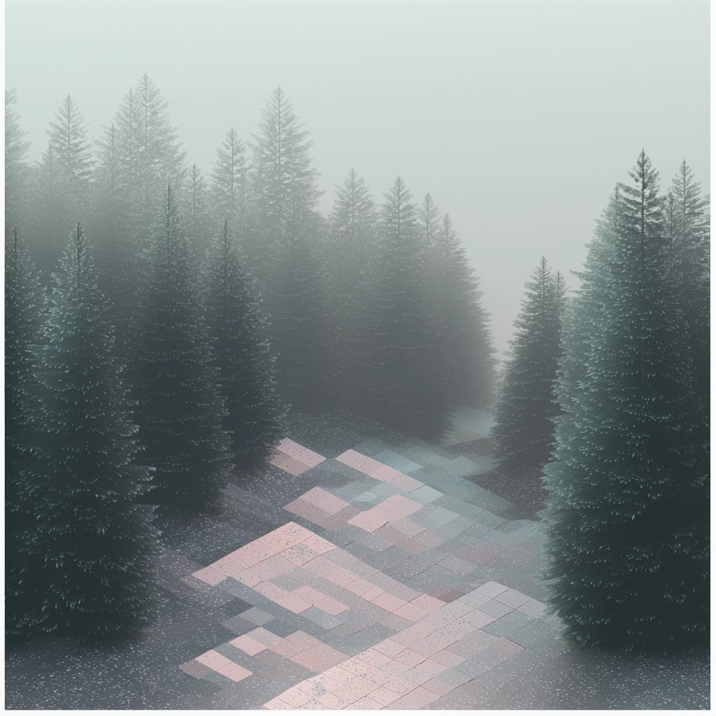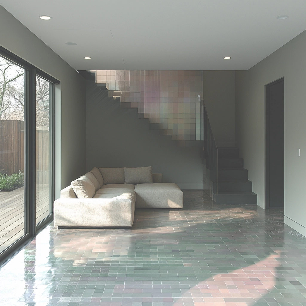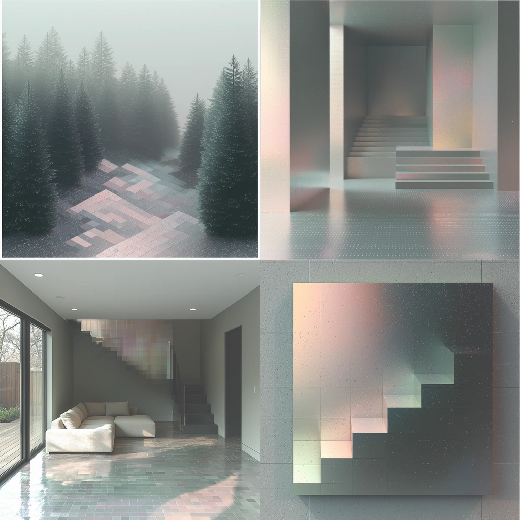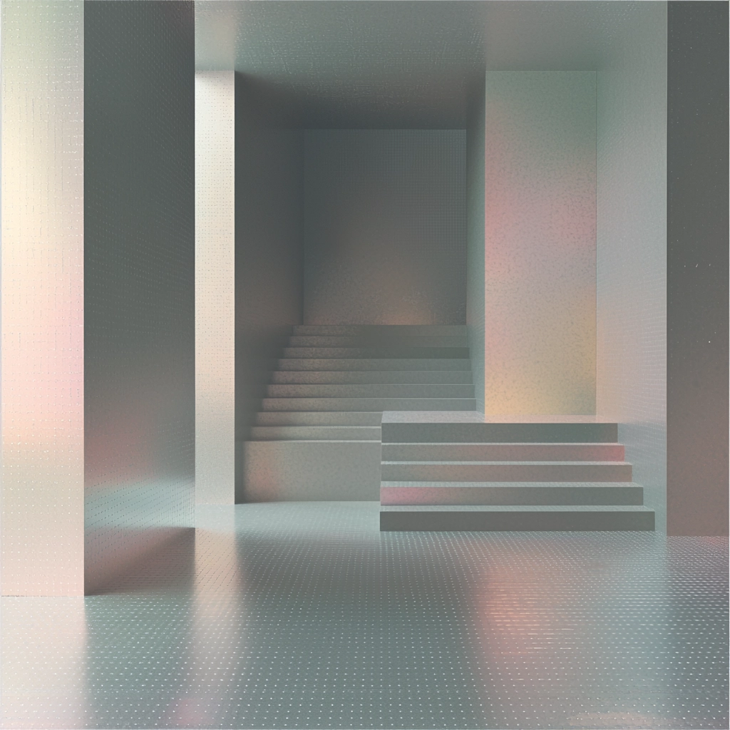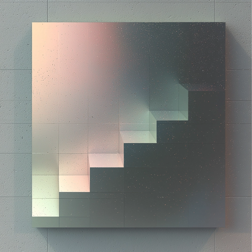 The lighting provides a diffused, soft glow that enhances the pastel shades. Colors blend into one another through gentle transitions, and the geometric forms suggest a layered spatial sense. The texture is polished yet slightly foggy, adding depth and intrigue to the image.