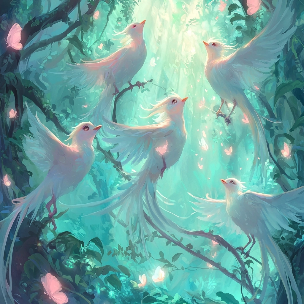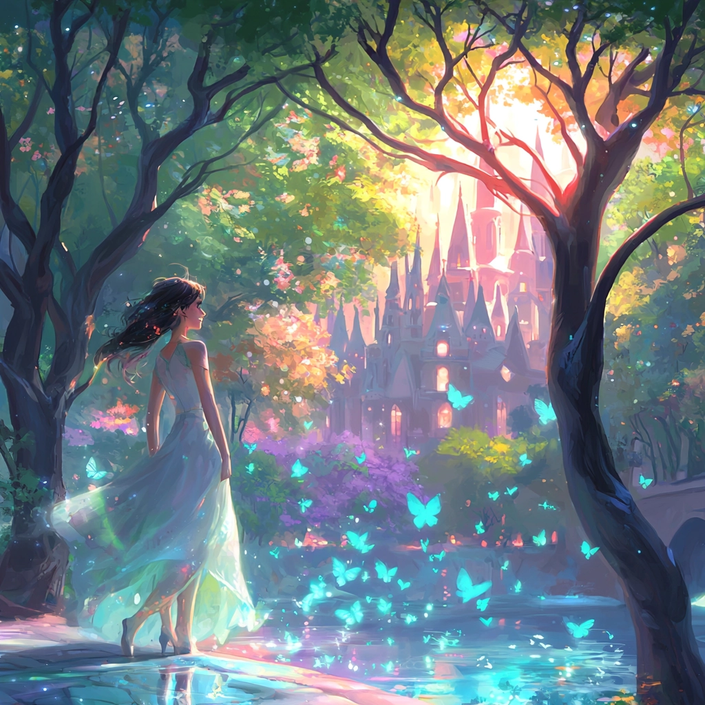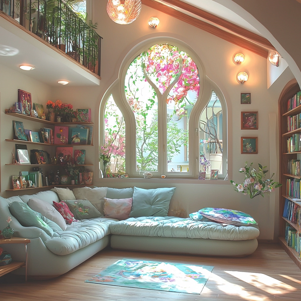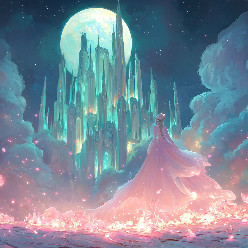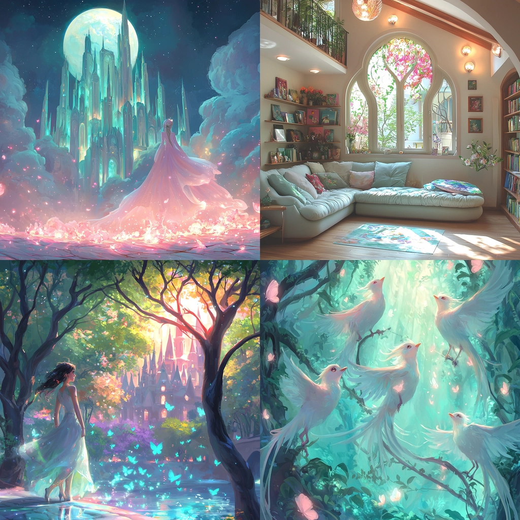 Lighting effects emphasize a dreamy, radiant quality, combining soft shadows with luminous highlights. The use of pastel shades imparts a gentle, soothing aura, and the spatial architecture enhances an immersive experience with delicate textural details.