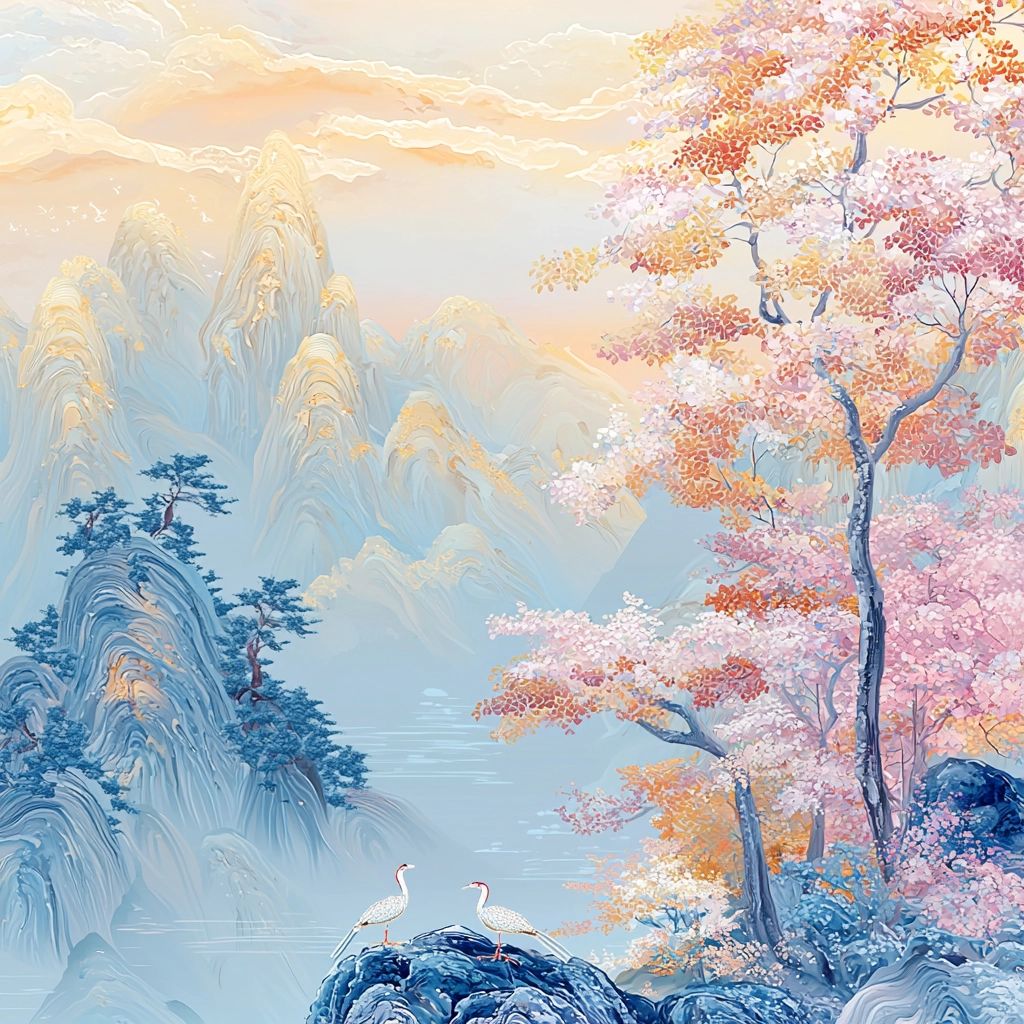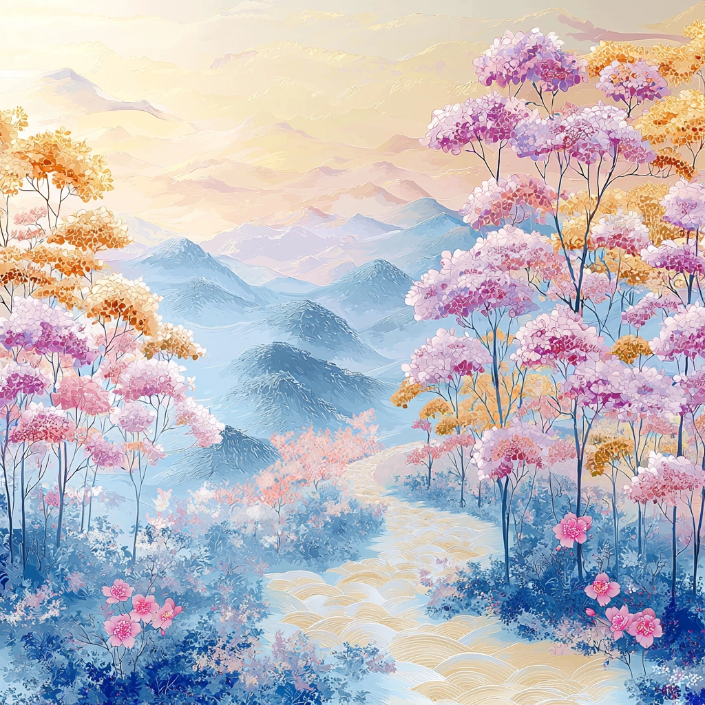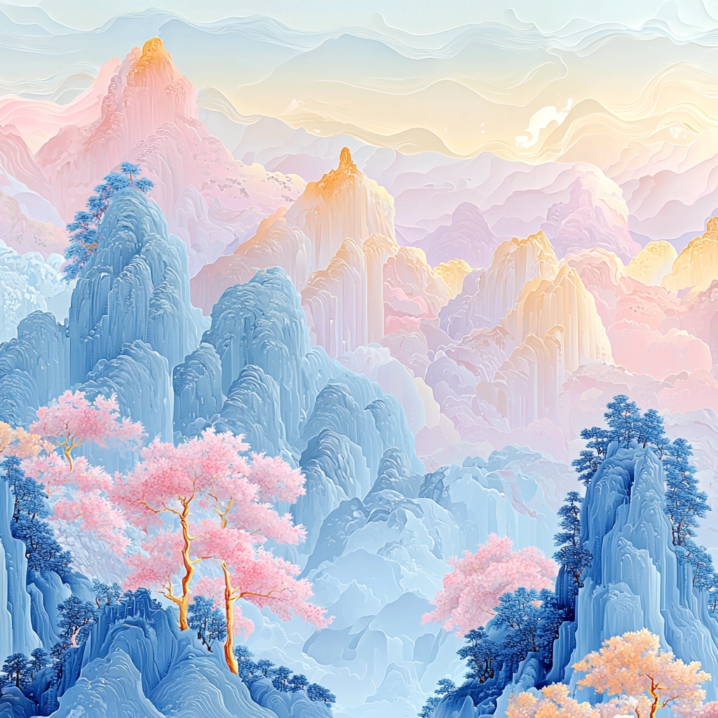 Soft pastel tones blend seamlessly, creating a unified, tranquil vista.