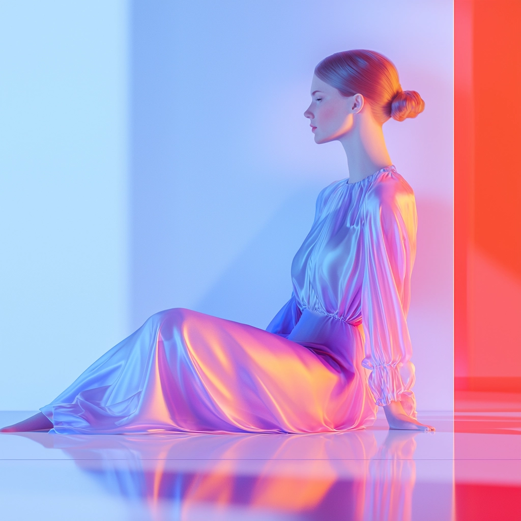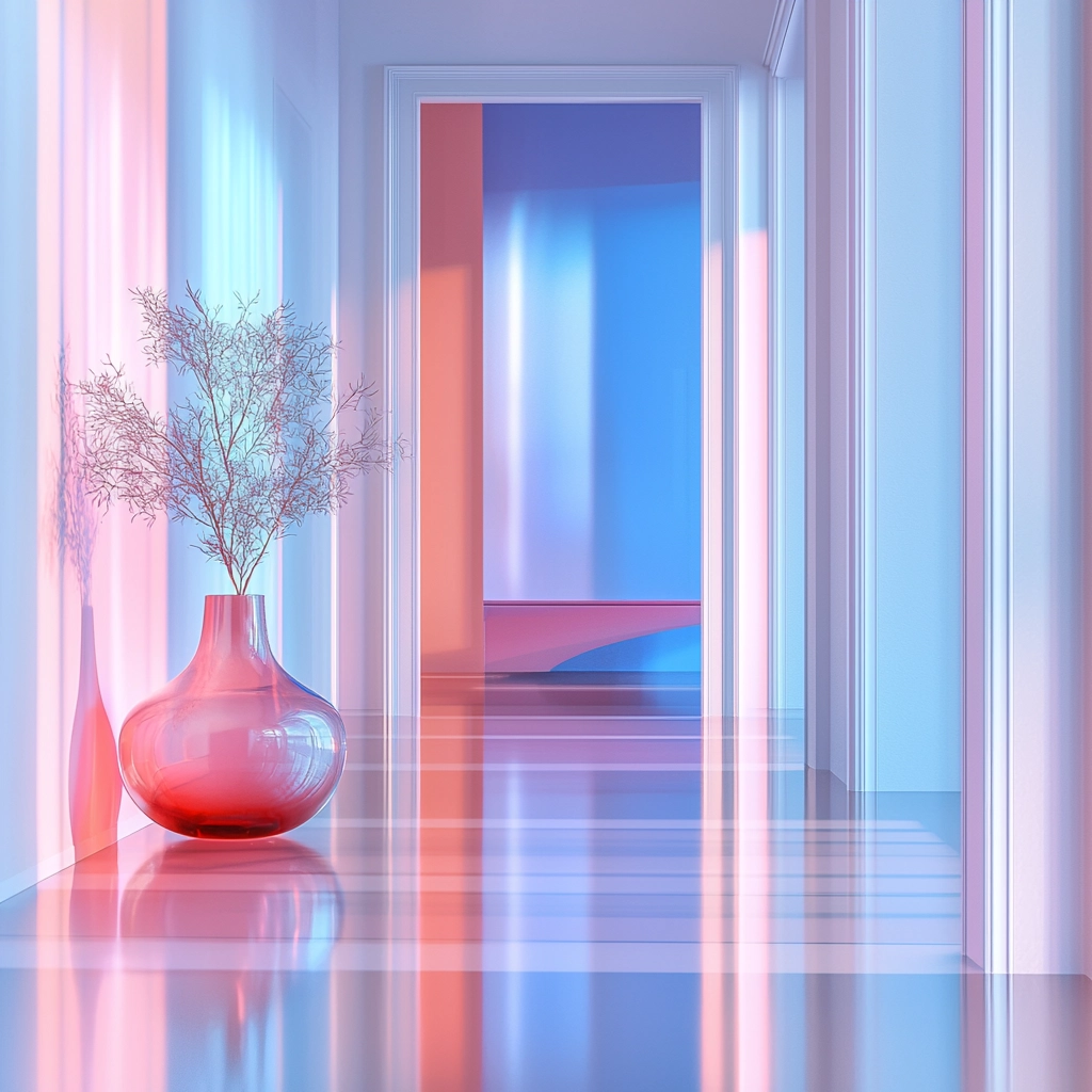 The use of soft, diffused lighting enhances the gentle pastel gradients, creating a luminous effect that gives the impression of depth and transparency. Smooth textures are emphasized by the reflective quality of the surfaces, adding a sleek, polished spatial sense.