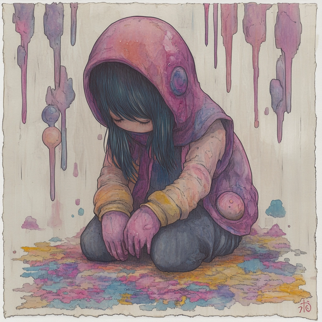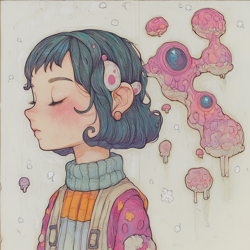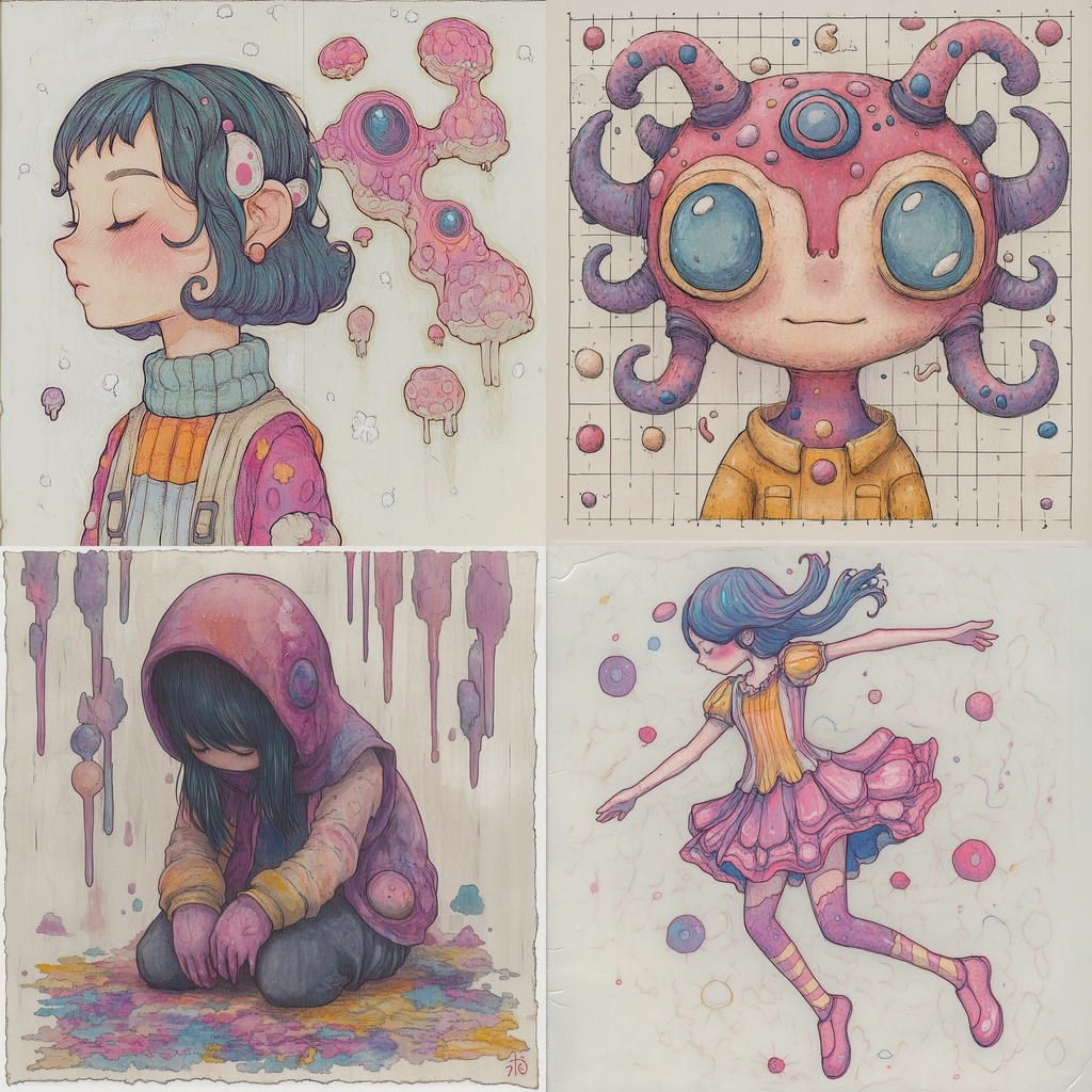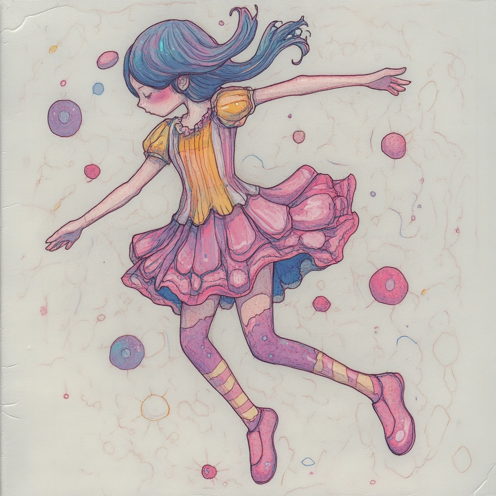 The lighting is subtle, enhancing the softness of pastel tones. Colors are gently blended, fashioning a delicate texture. Spatial arrangement is tight yet fluid, lending an imaginative quality. Surfaces are smooth with hints of gloss, indicating a playful style.