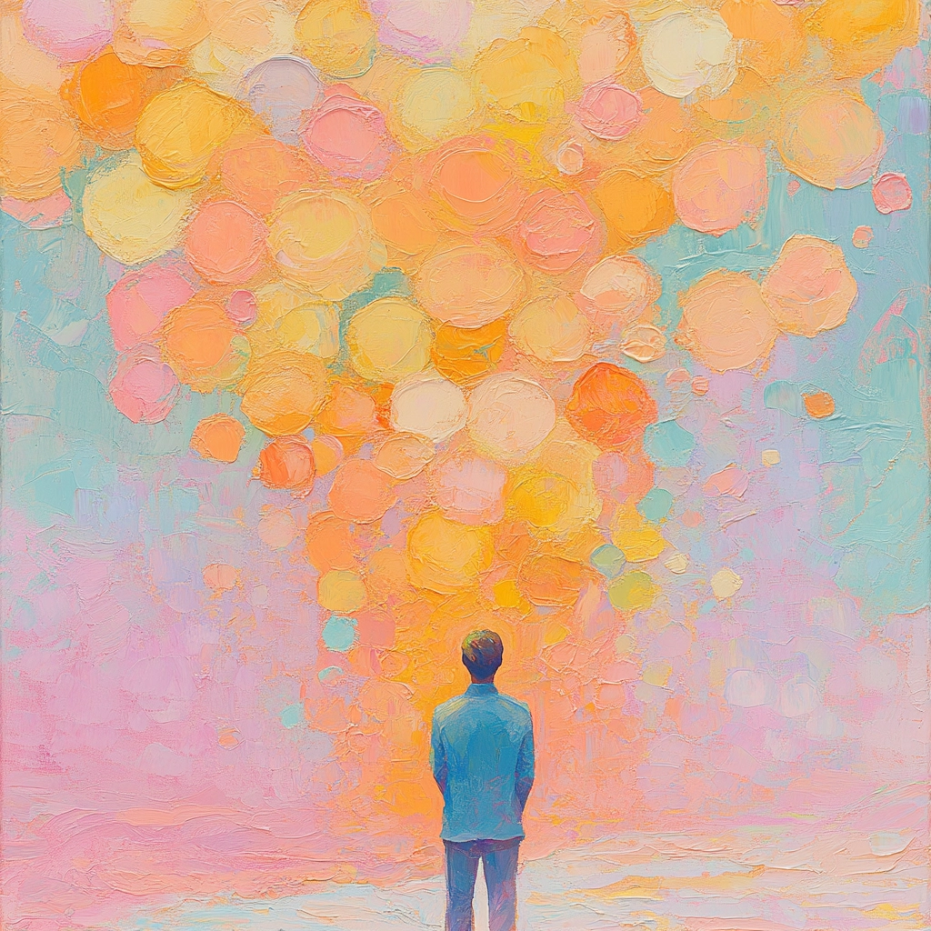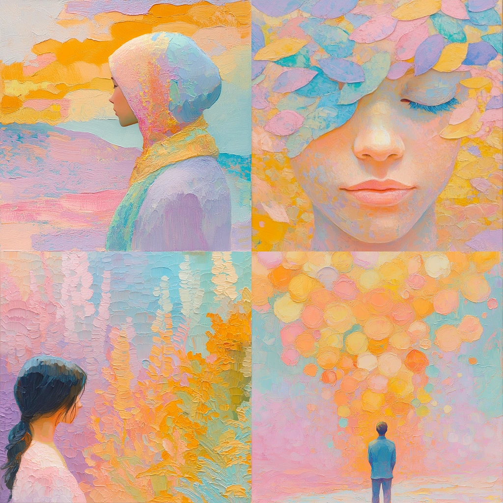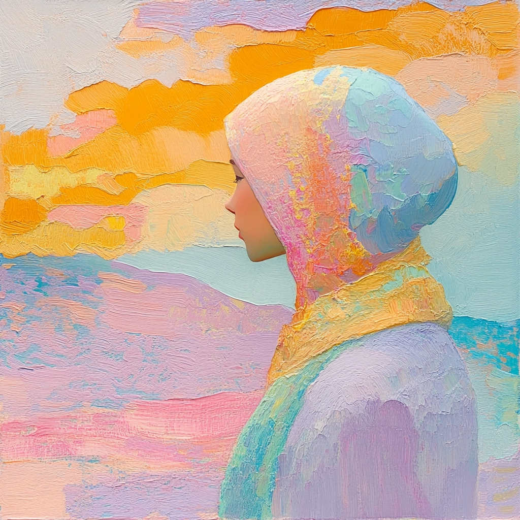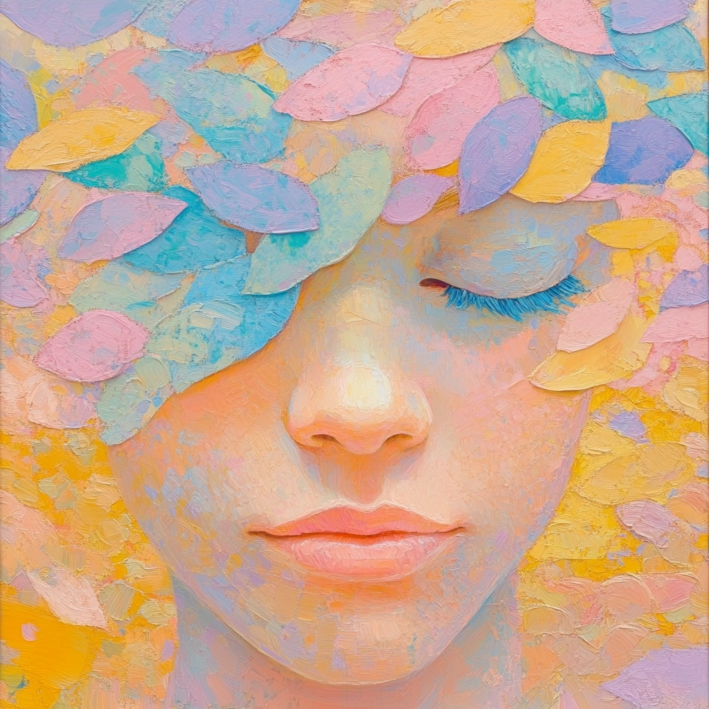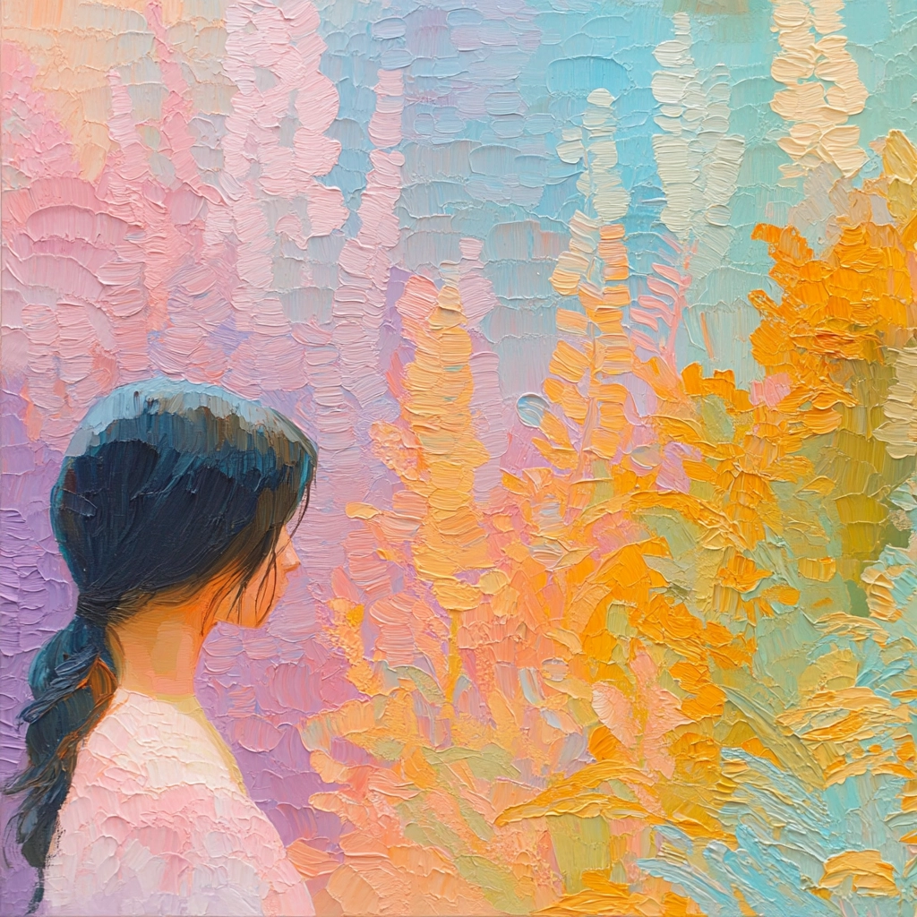 The use of soft, blended pastels creates a gentle effect. Thick, expressive brushstrokes layer to form a tactile, impressionistic surface. Light diffuses softly, giving a spacious atmosphere.