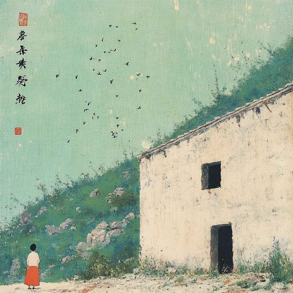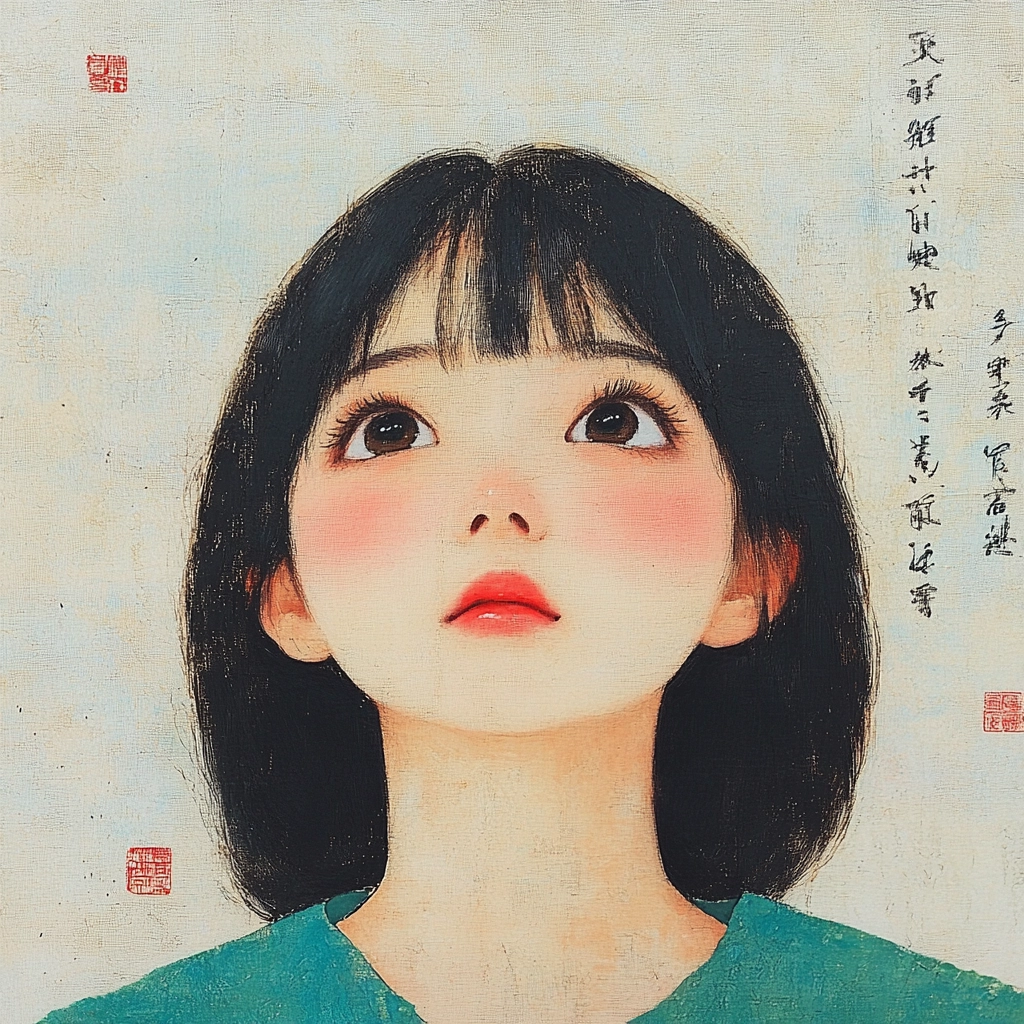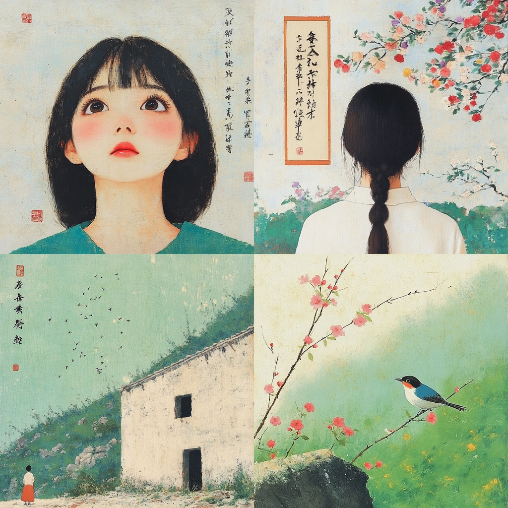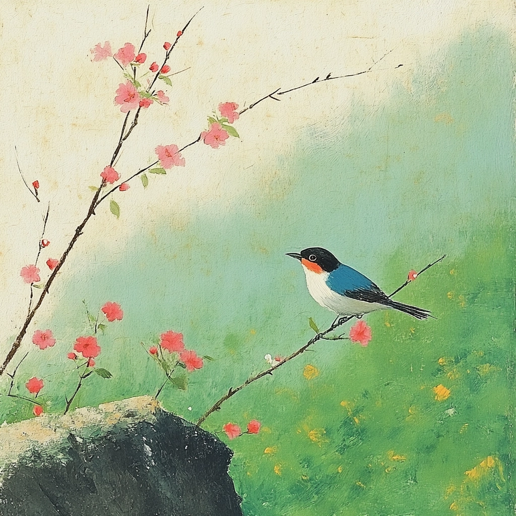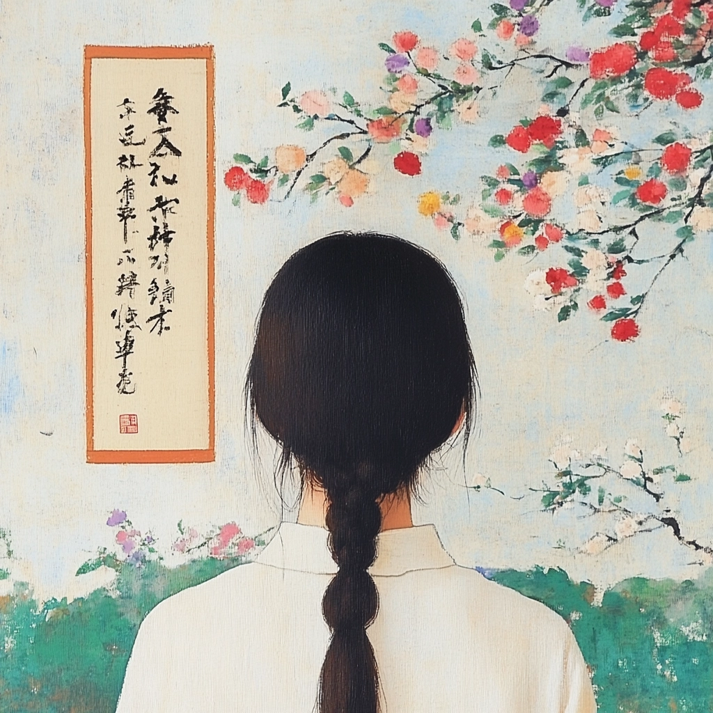 Soft hues with delicate composition, blending traditional and modern elements.