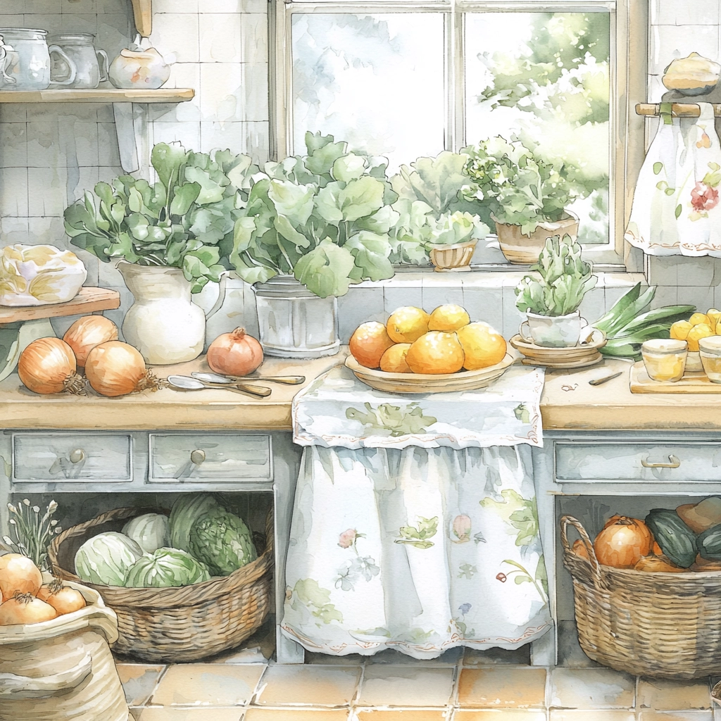 The lighting is diffused, softening shadows and emphasizing each color's gentleness. Greens and yellows intermingle with beige accents, creating a harmonious progression of tones. Subtle textures enhance spatial perception through natural variations.