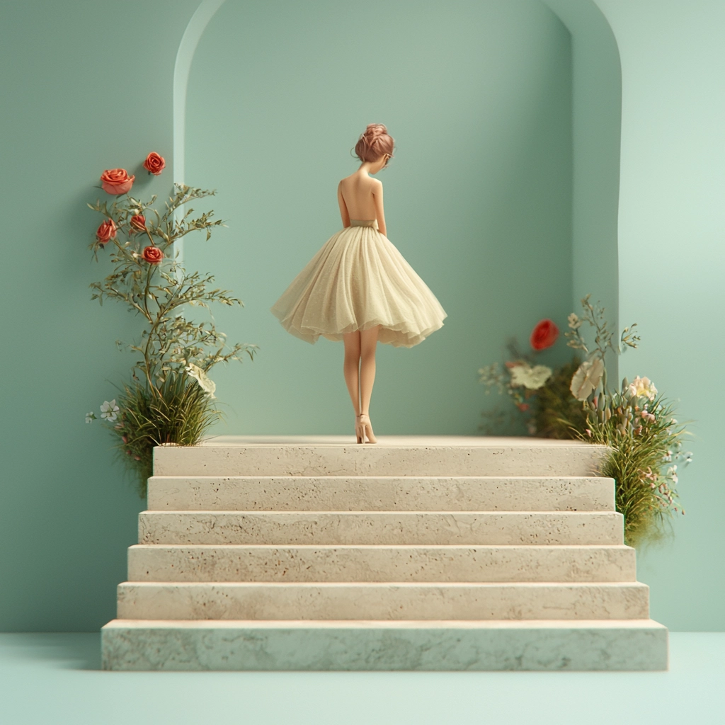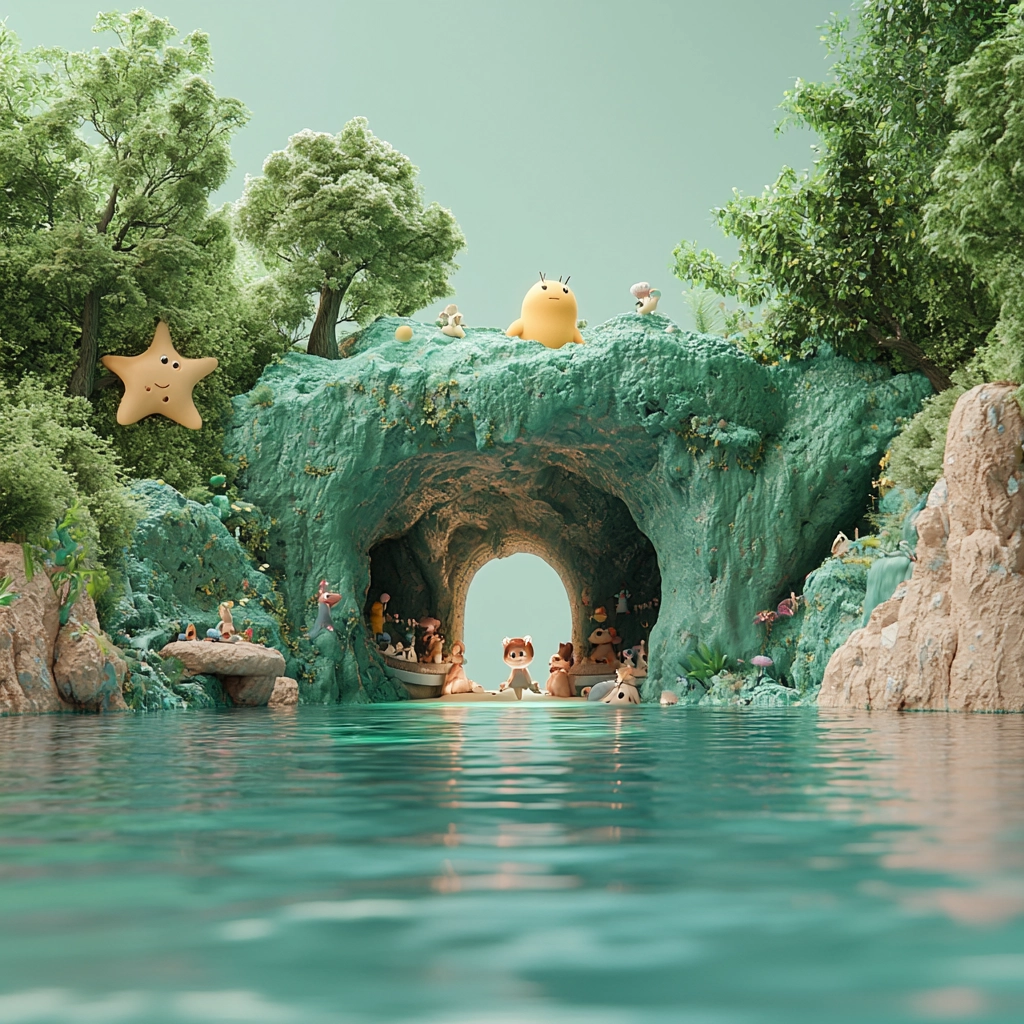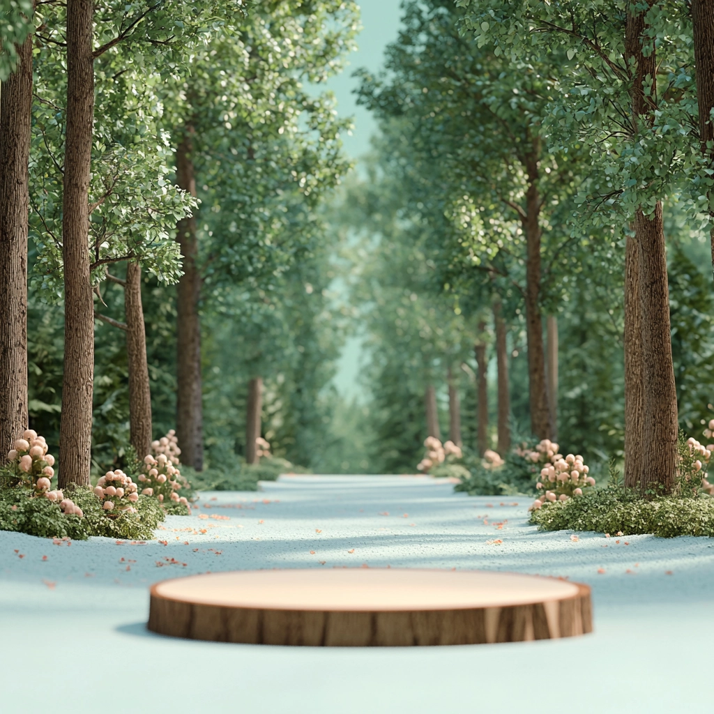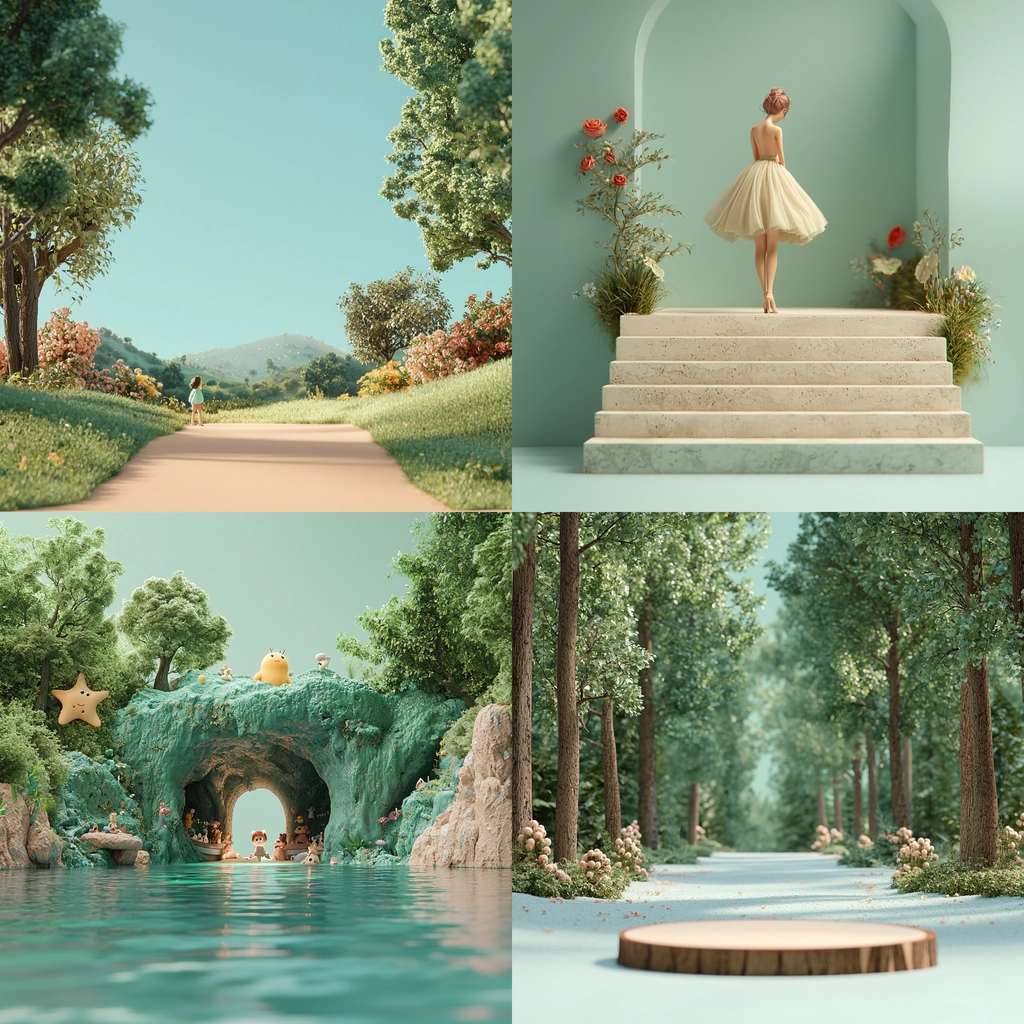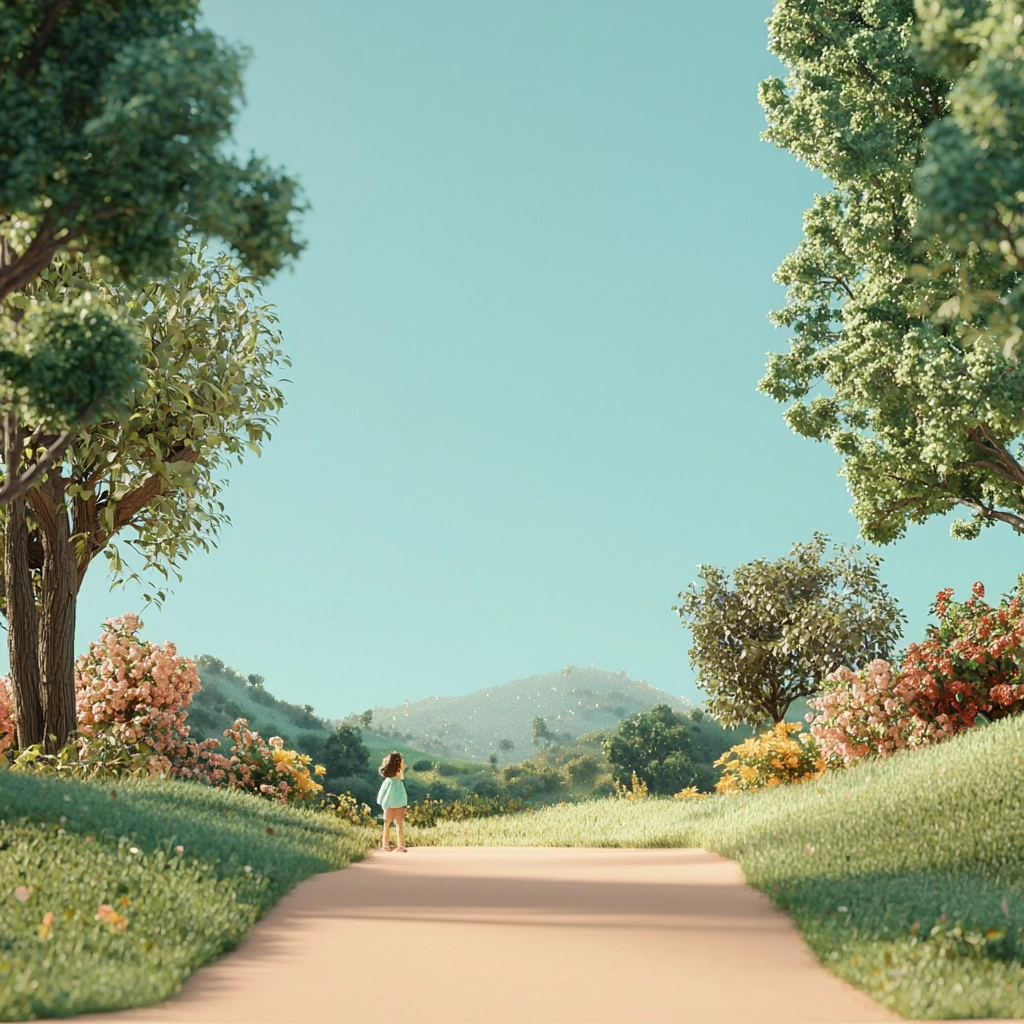Gentle lighting smoothens natural textures, creating a balanced sense of depth. Soft greens and sky blues dominate, with beige accents that highlight details. The perspective leads the viewer's eye into an inviting scene with a serene palette.