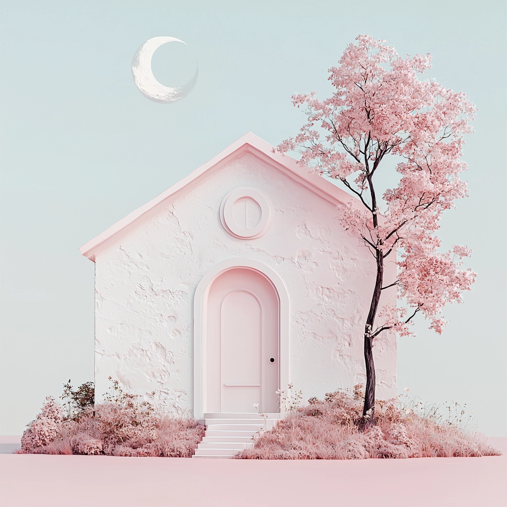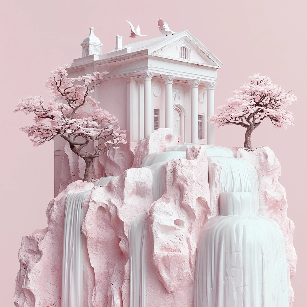 The lighting emphasizes a smooth texture and pastel pink tones, generating a serene spatial sense. The subtle gradations of white and gray within the composition enhance both depth and clarity, presenting a distinct, yet harmonious scene.