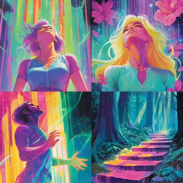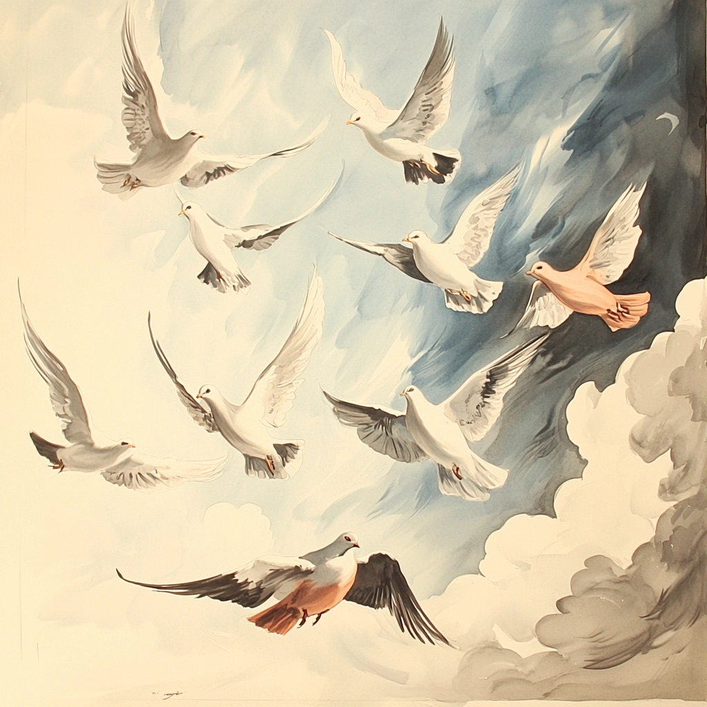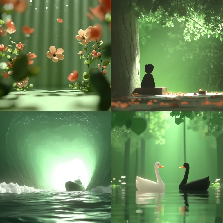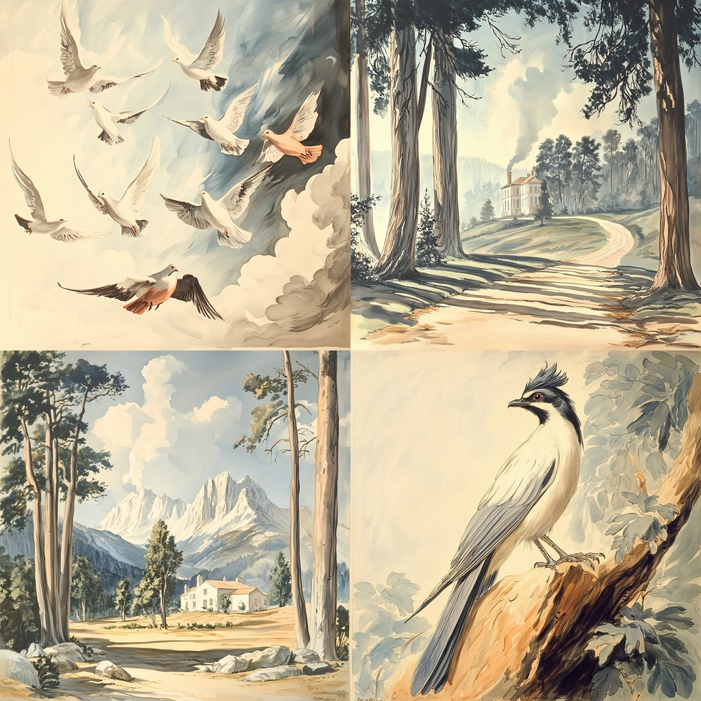 The lighting is soft and evenly spread across each scene, enhancing the gentle, pastel-like colors, primarily blues and beiges. The spatial arrangement allows for immersive depth, with textures carefully rendered to evoke a tactile sense of the depicted elements.