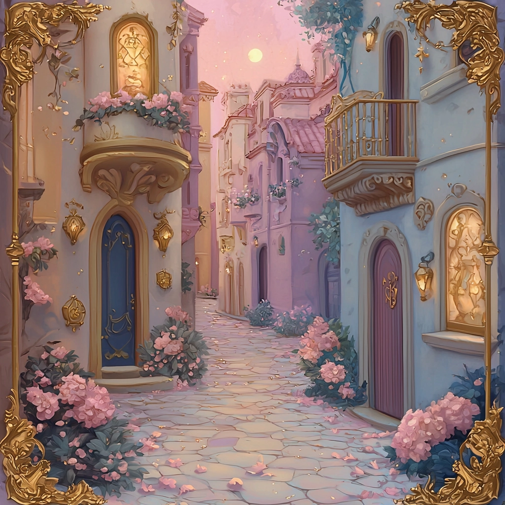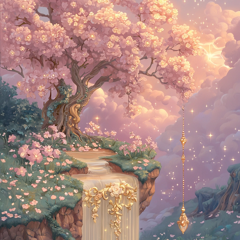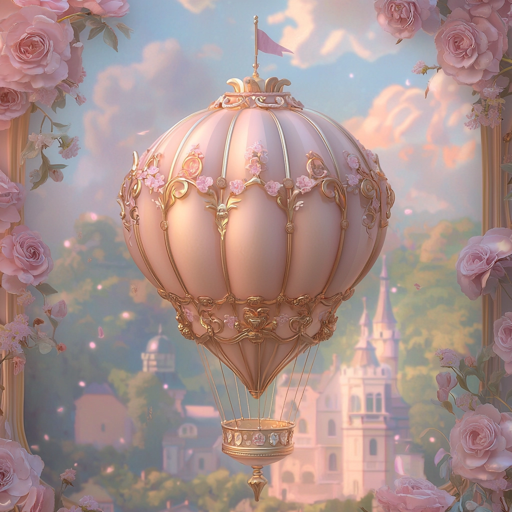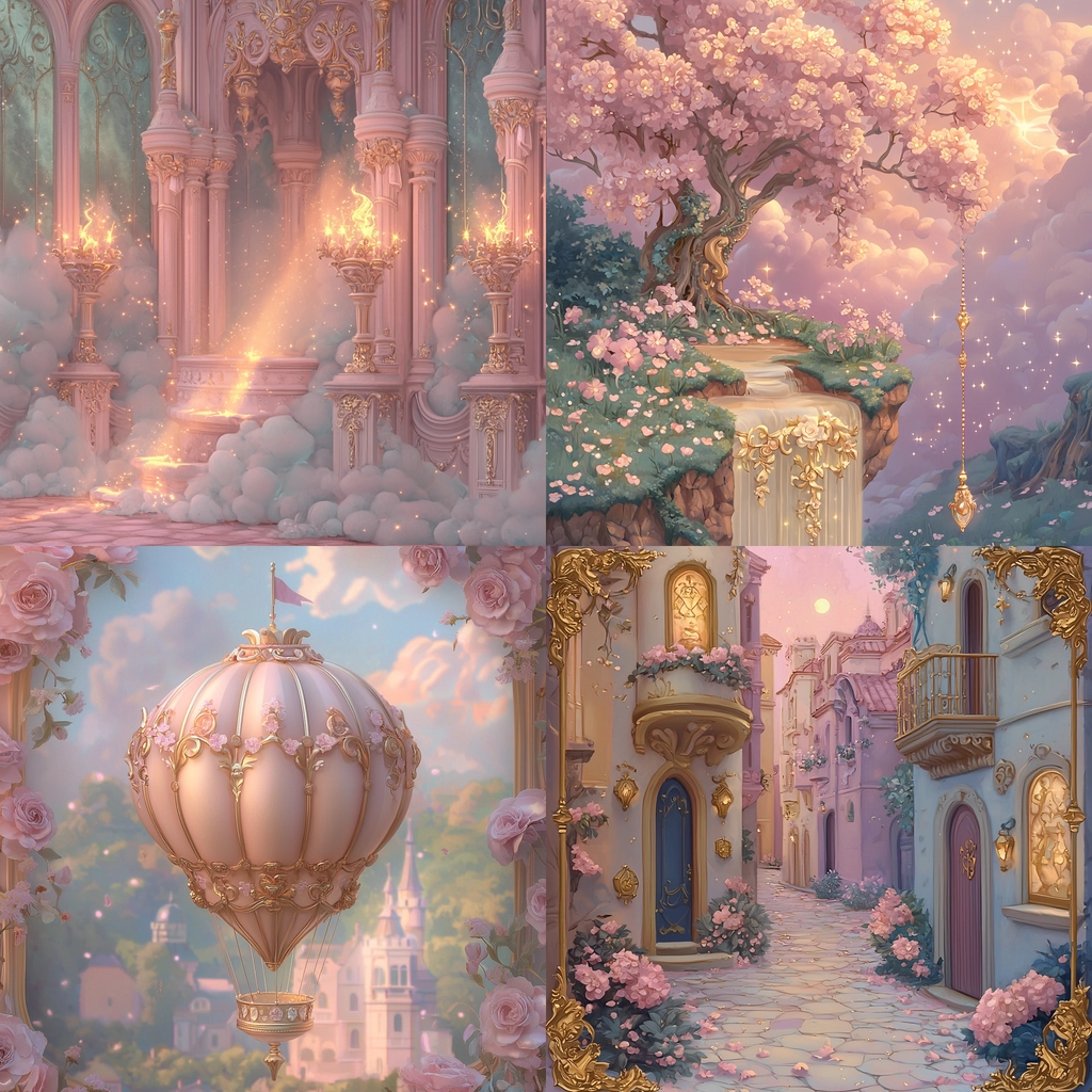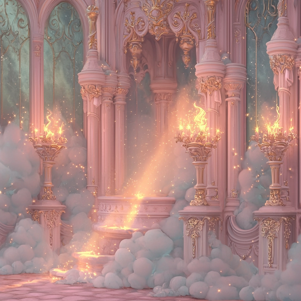 The lighting effects are radiant yet subtle, emphasizing the pastel color palette with luminous highlights. Textures appear embellished with gentle, intricate details, creating a spatial depth that feels gracefully expansive and ornate.