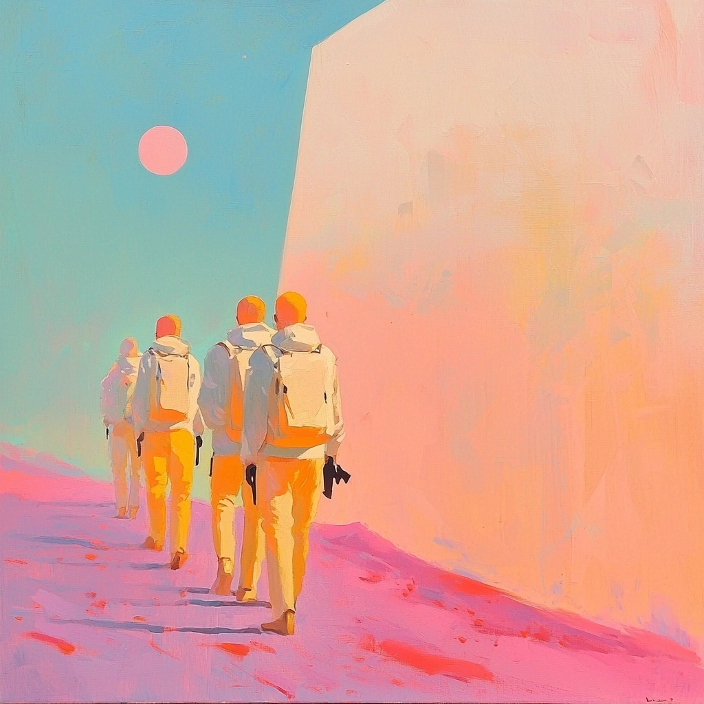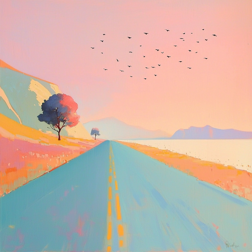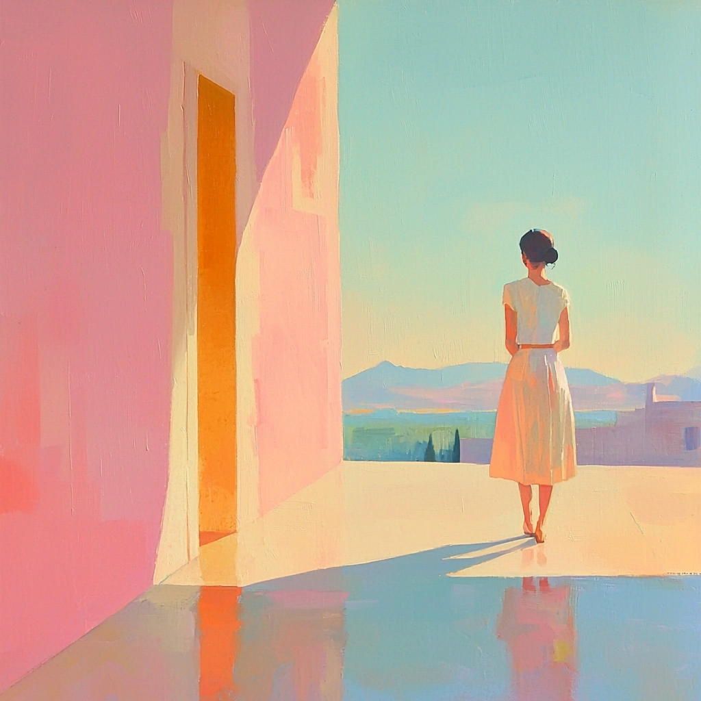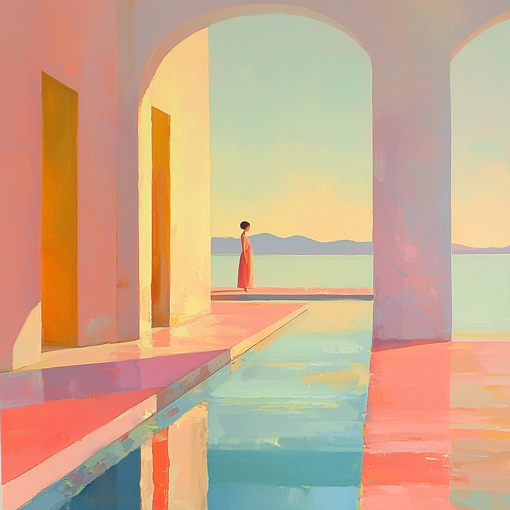 Refined use of light creates sharp contrasts that highlight geometric structure, while pastel colors elicit clarity across spatial expanses. Subtle textures generated by brush strokes bring depth to vivid surfaces as light plays over them.