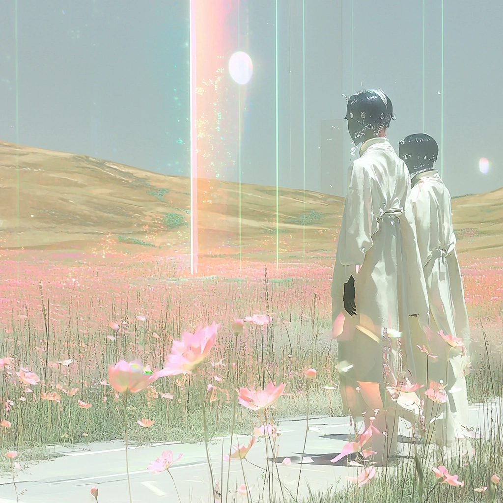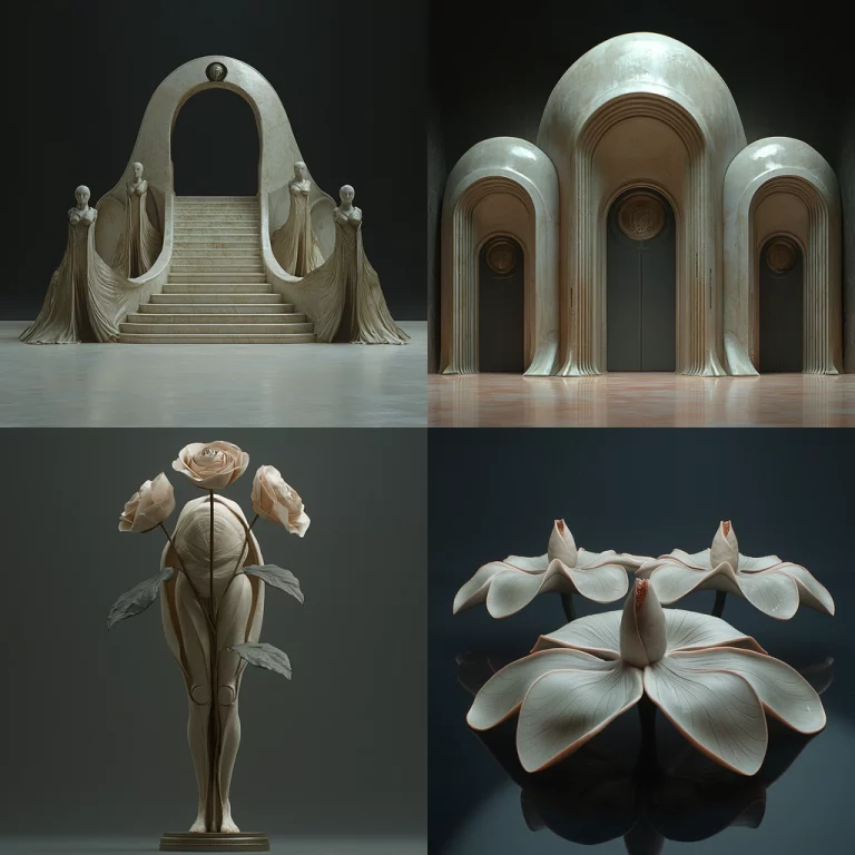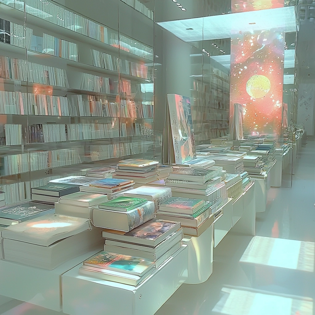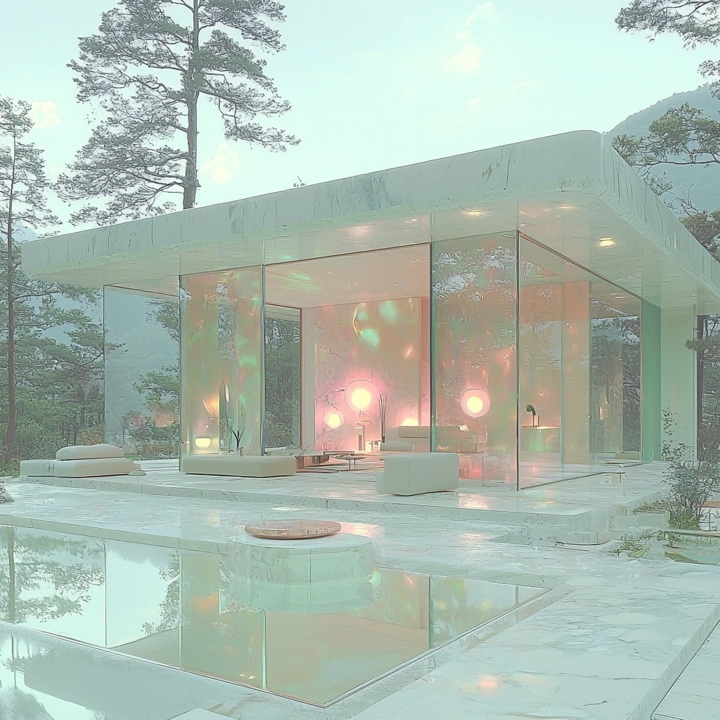 Soft pastel hues with reflective surfaces and soft lighting give a modern polished aesthetic.
