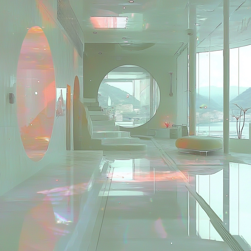 Lighting enhances each surface's reflective quality, creating a clean aesthetic. Pastel colors add warmth, complementing the open, transparent spaces. Smooth textures dominate, where light subtly shifts across surfaces, emphasizing a serene fluidity.