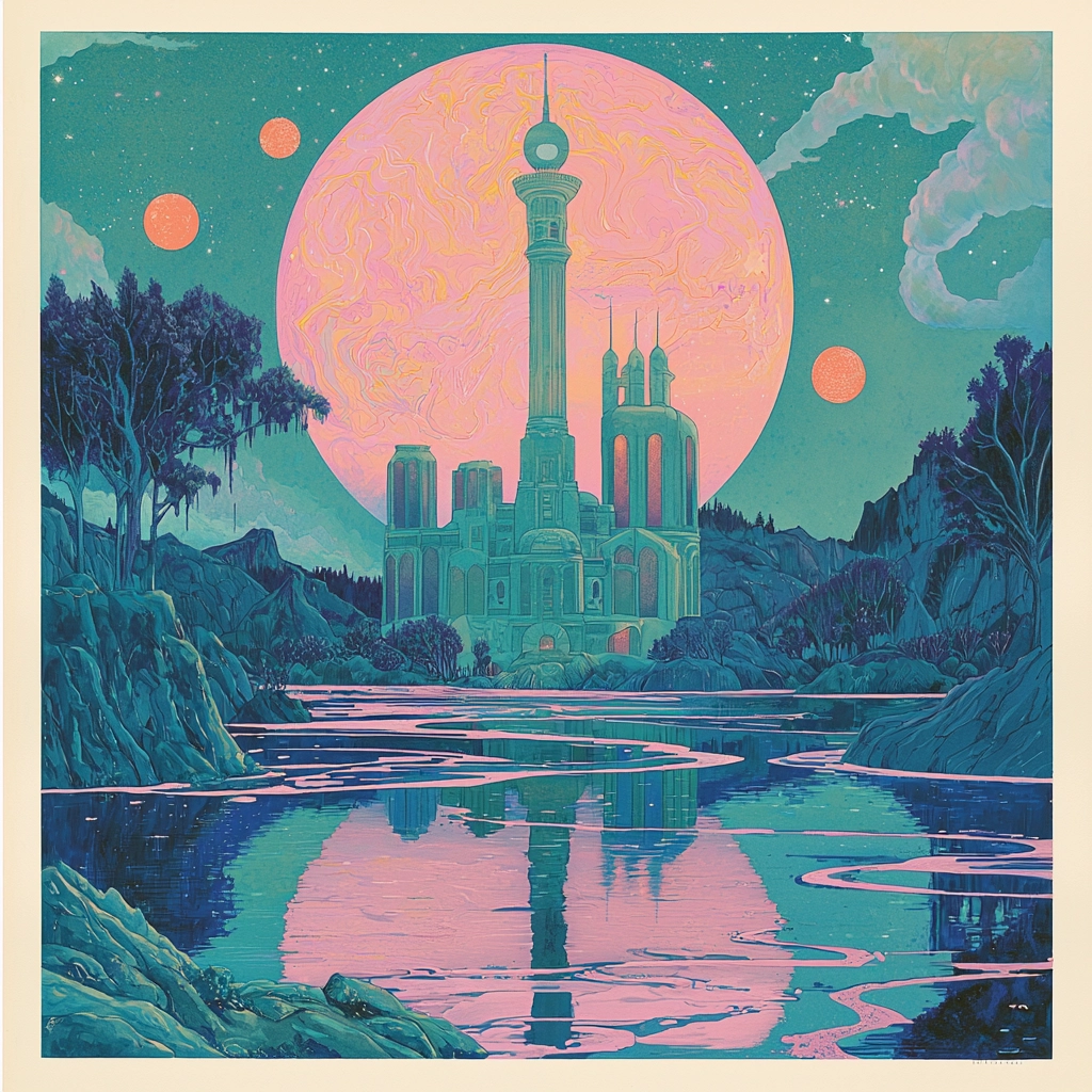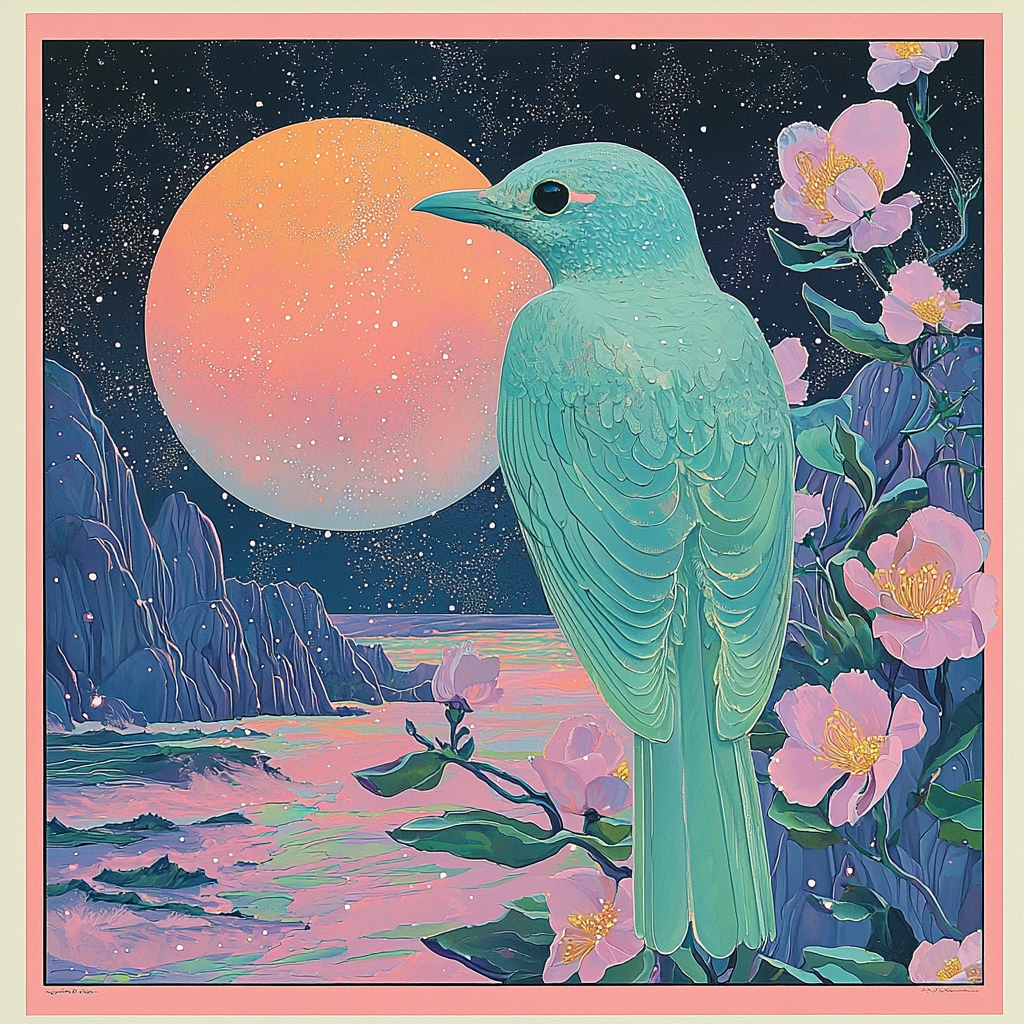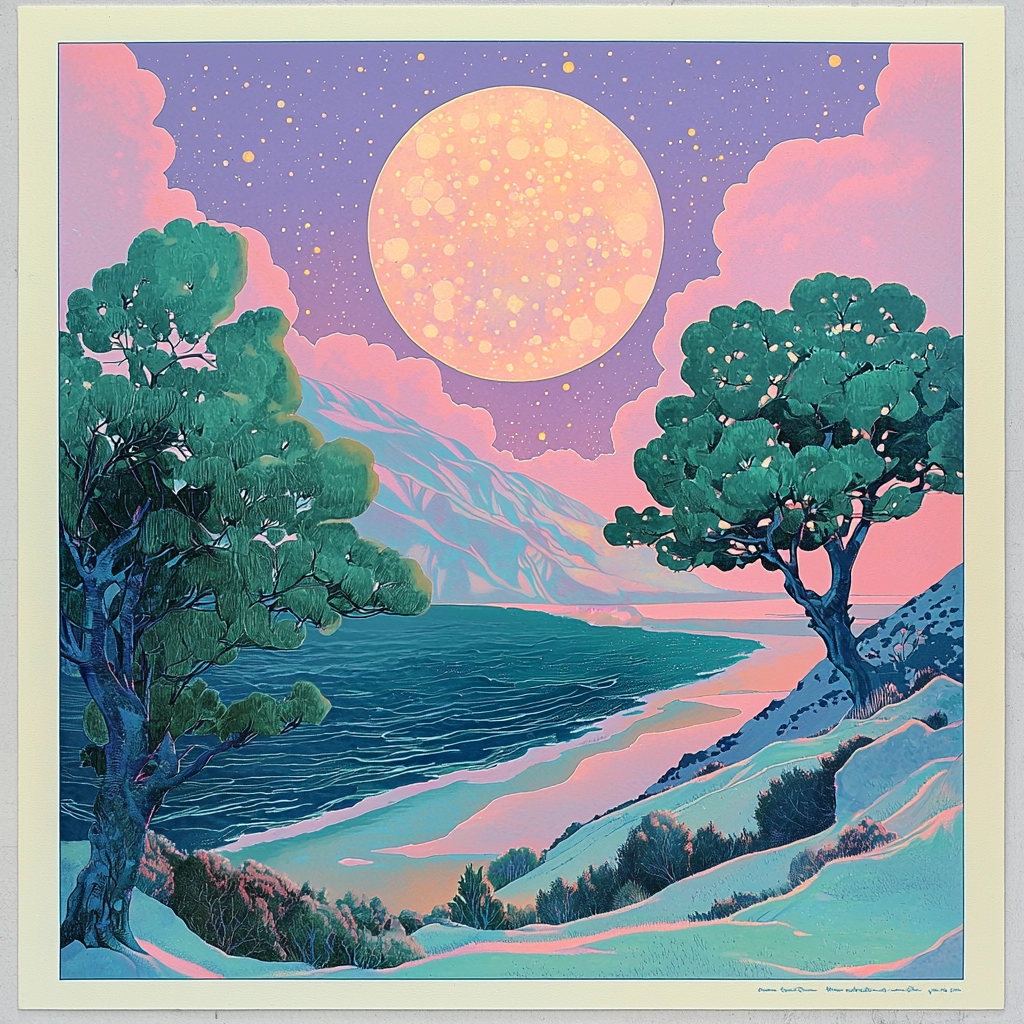 Soft luminous tones contrast against darker hues, enhancing depth.
