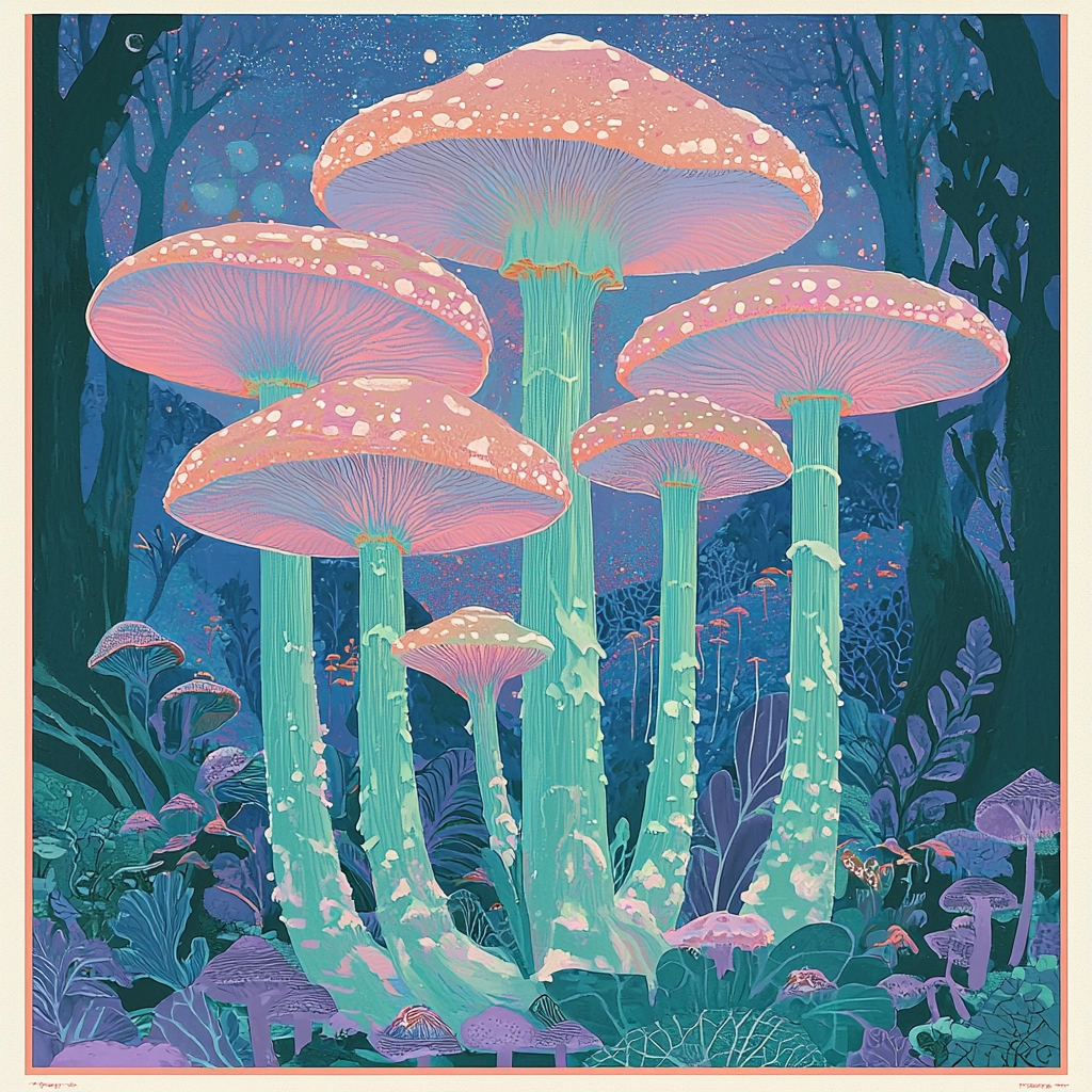 The lighting casts a gentle glow on the shades of pink and blue, creating a dreamlike contrast with darker backgrounds. The composition uses delicate lines and smooth color transitions, imparting a sense of depth and texture in a serene yet intricate setting.